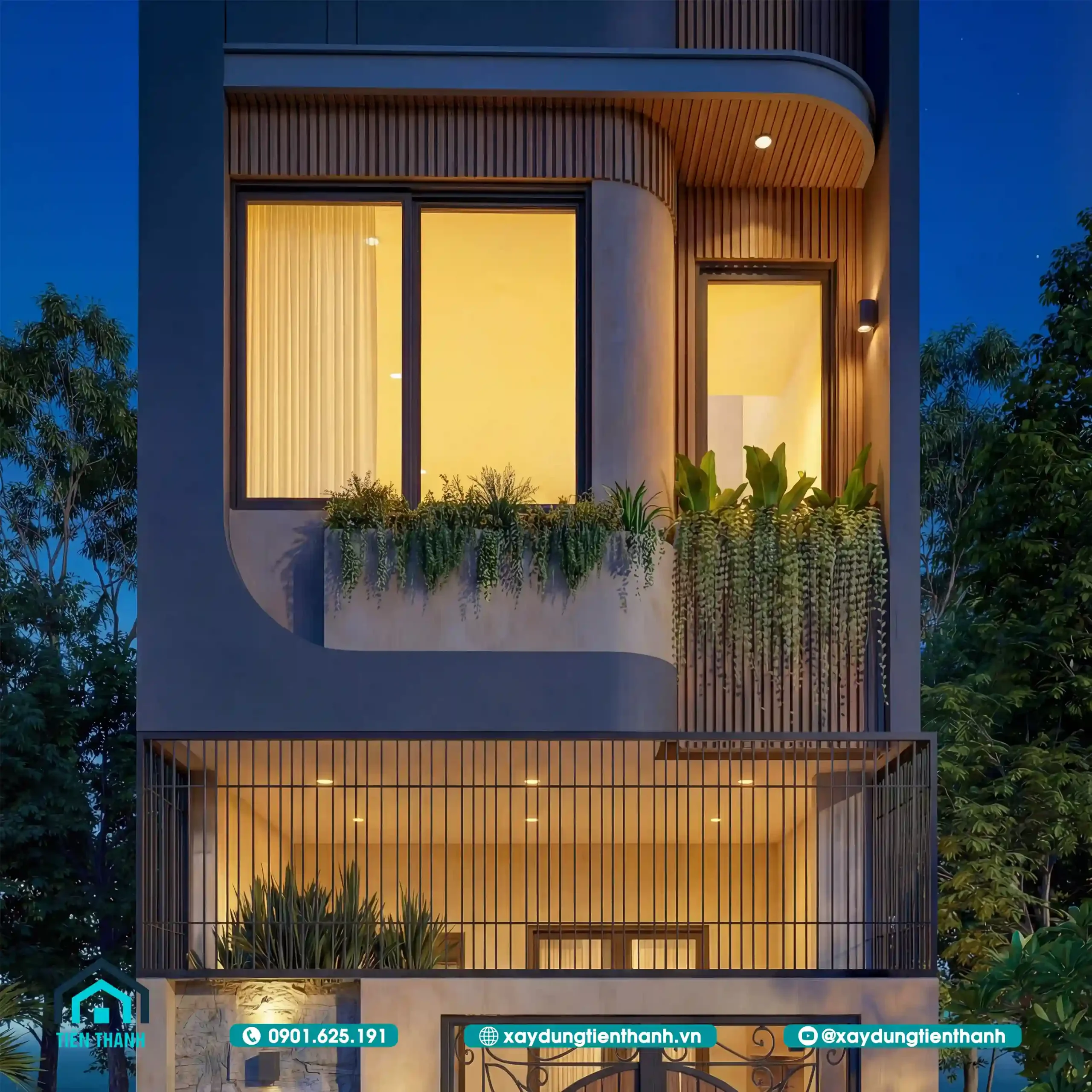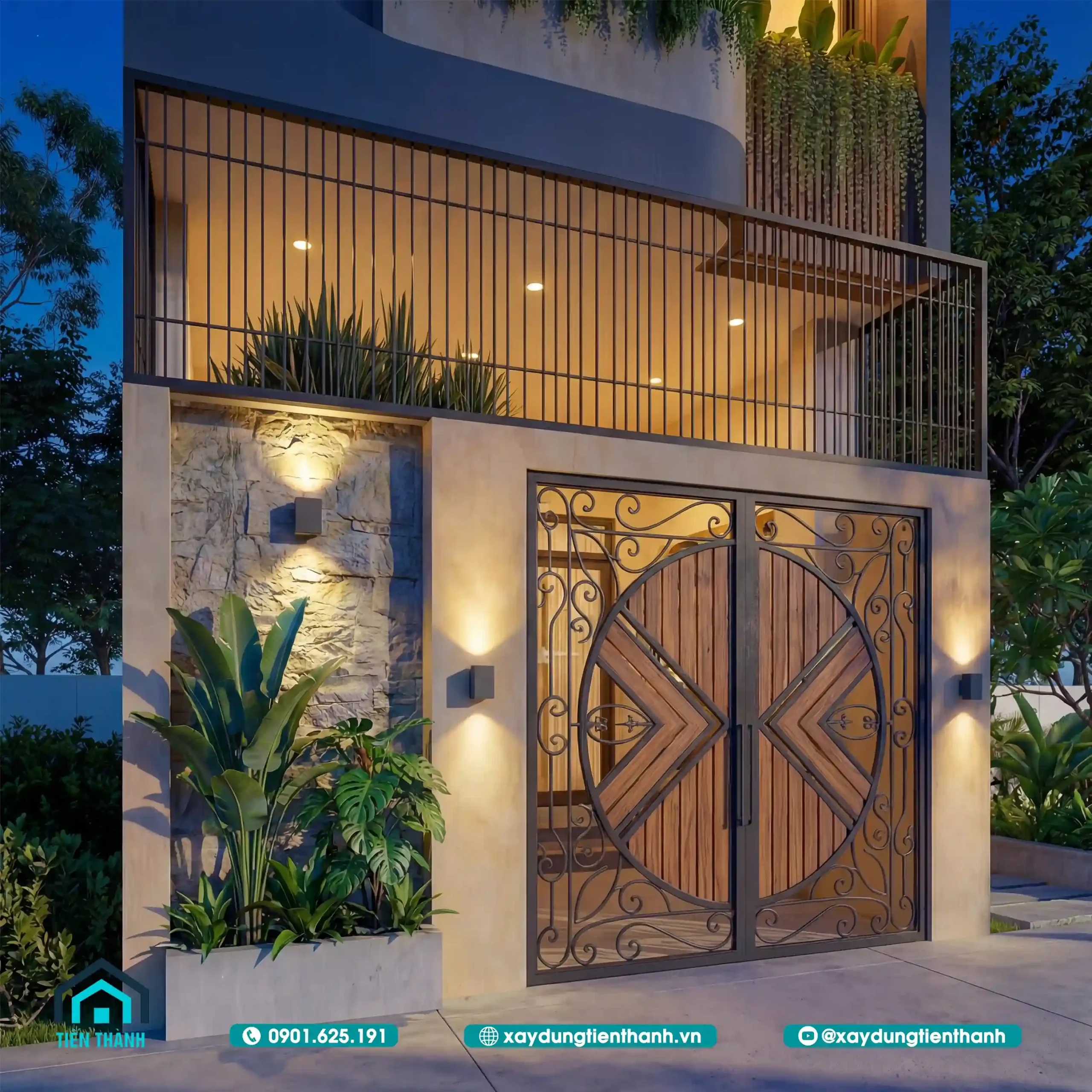 Khi màn đêm buông xuống, ngôi nhà lột xác trở thành một tác phẩm nghệ thuật ánh sáng. Hệ thống đèn LED âm trần tại ban công và đèn hắt tường tại cổng chính tạo ra những mảng sáng tối có chiều sâu. Ánh sáng vàng ấm (3000K) thường được ưu tiên để tạo cảm giác gần gũi, sang trọng và thư giãn.