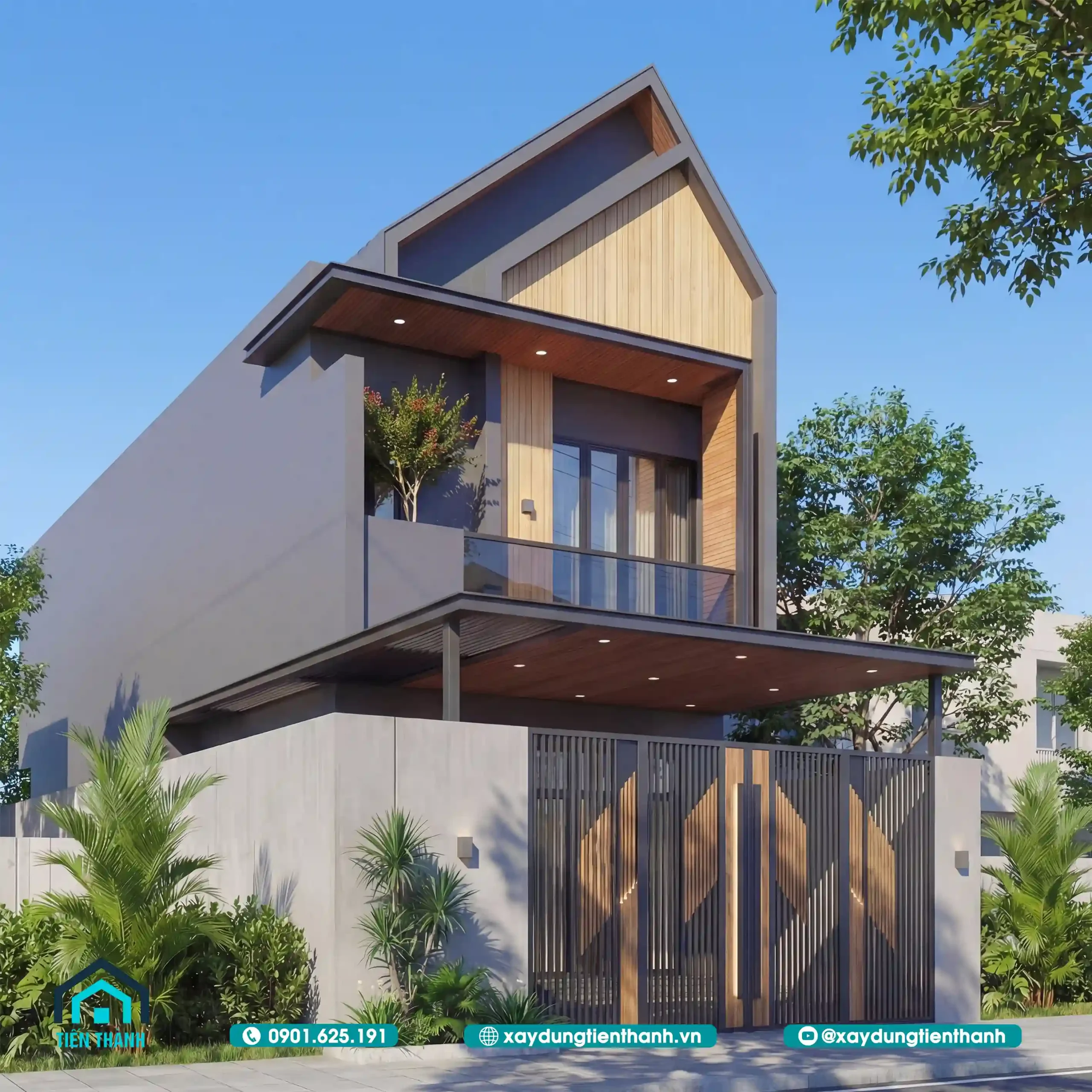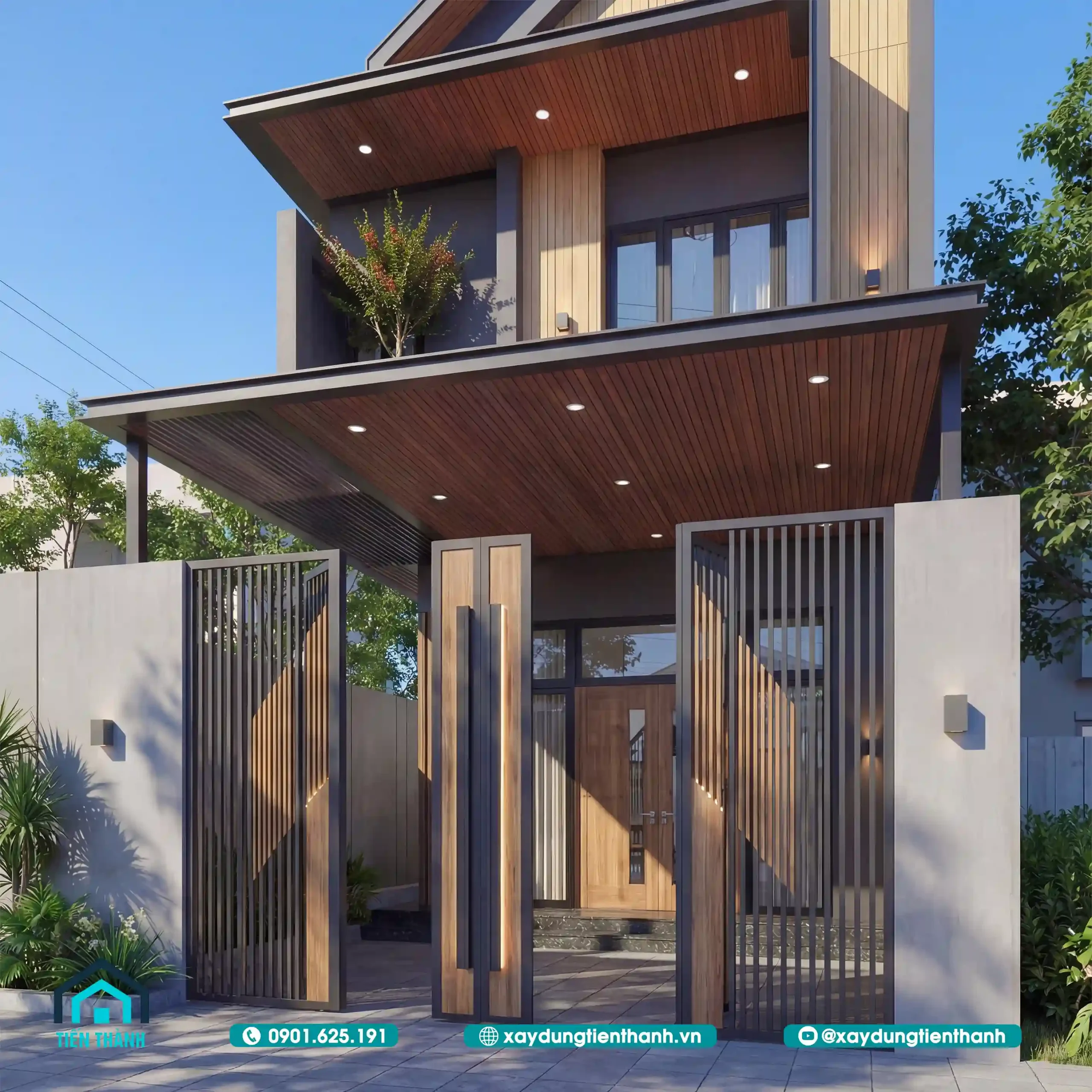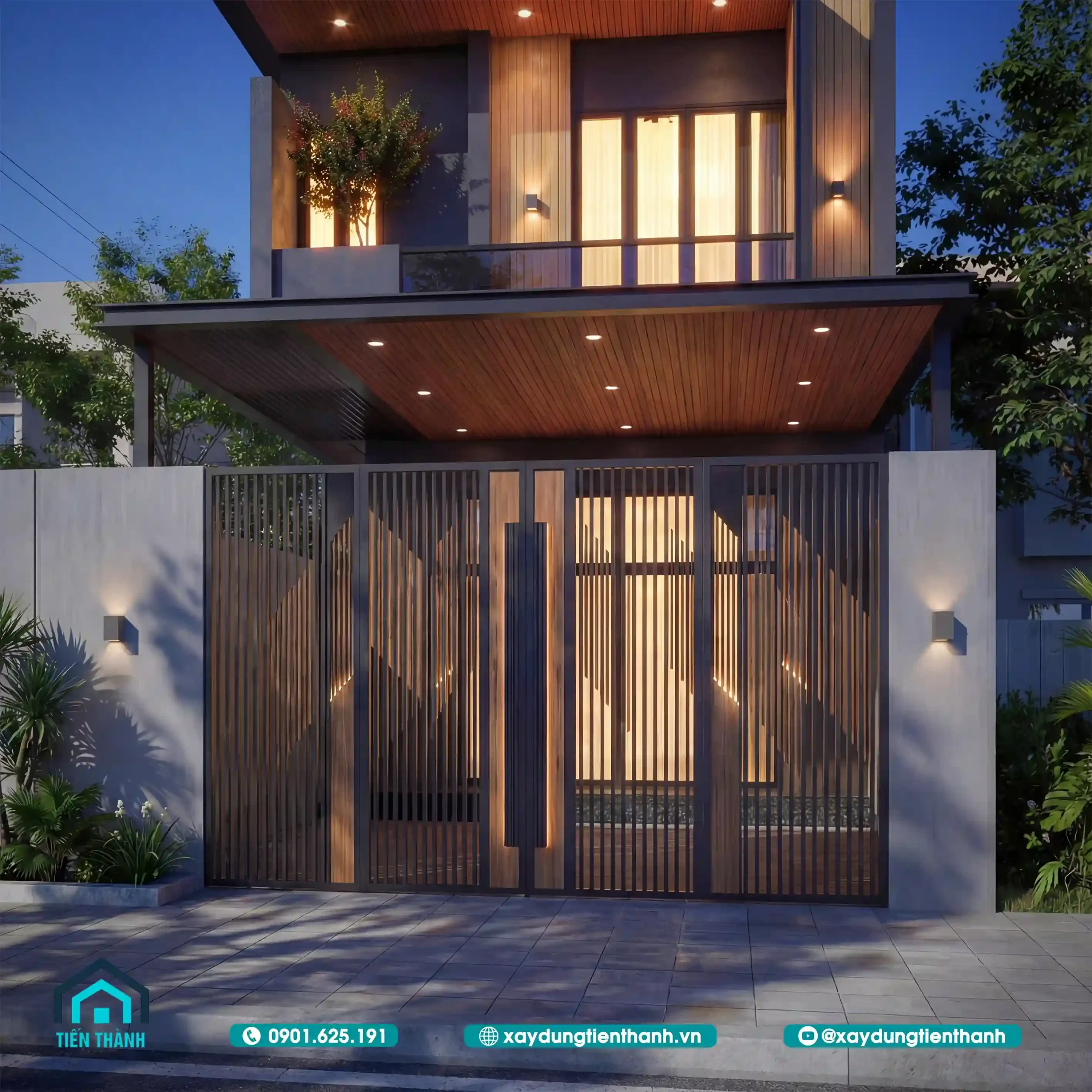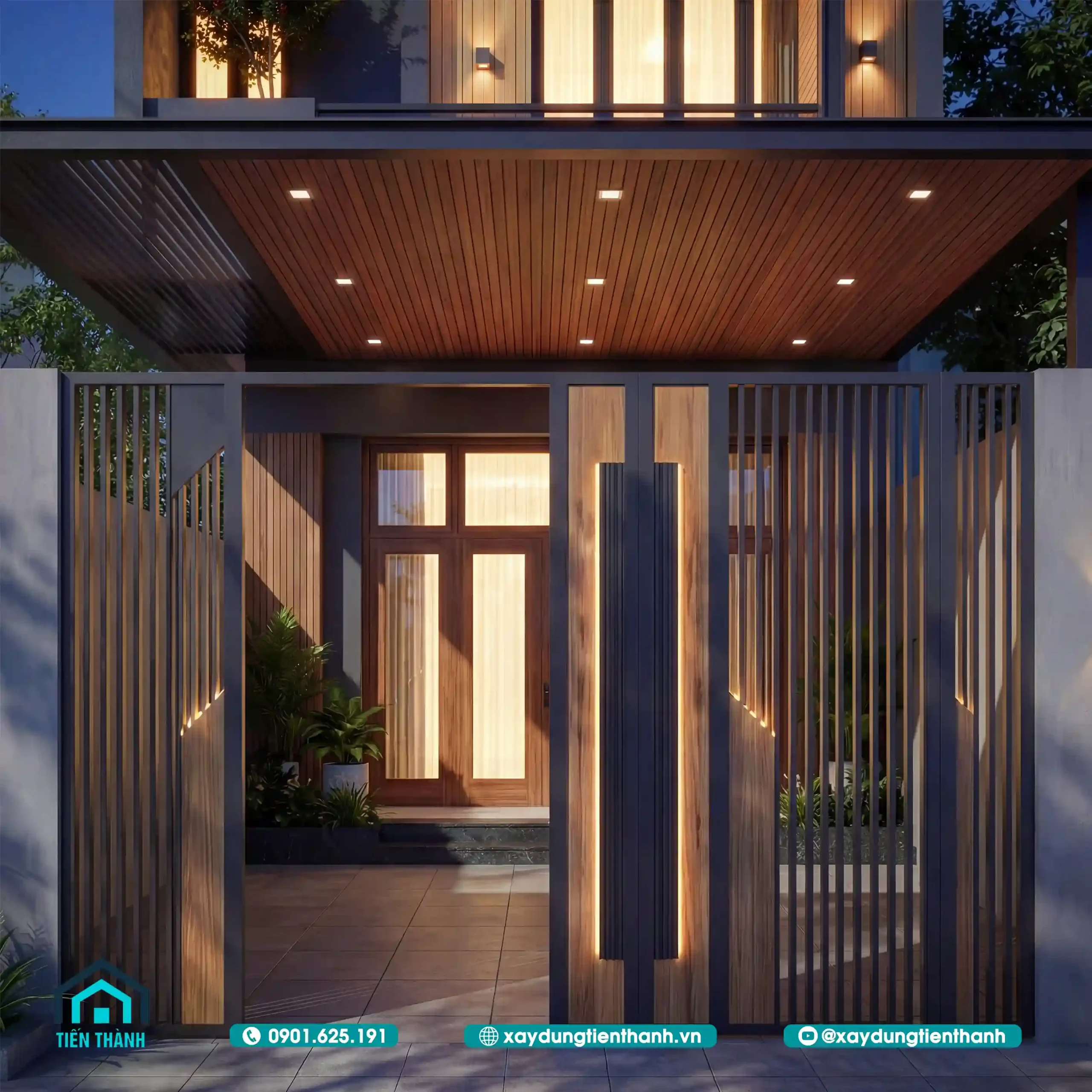 Trong mẫu thiết kế này, hệ cổng được đồng bộ hóa với vật liệu gỗ ốp trên mặt tiền lầu 1. Sự lặp lại của các đường kẻ dọc tạo nên một nhịp điệu kiến trúc thống nhất từ dưới lên trên. Đặc biệt, việc tích hợp đèn LED thanh dọc trên cánh cổng không chỉ là điểm nhấn thẩm mỹ mà còn tăng cường an ninh, giúp quan sát rõ khu vực trước nhà vào ban đêm.