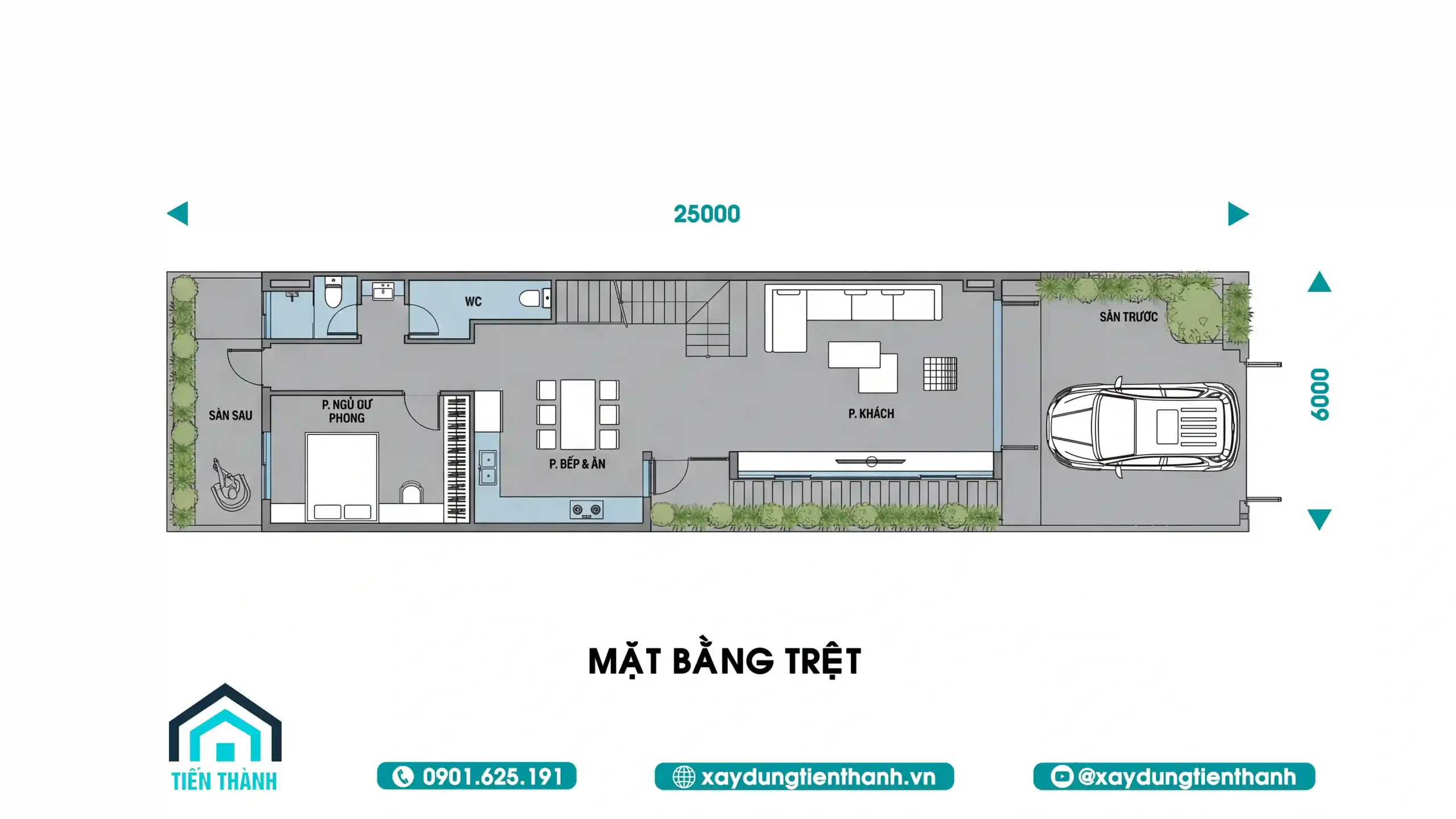 Để một mẫu nhà 2 tầng mặt tiền 6m hiện đại thực sự đáng sống, việc bố trí công năng mặt bằng phải cực kỳ khoa học. Với tổng chiều dài lên đến 25m, tầng trệt được chia thành các phân khu chức năng rõ rệt nhưng vẫn đảm bảo sự thông thoáng.