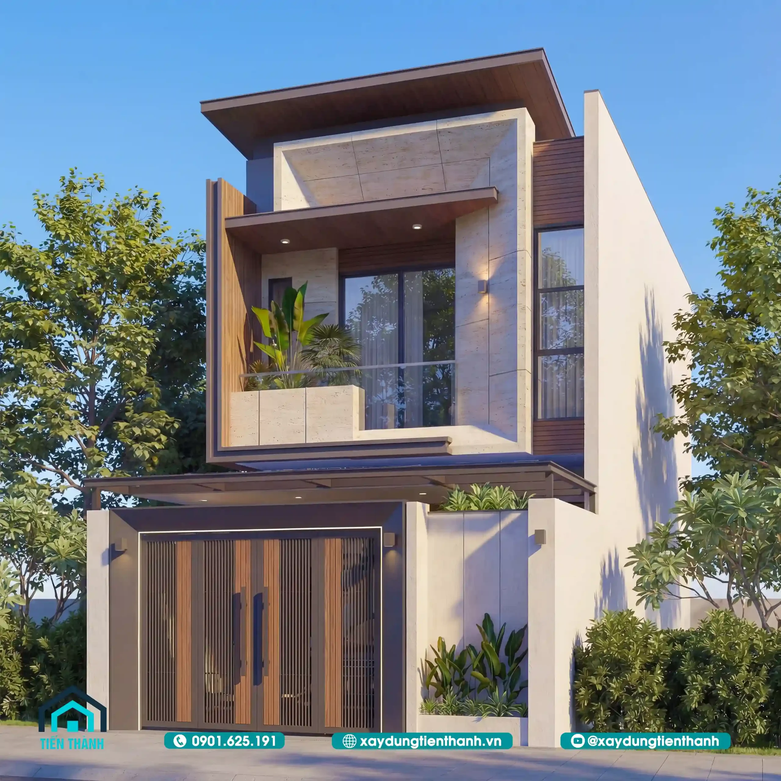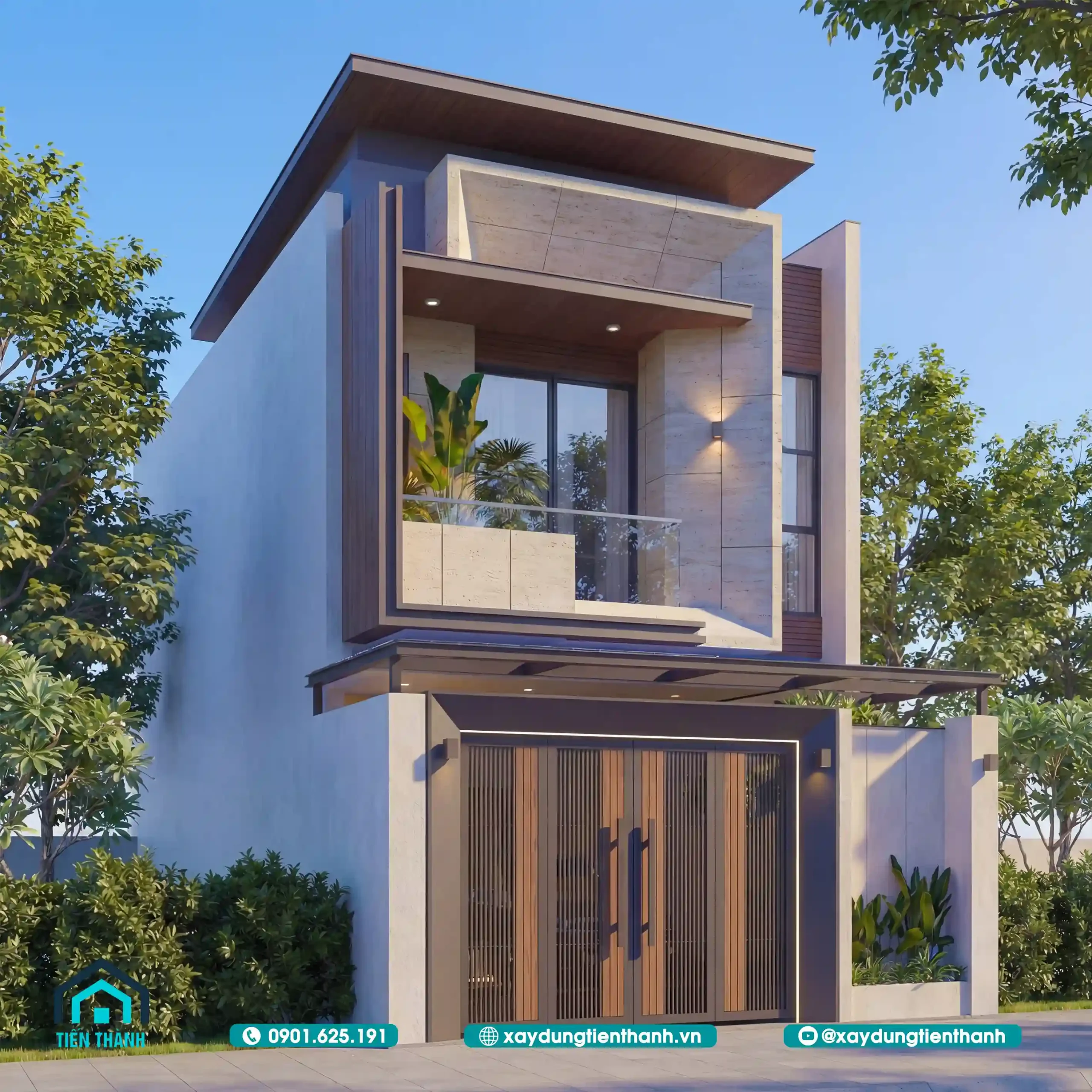 Góc nhìn từ dưới lên thể hiện sự bề thế của kiến trúc nhà phố 2 tầng hiện đại.