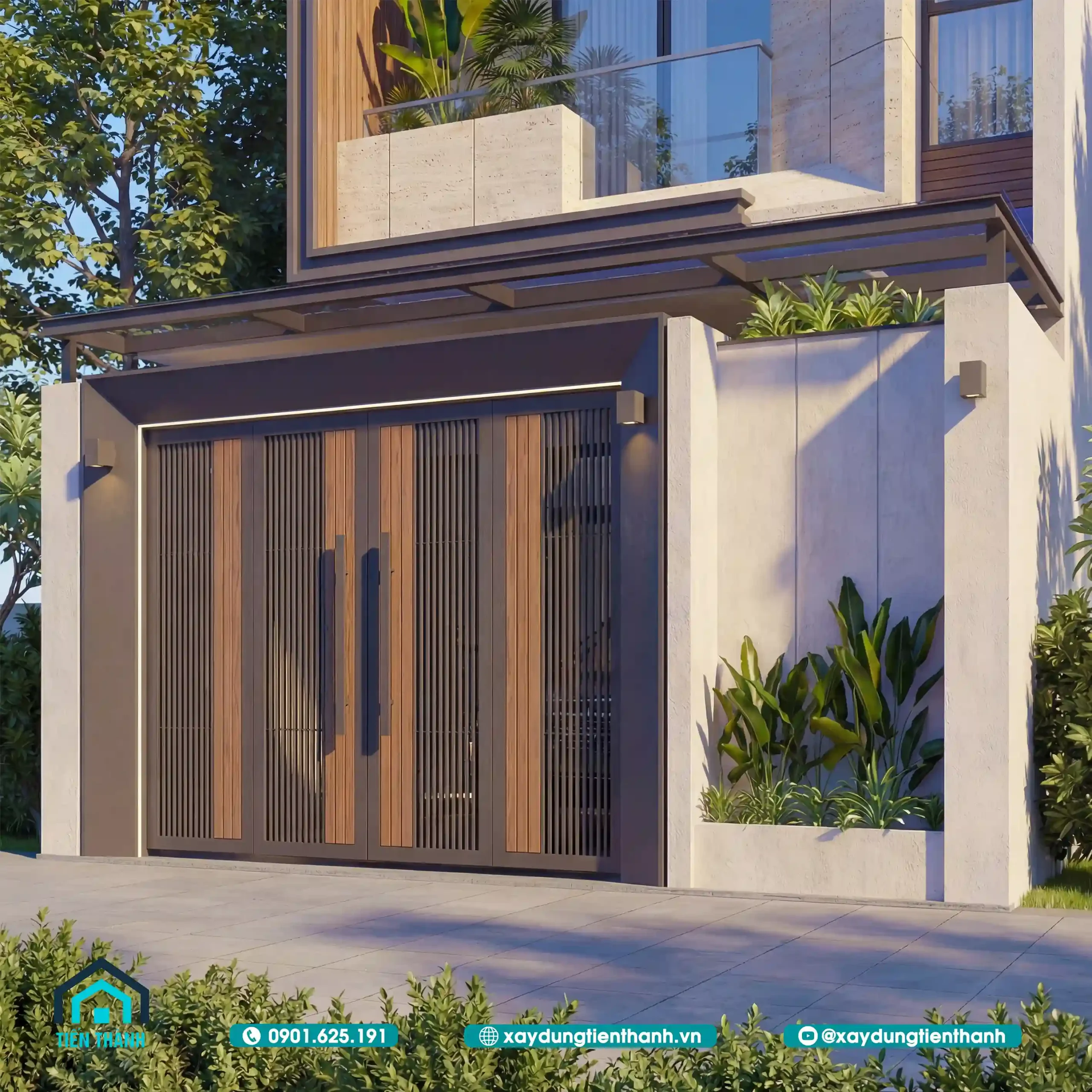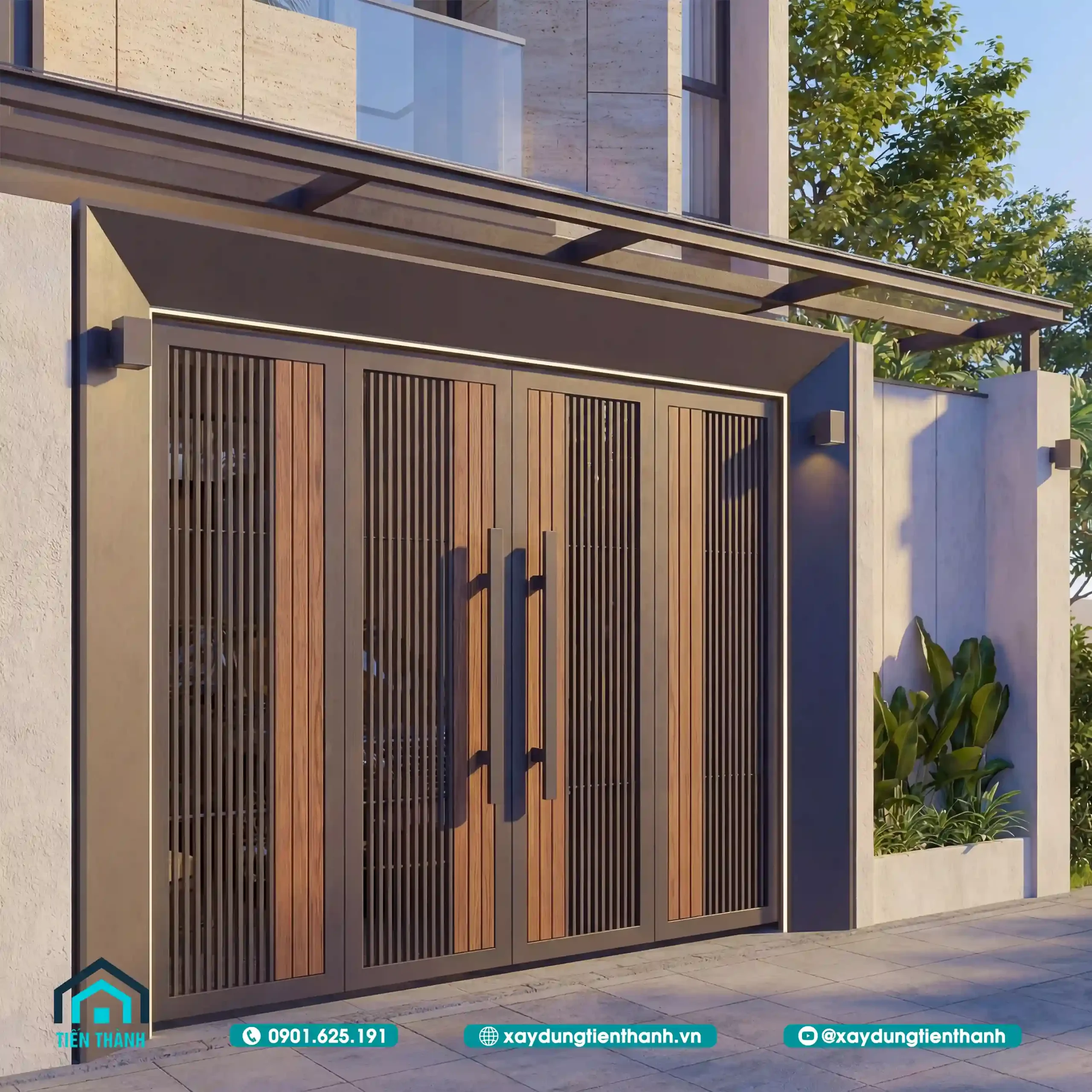 Thiết kế cổng sắt nan gỗ hiện đại tích hợp đèn led viền sang trọng đẳng cấp.