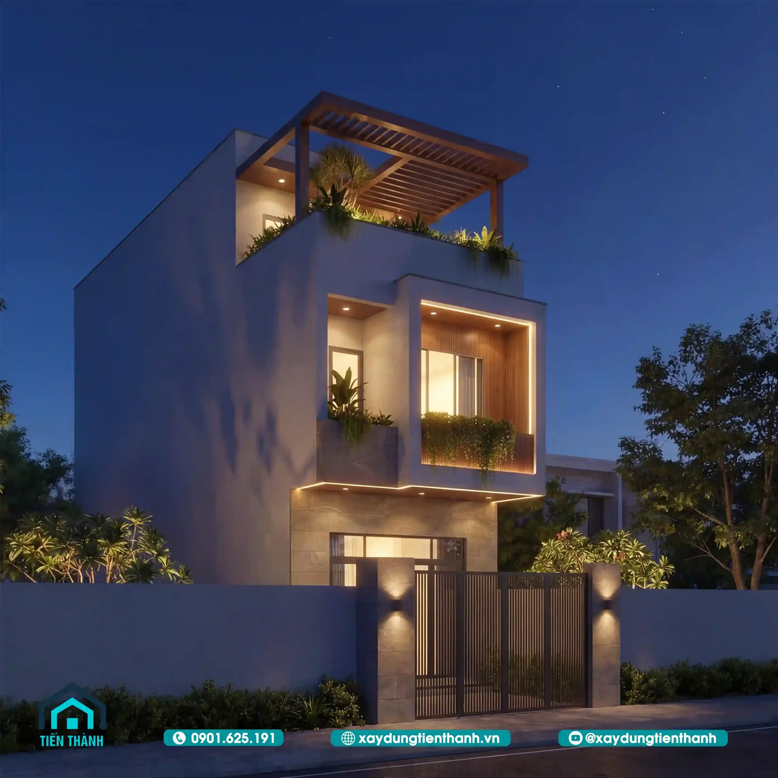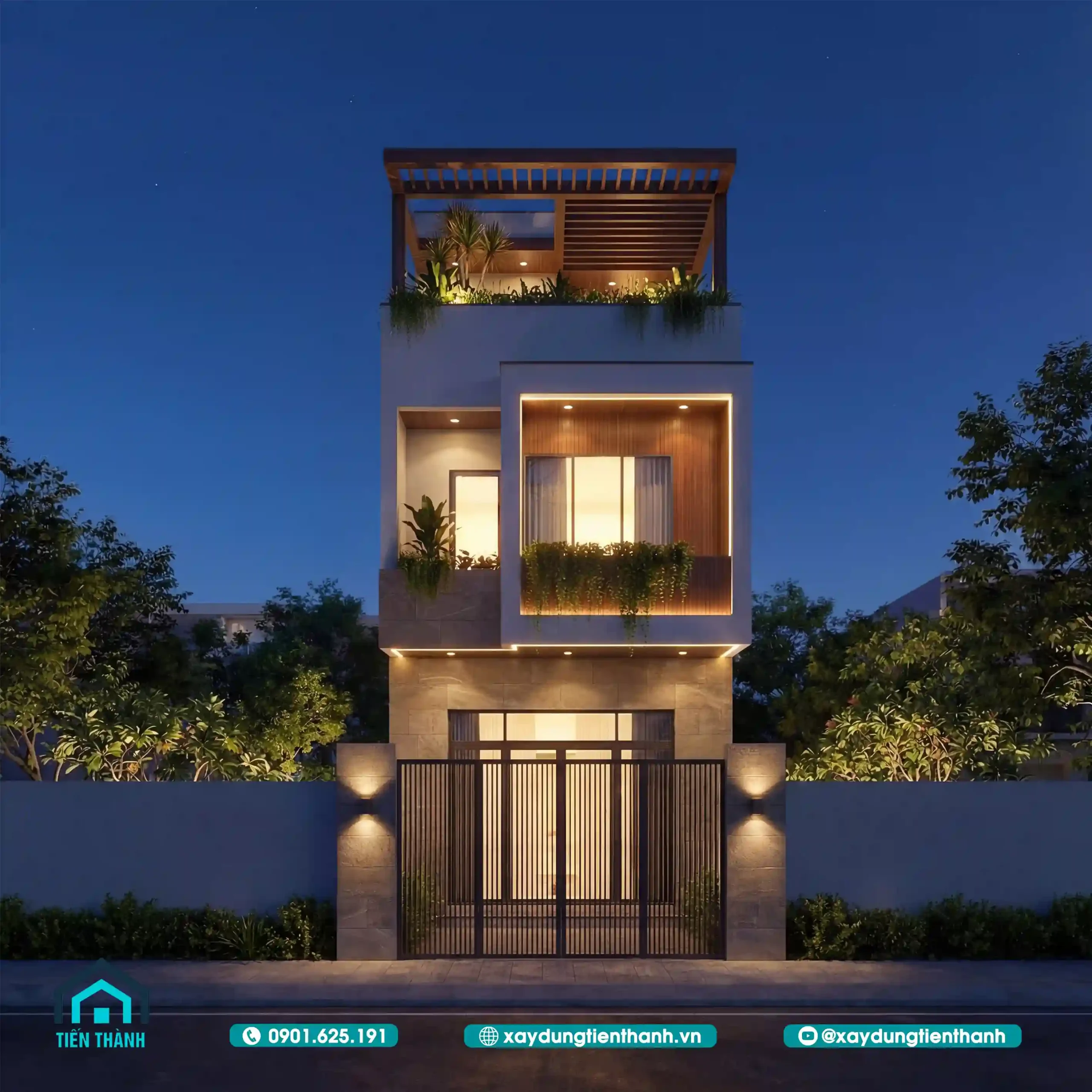 Ngôi nhà ba tầng lung linh dưới ánh đèn vàng ấm áp trong không gian buổi tối yên tĩnh.