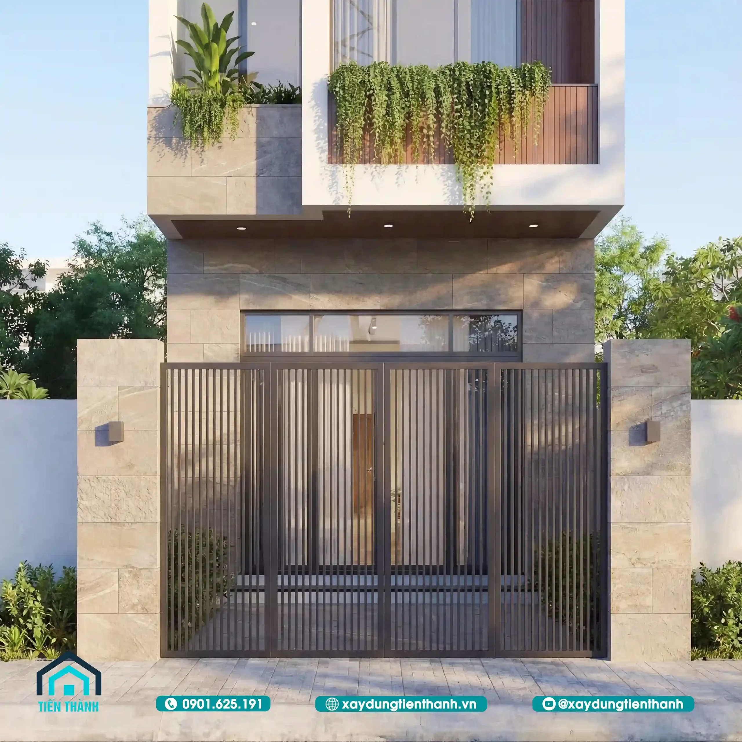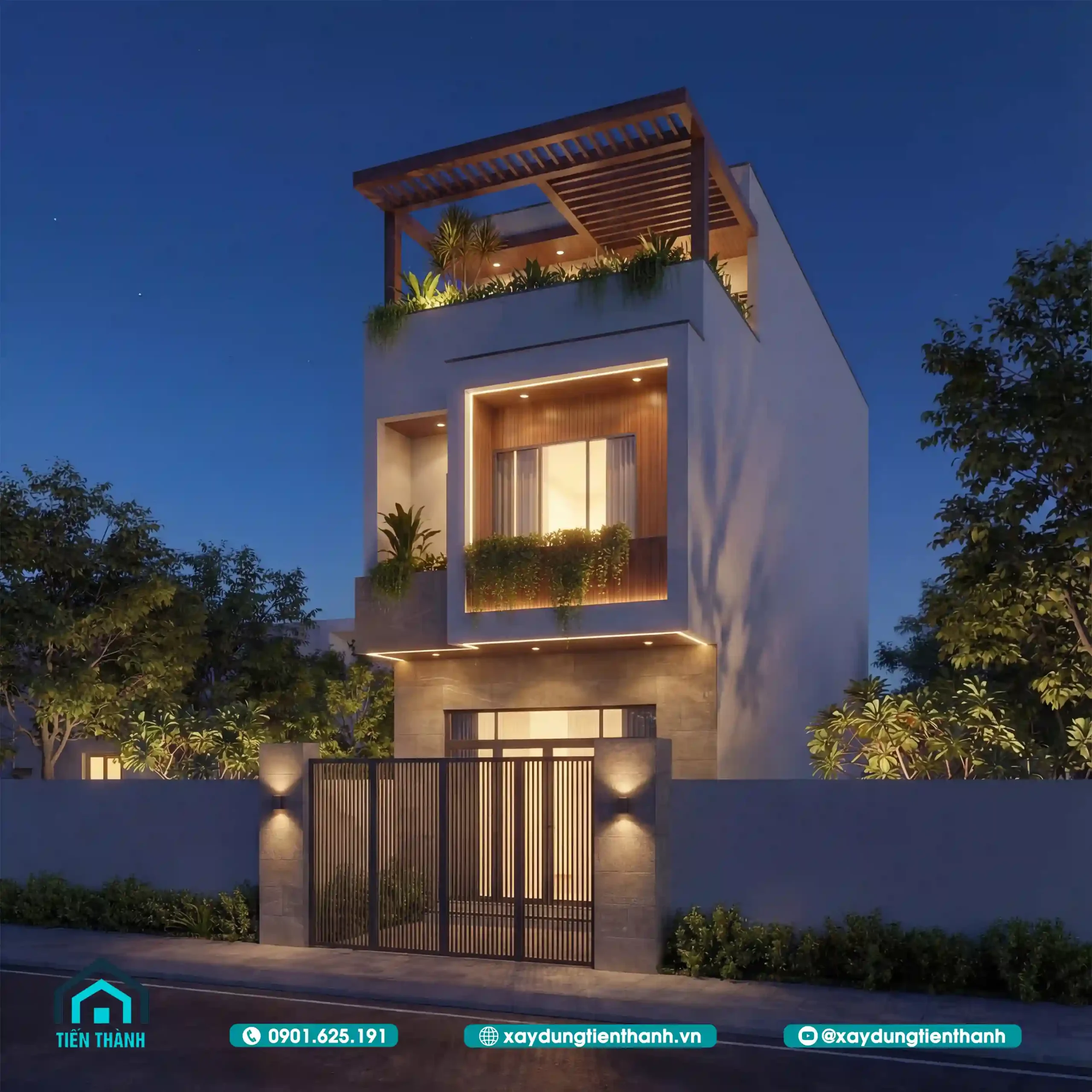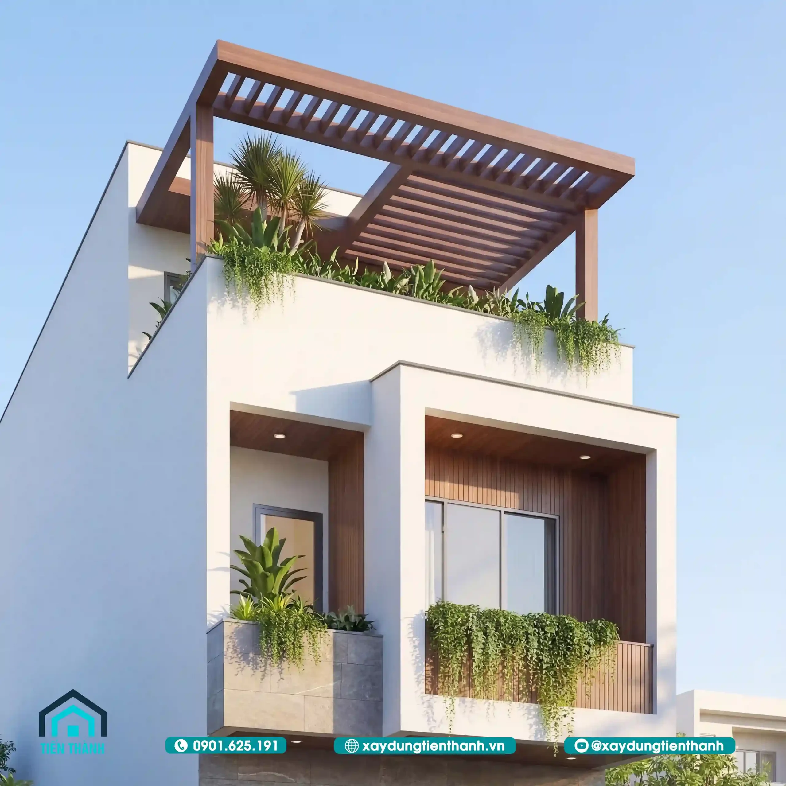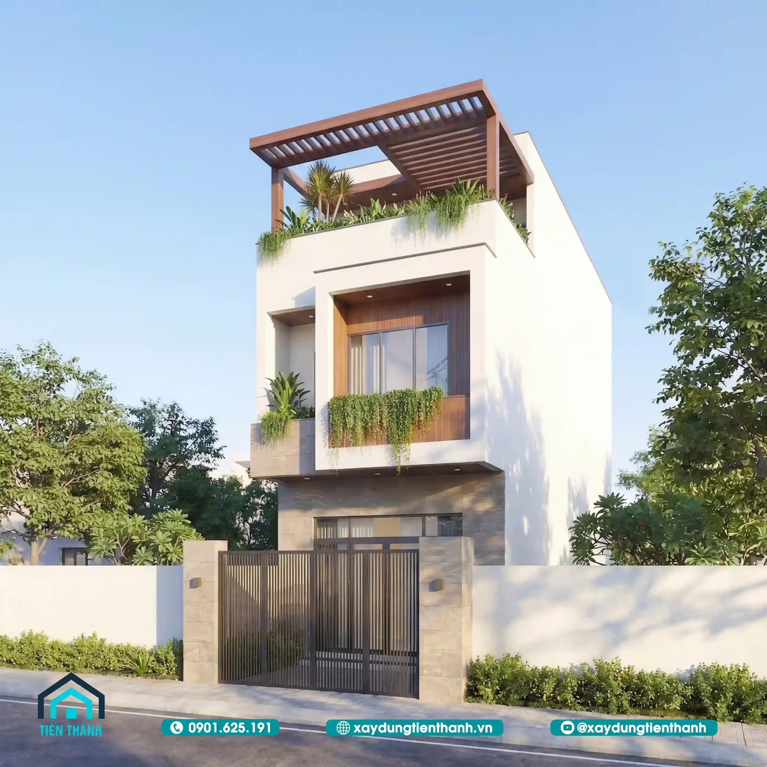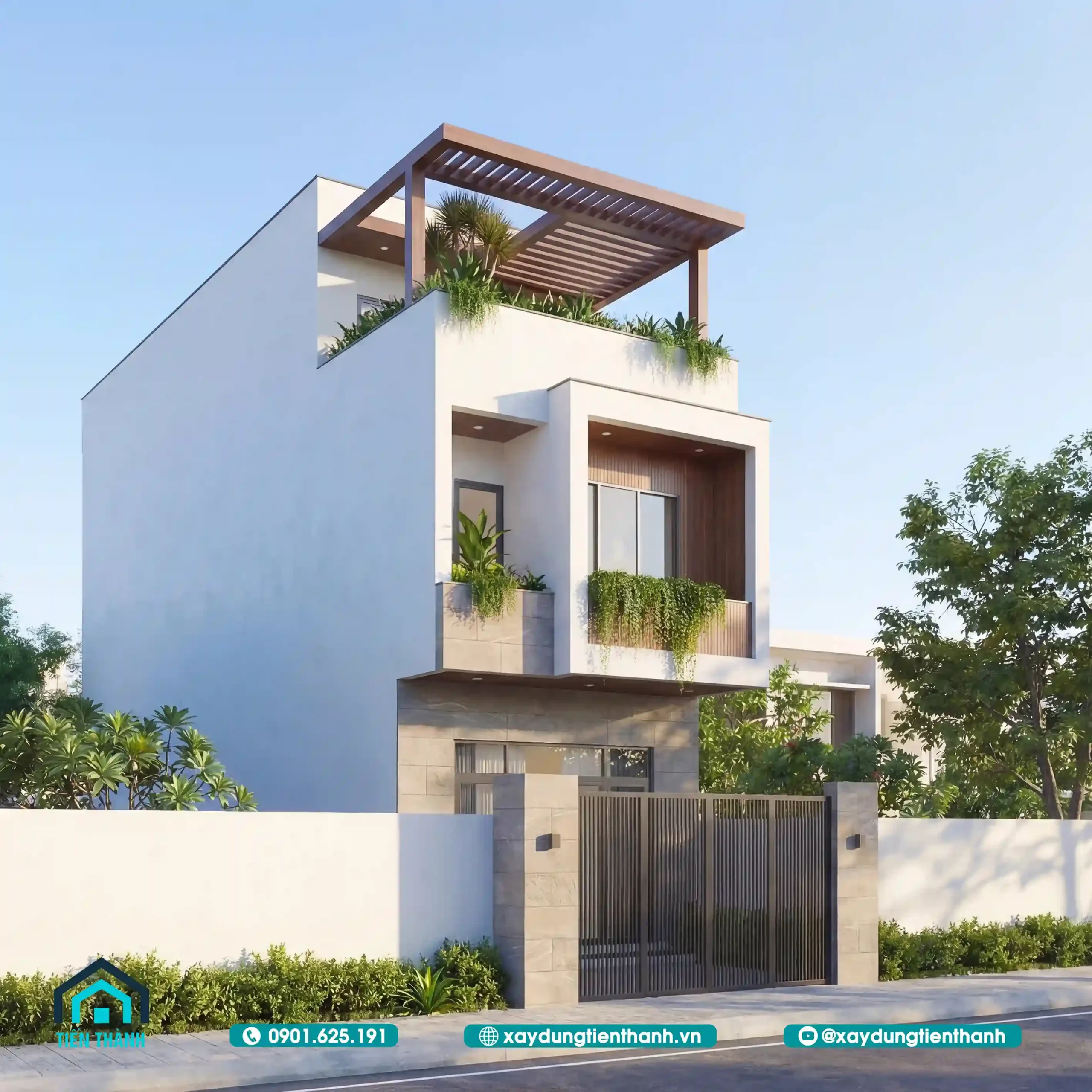 Phối cảnh nhà phố hiện đại ba tầng với sân thượng xanh mát vào ban ngày nắng đẹp.
