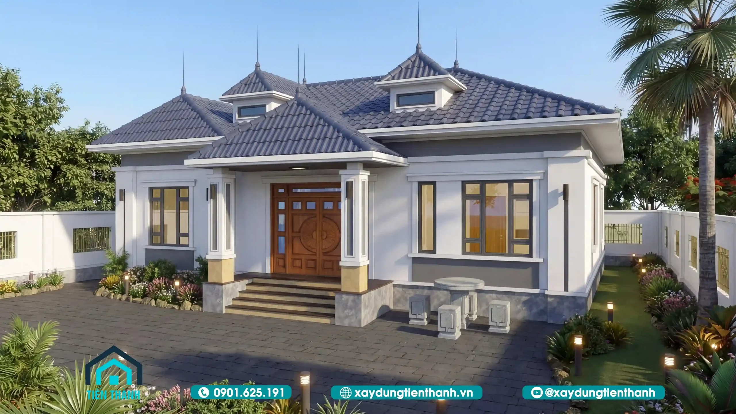 - Chi tiết sảnh: Sảnh chính nên có bậc tam cấp (hoặc ngũ cấp) được ốp đá tự nhiên để vừa tôn cao nền nhà, vừa phù hợp với phong thủy “Thiên – Địa – Nhân”.