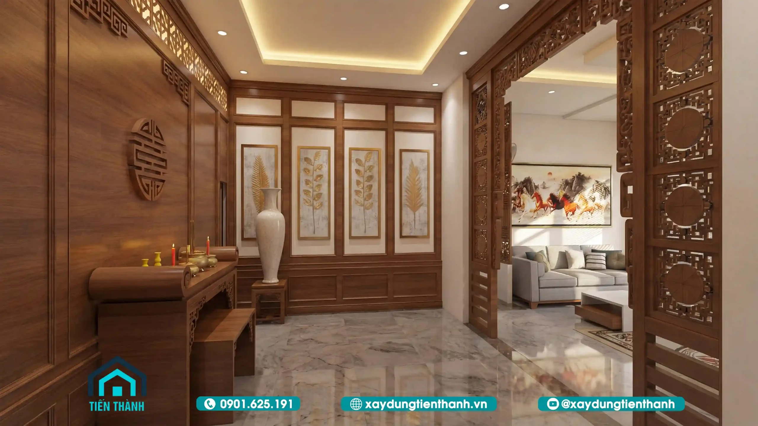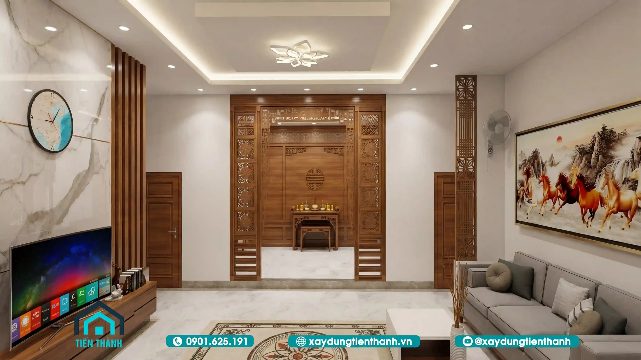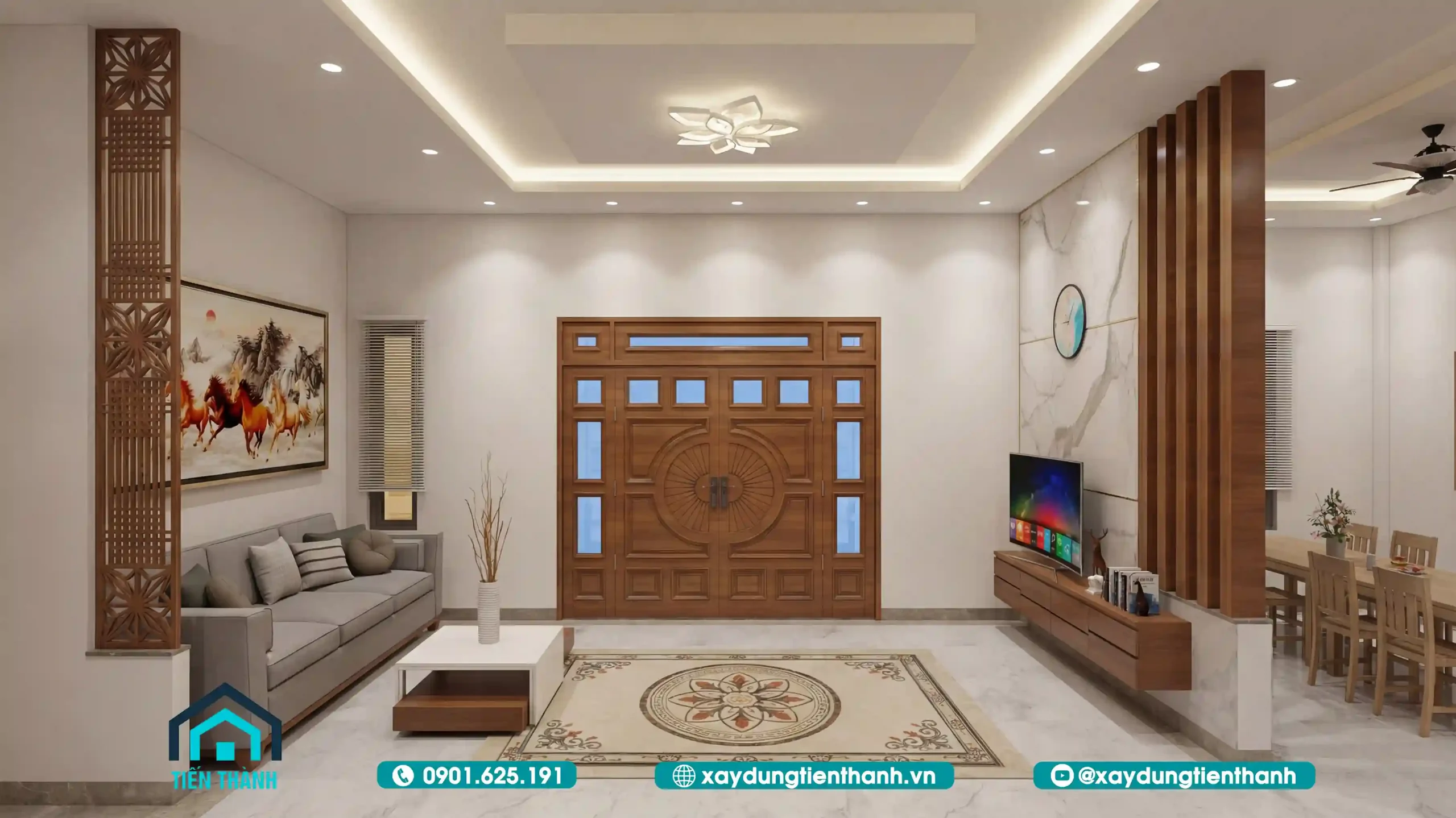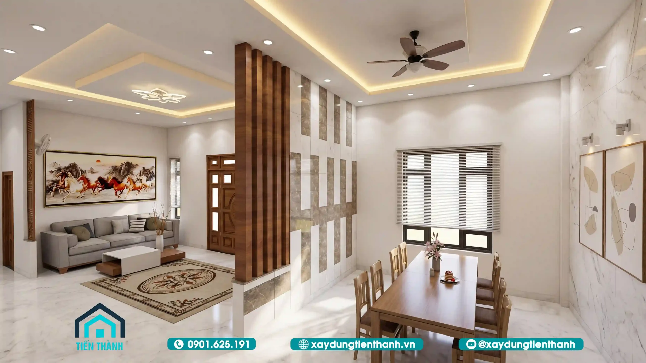 Bước vào từ sảnh chính, phòng khách hiện ra với vẻ đẹp choáng ngợp. Kiến trúc sư đã khéo léo sử dụng tông màu trắng sứ làm chủ đạo cho tường và trần, kết hợp với sàn đá marble vân mây sang trọng. Điểm nhấn đắt giá nhất là hệ vách ngăn gỗ và kệ tivi được thiết kế tinh xảo, ngăn cách khéo léo giữa khu vực tiếp khách và bếp ăn mà vẫn giữ được độ thông thoáng. Bộ sofa nệm cao cấp màu trung tính kết hợp cùng bức tranh “Mã đáo thành công” khổ lớn không chỉ tạo vẻ bề thế mà còn mang ý nghĩa phong thủy tốt lành cho gia chủ.