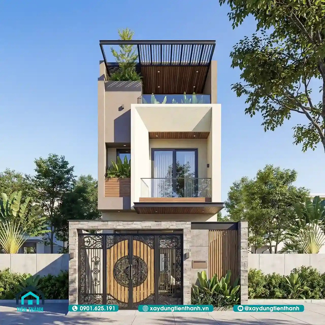 Mẫu nhà 3 tầng phong cách hiện đại kết hợp cổng gỗ hoa văn sắt nghệ thuật tinh xảo.