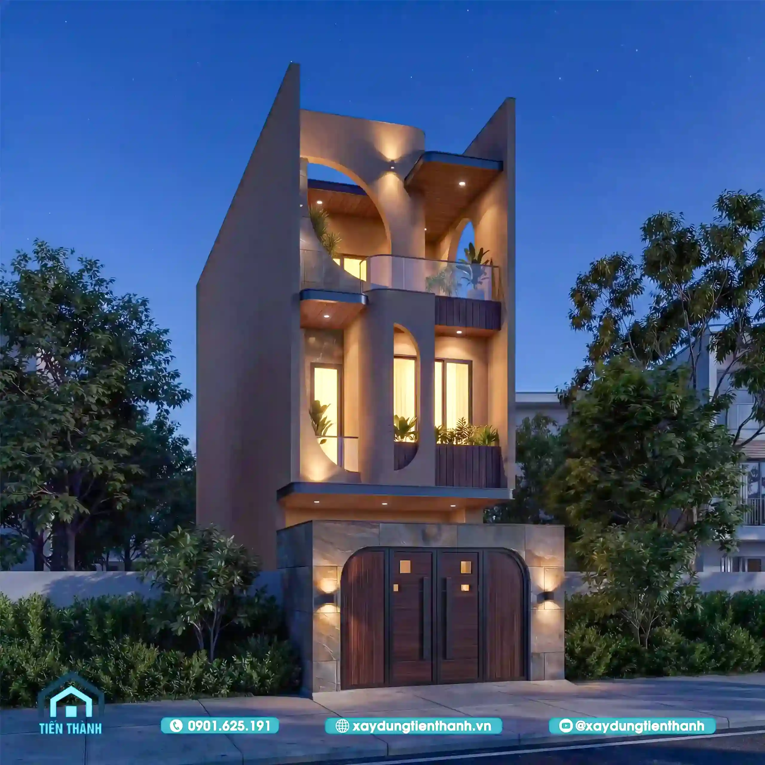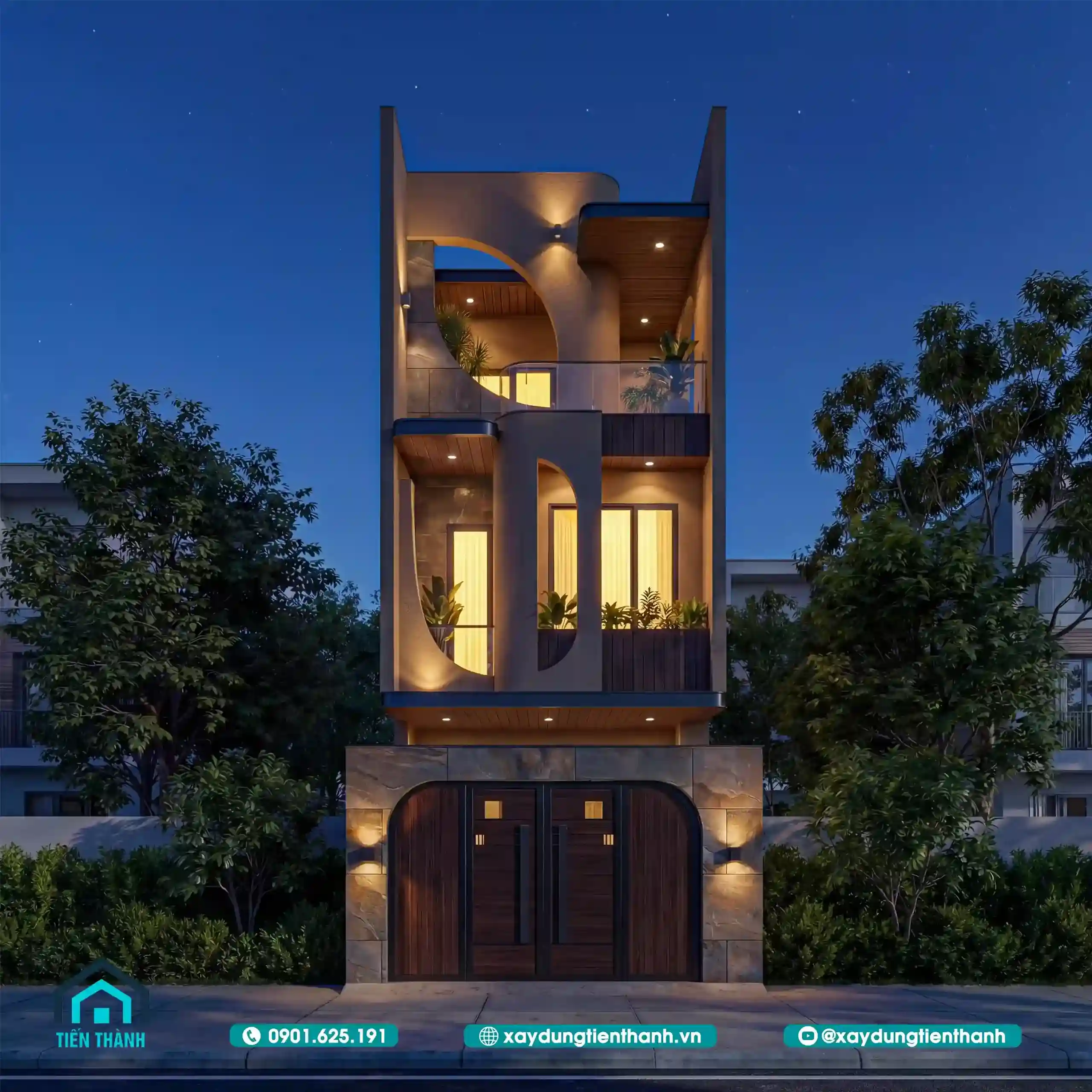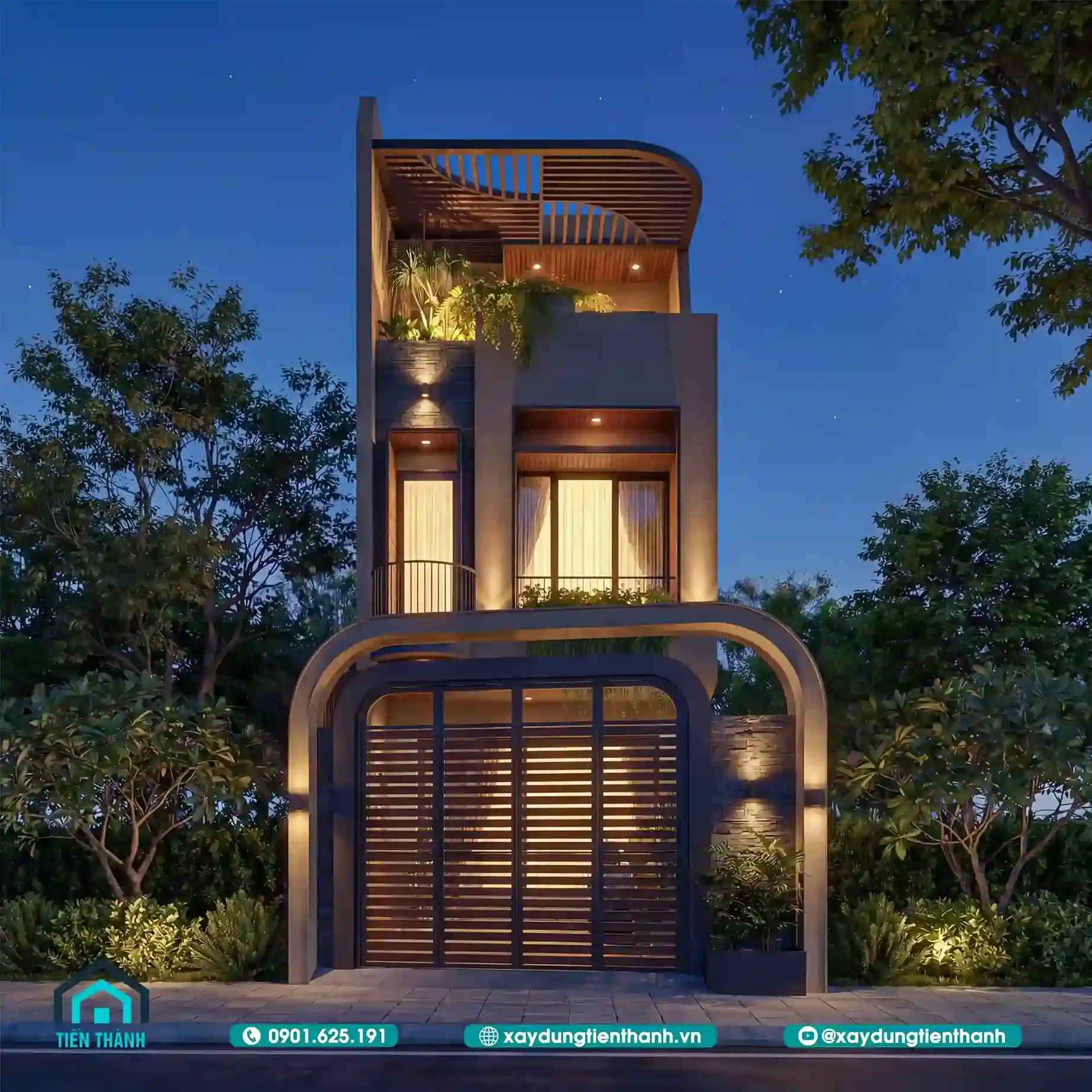 Nhà phố ba tầng hiện đại với ban công bo góc và ánh sáng vàng ấm cúng.