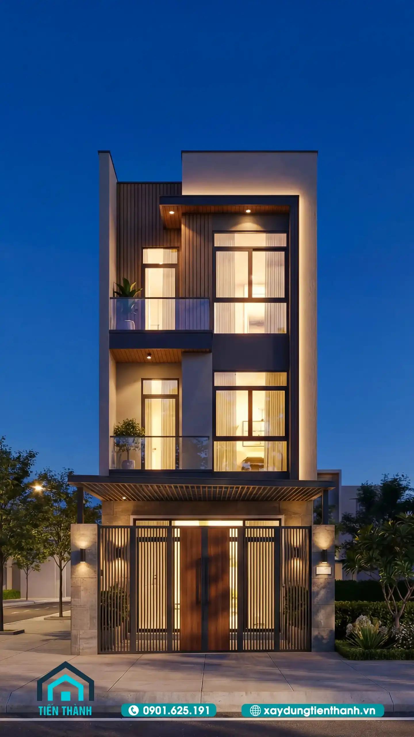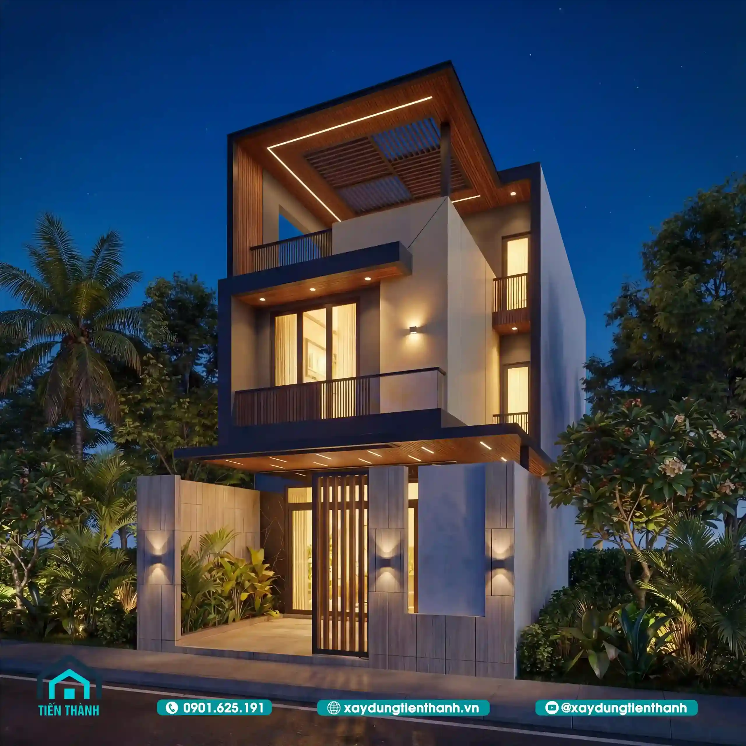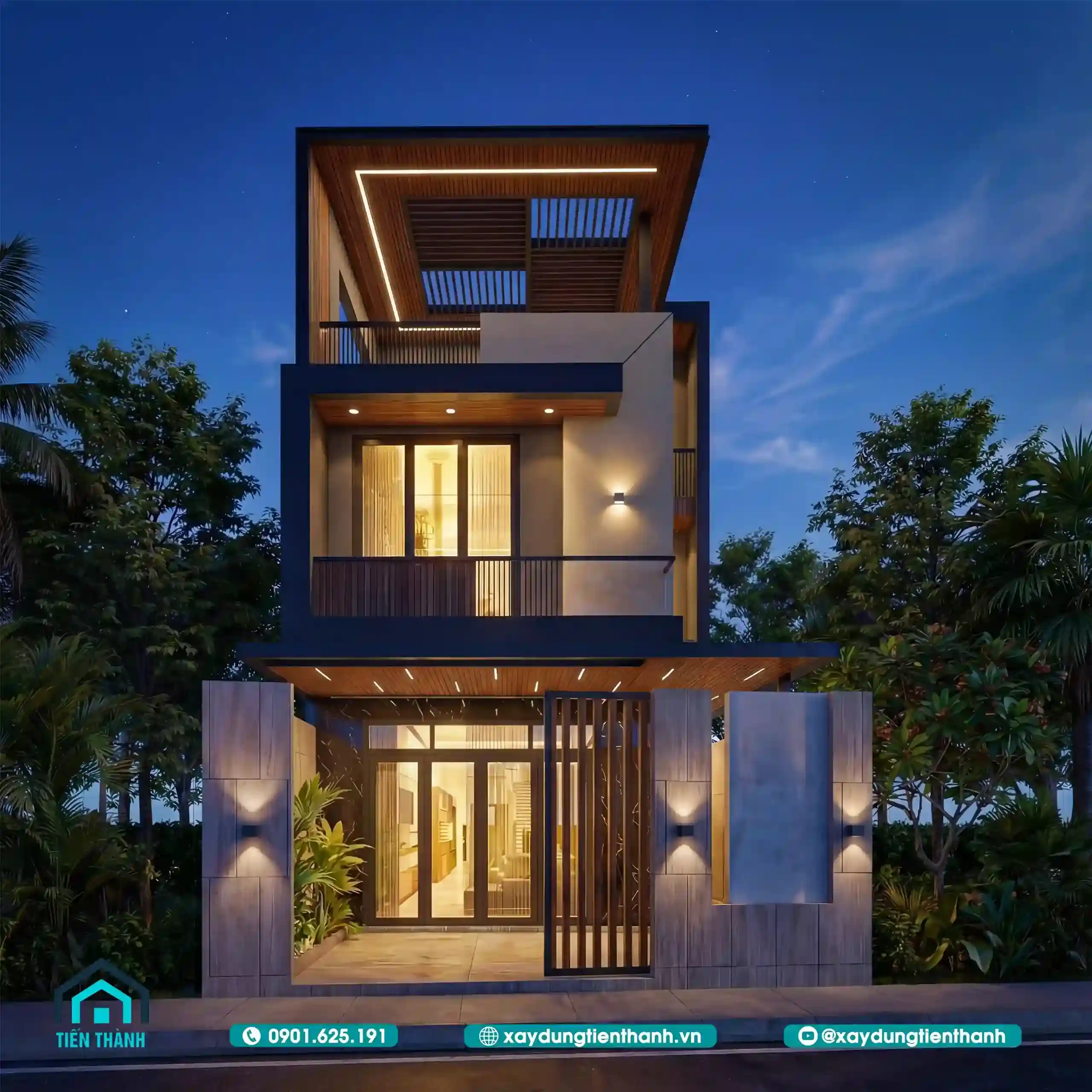 Nhà phố hiện đại kết hợp hài hòa vật liệu gỗ, kính và đèn LED ban đêm.
