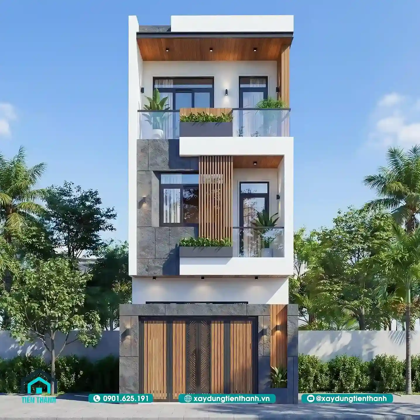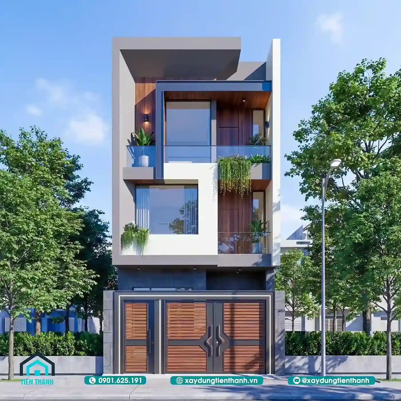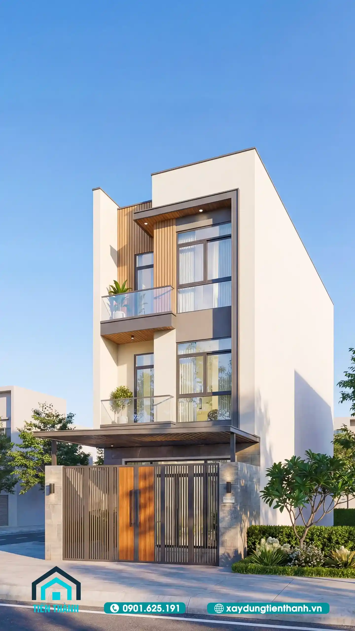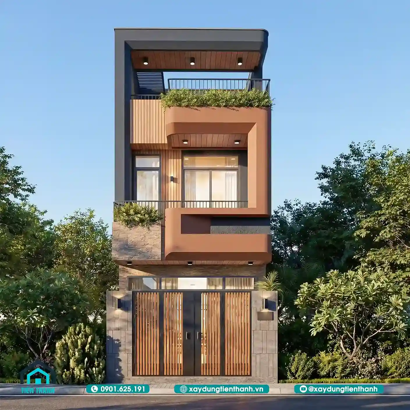 Kiến trúc nhà ống 3 tầng trẻ trung với ban công kính và lam gỗ trang trí.