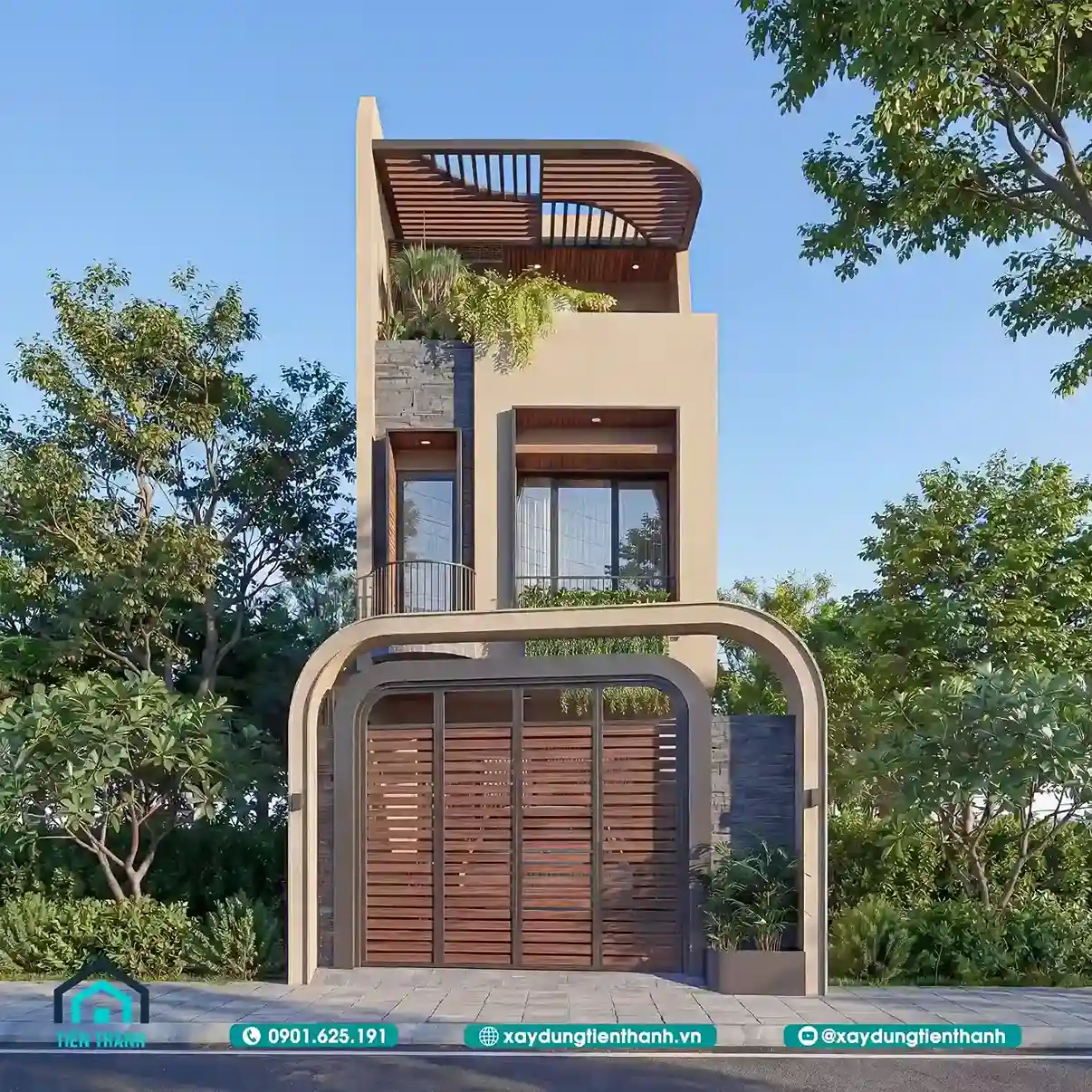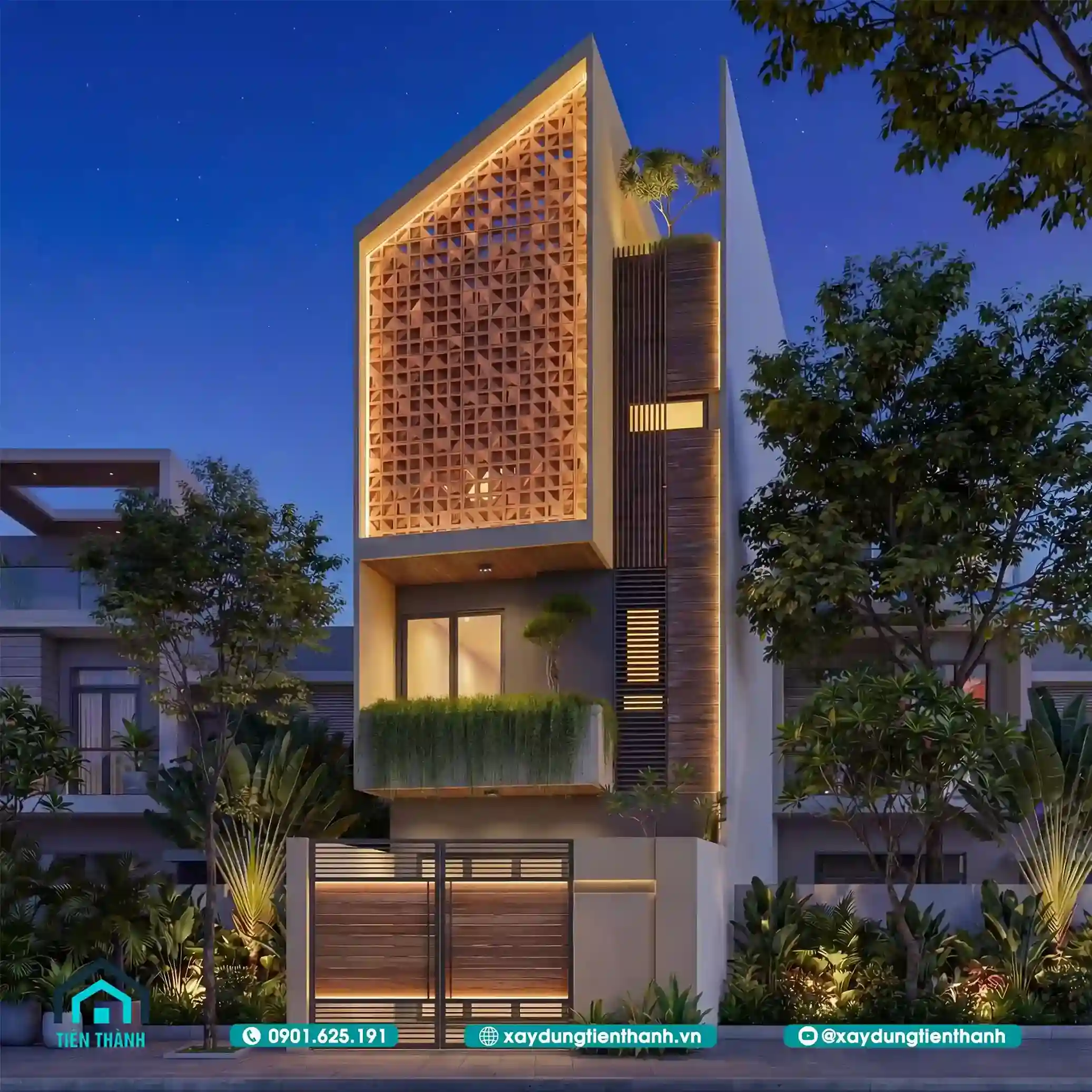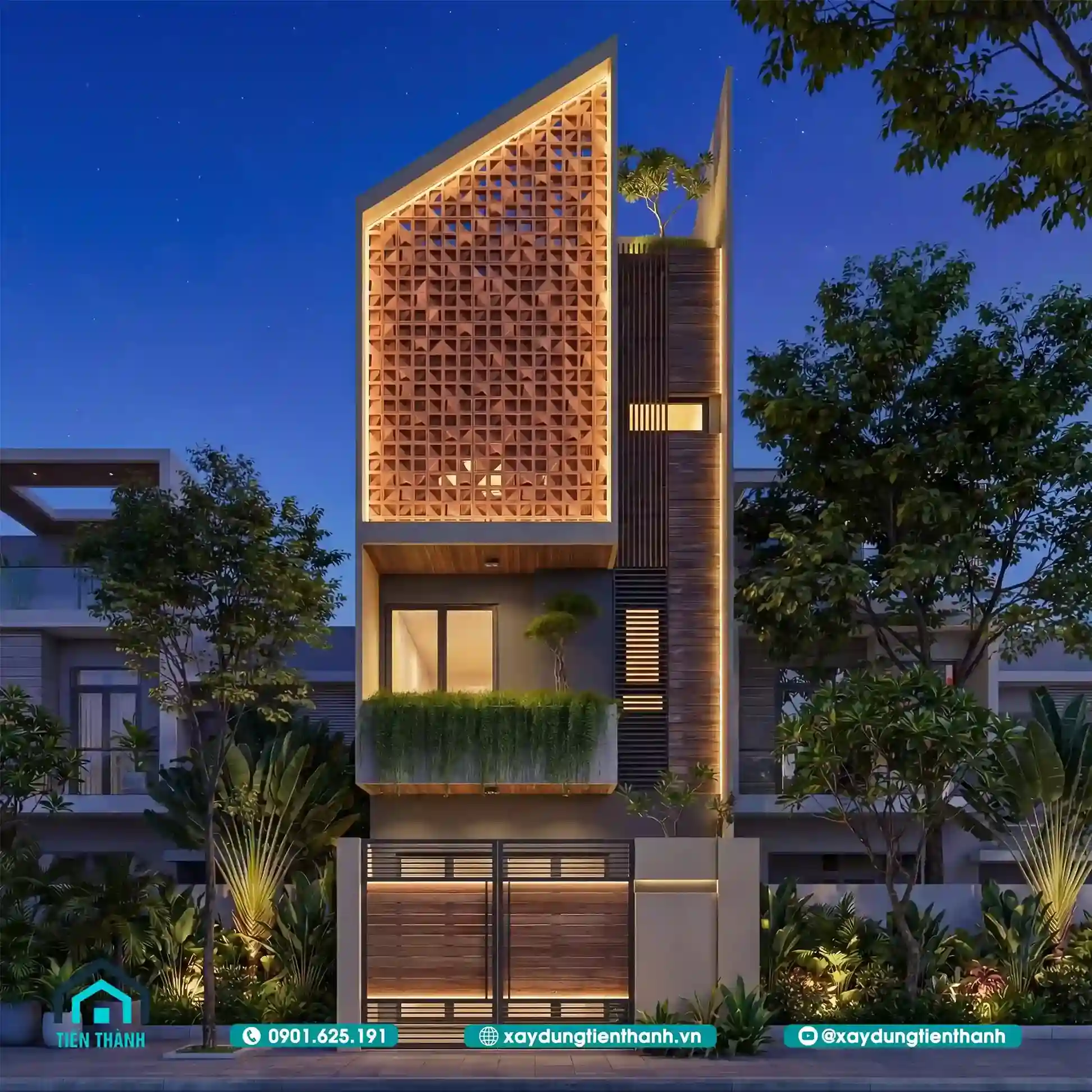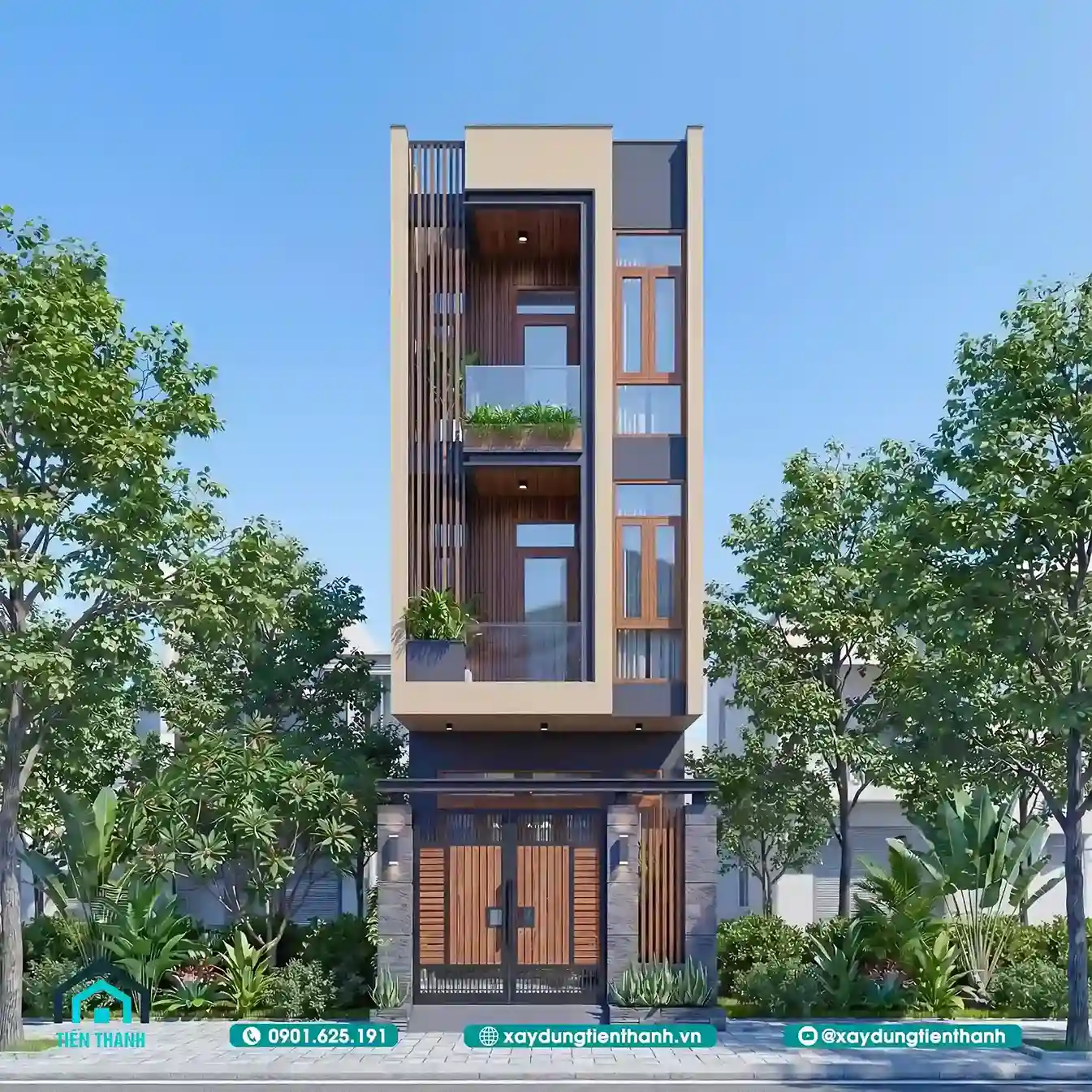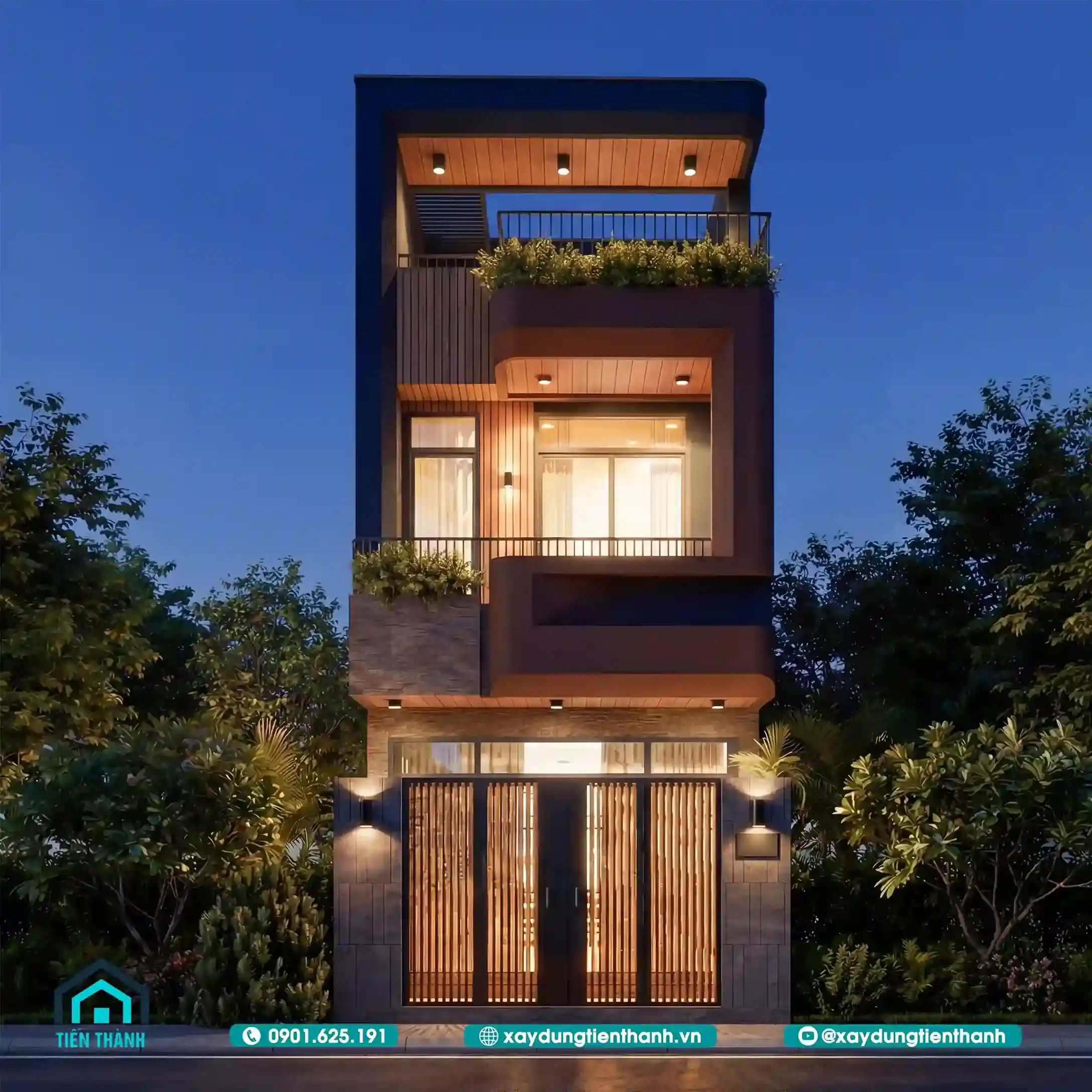 Kiến trúc nhà ống 3 tầng trẻ trung với ban công kính và lam gỗ trang trí.