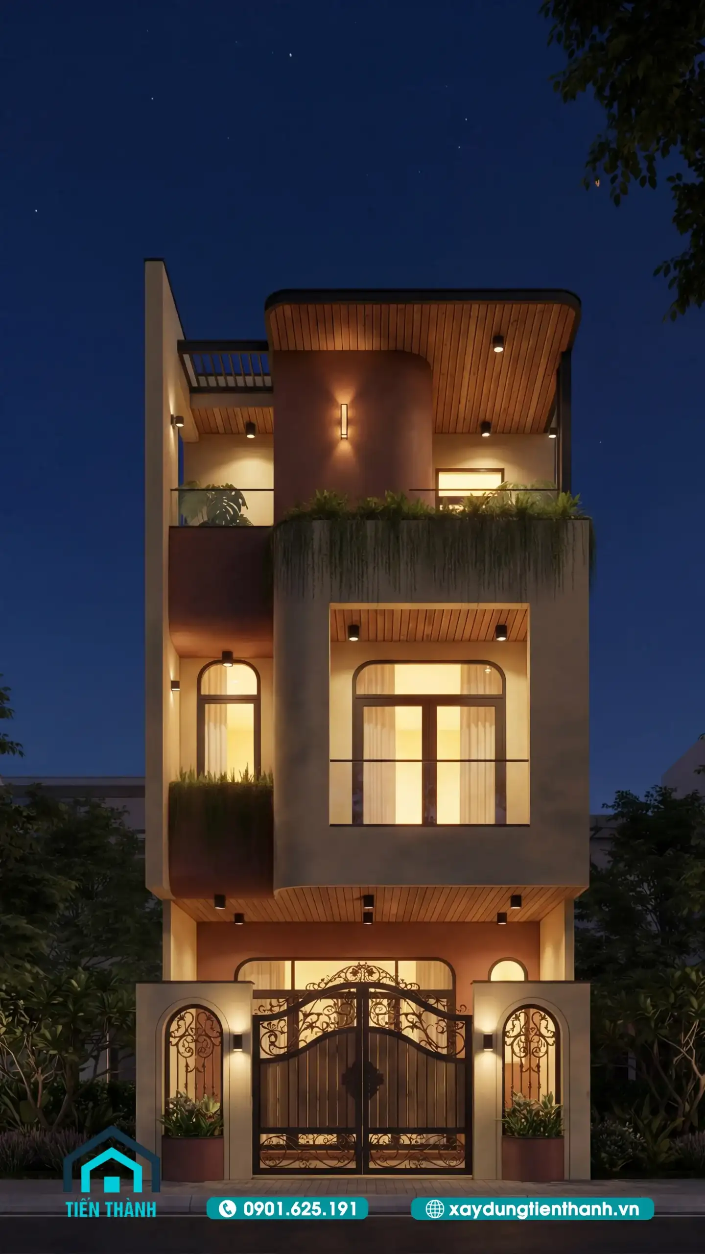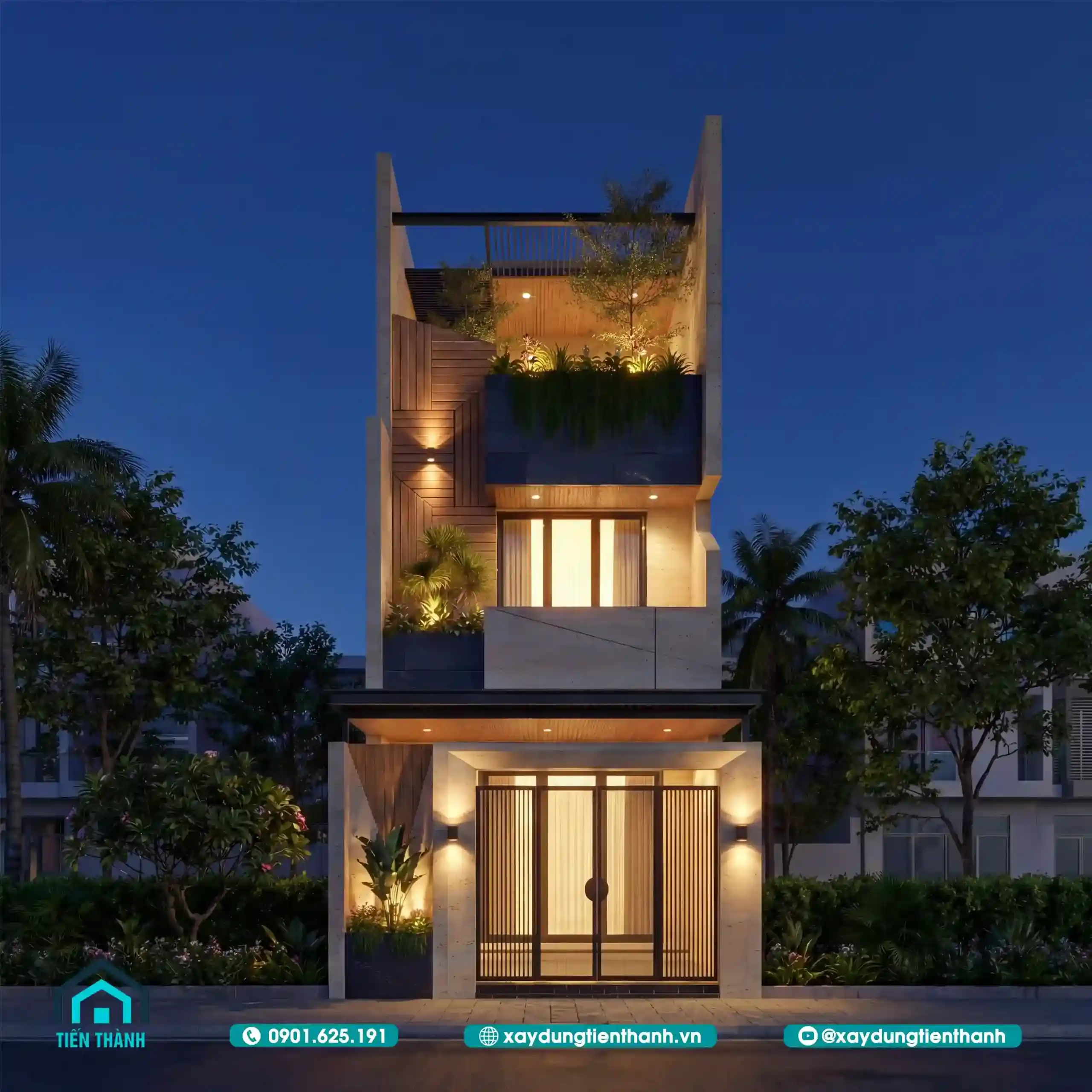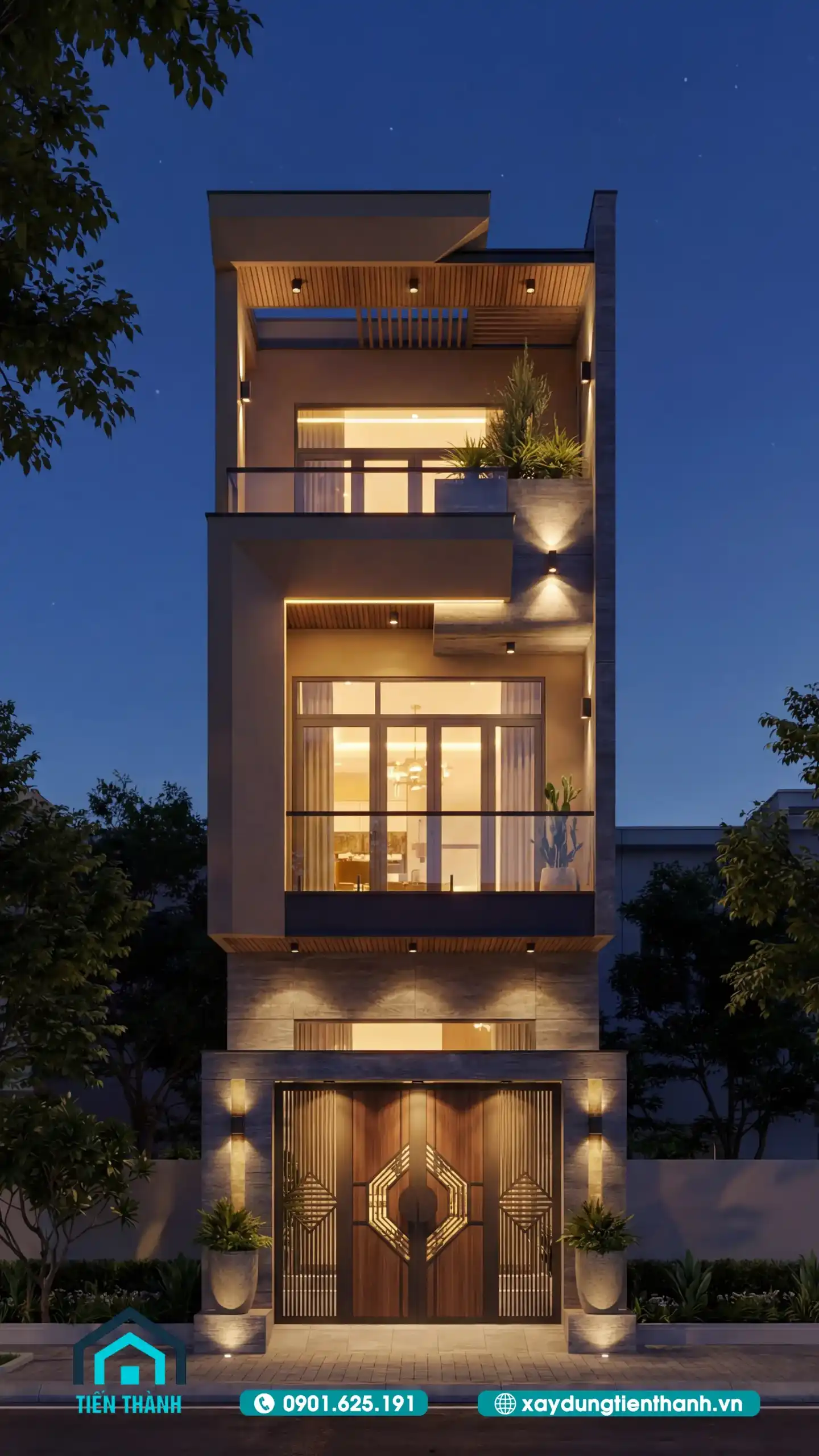 Mẫu nhà ống lung linh dưới ánh đèn đêm có sân thượng và cổng gỗ sang trọng.