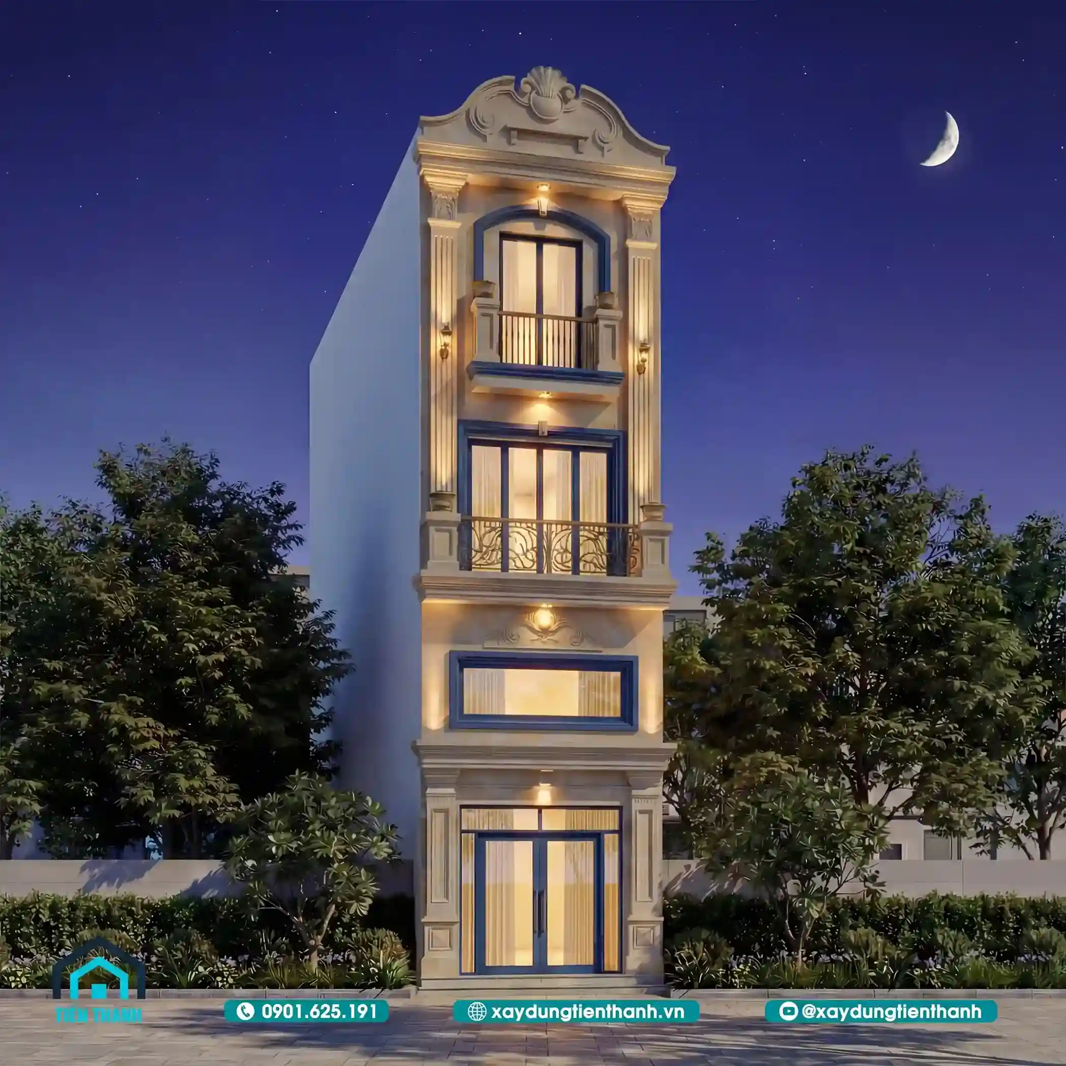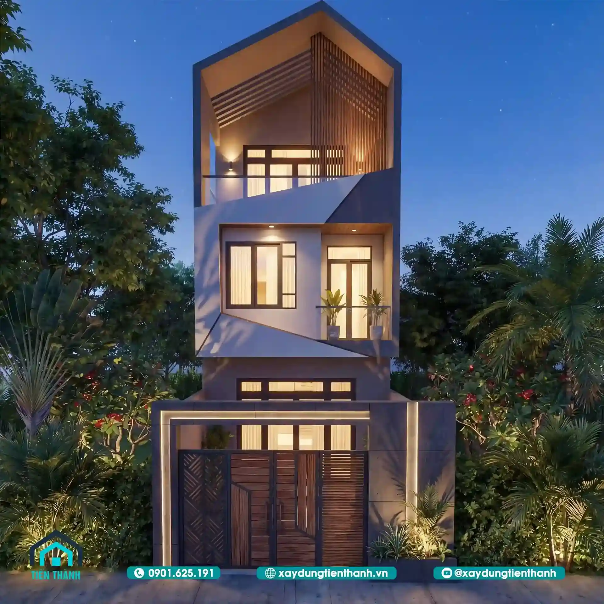 Góc nghiêng nhà phố ba tầng hiện đại rực rỡ dưới ánh đèn ban đêm huyền ảo.
