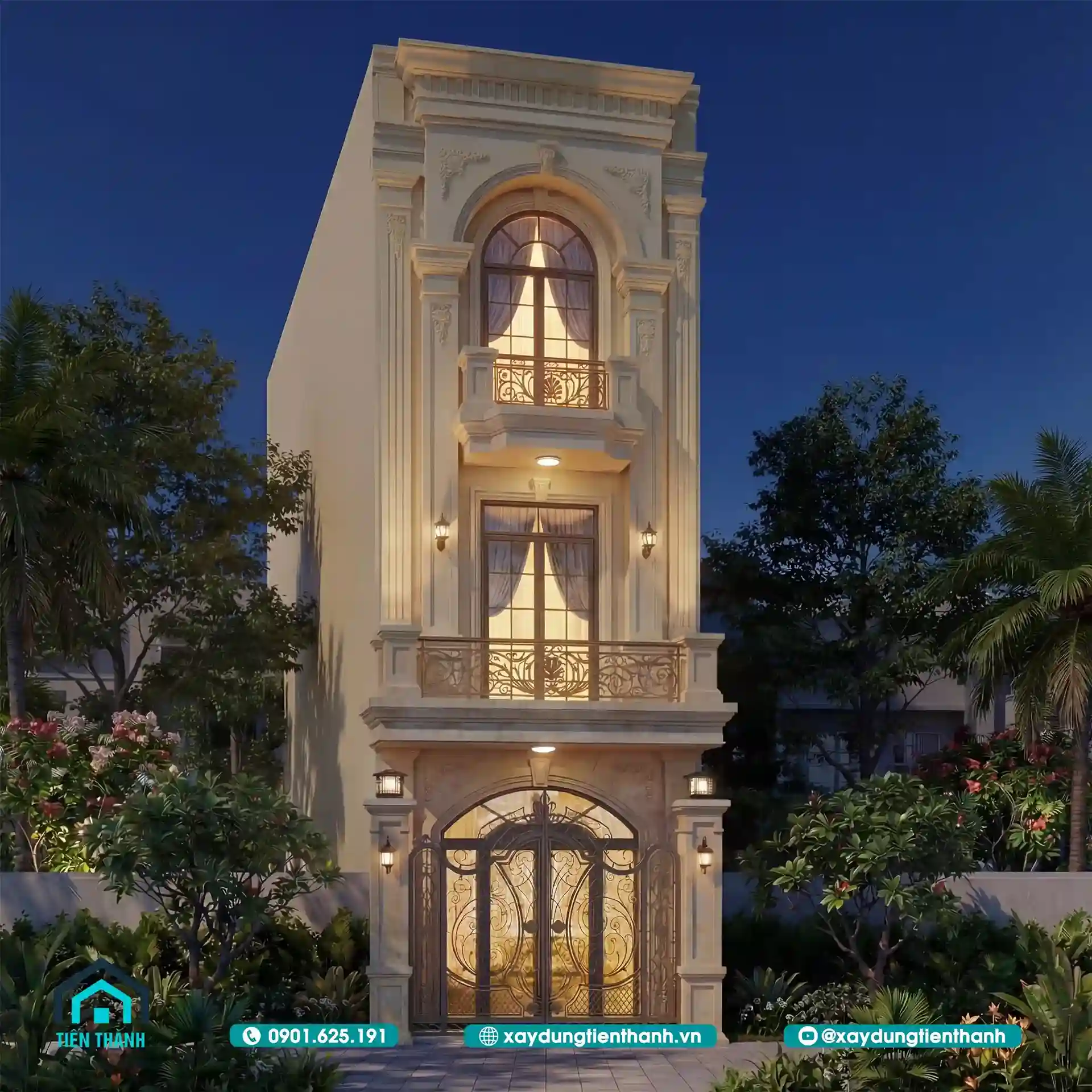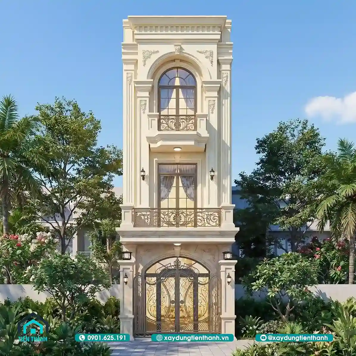 Nhà phố ba tầng phong cách tân cổ điển nhẹ nhàng với cổng sắt nghệ thuật.