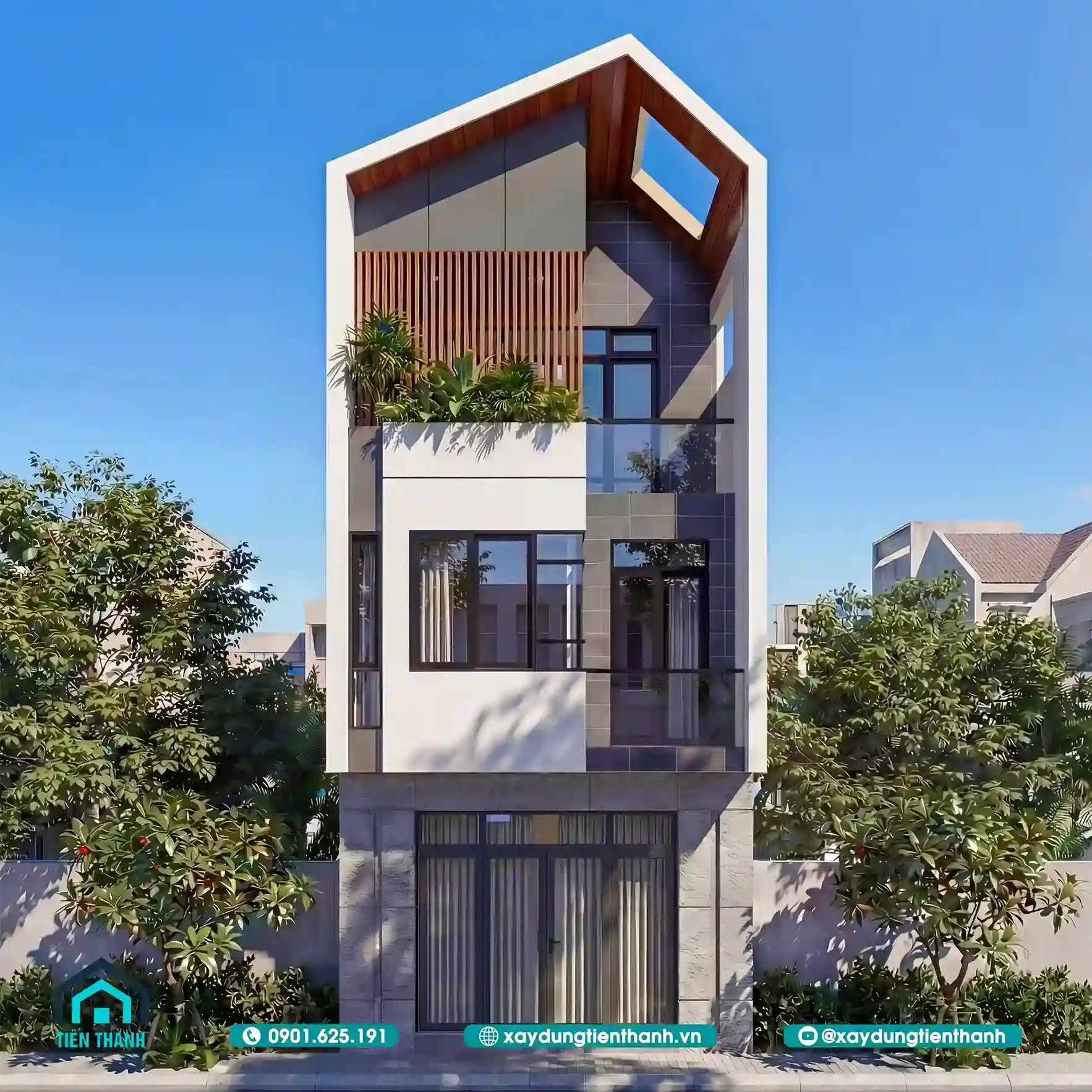 Nhà phố ba tầng hiện đại với mảng xanh ban công và hệ mái lam gỗ thưa.