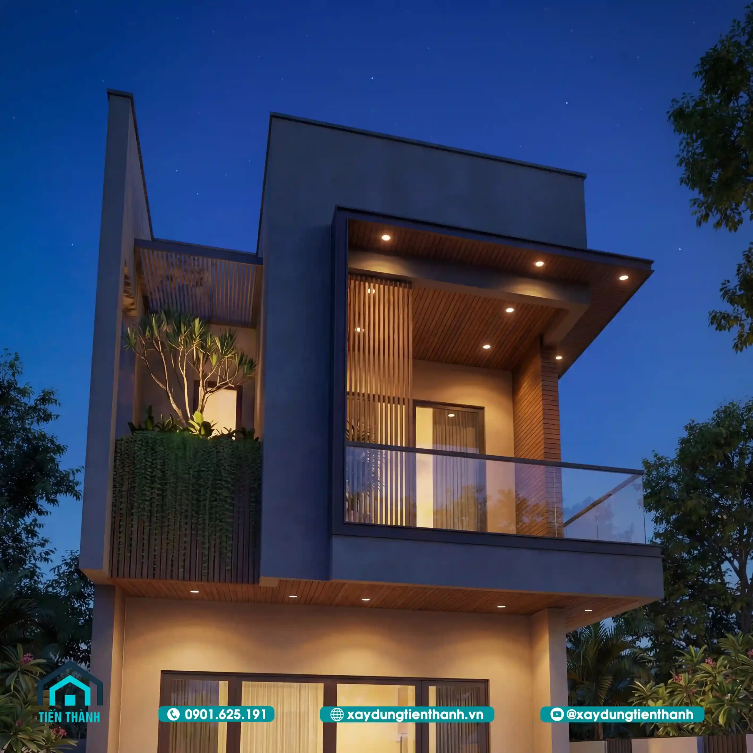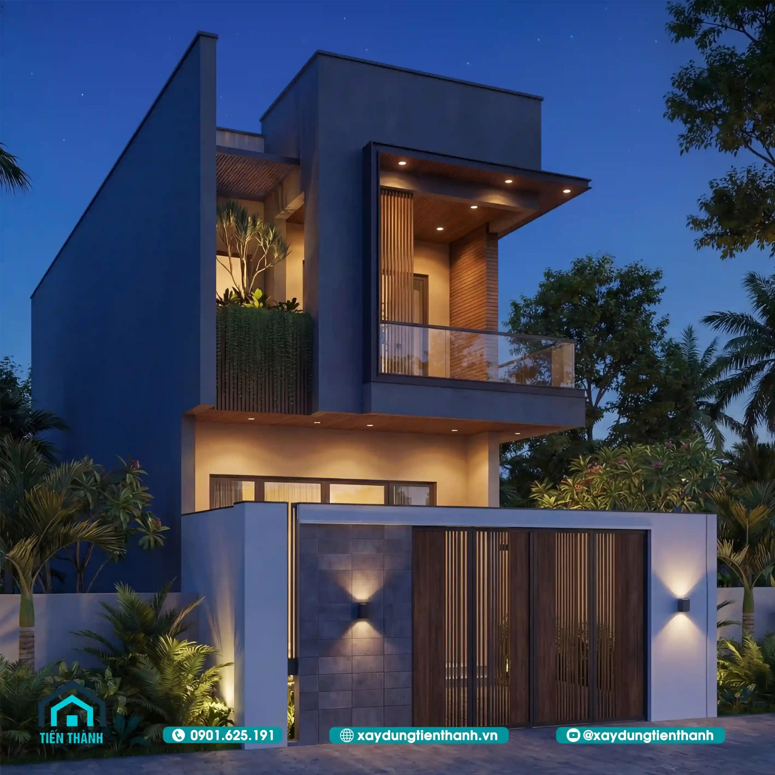 Phối cảnh ban đêm lung linh của ngôi nhà phố hai tầng mặt tiền 6m.