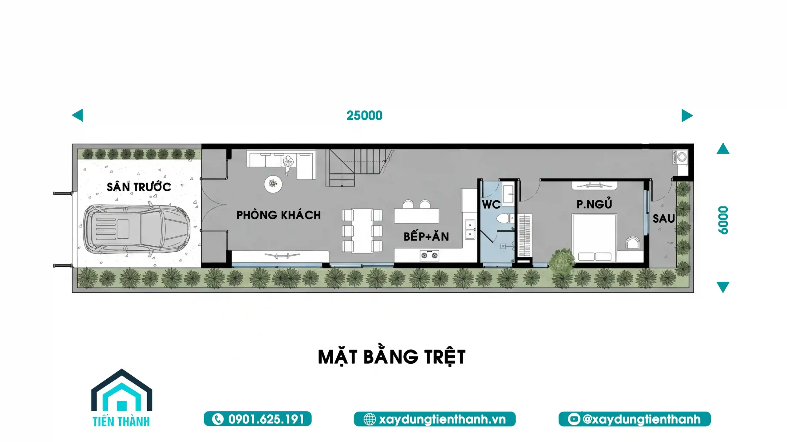 Với chiều dài tổng thể lô đất lên đến 25m, việc phân chia công năng tầng trệt cần sự tính toán kỹ lưỡng để tránh cảm giác nhà quá sâu và thiếu sáng ở giữa.