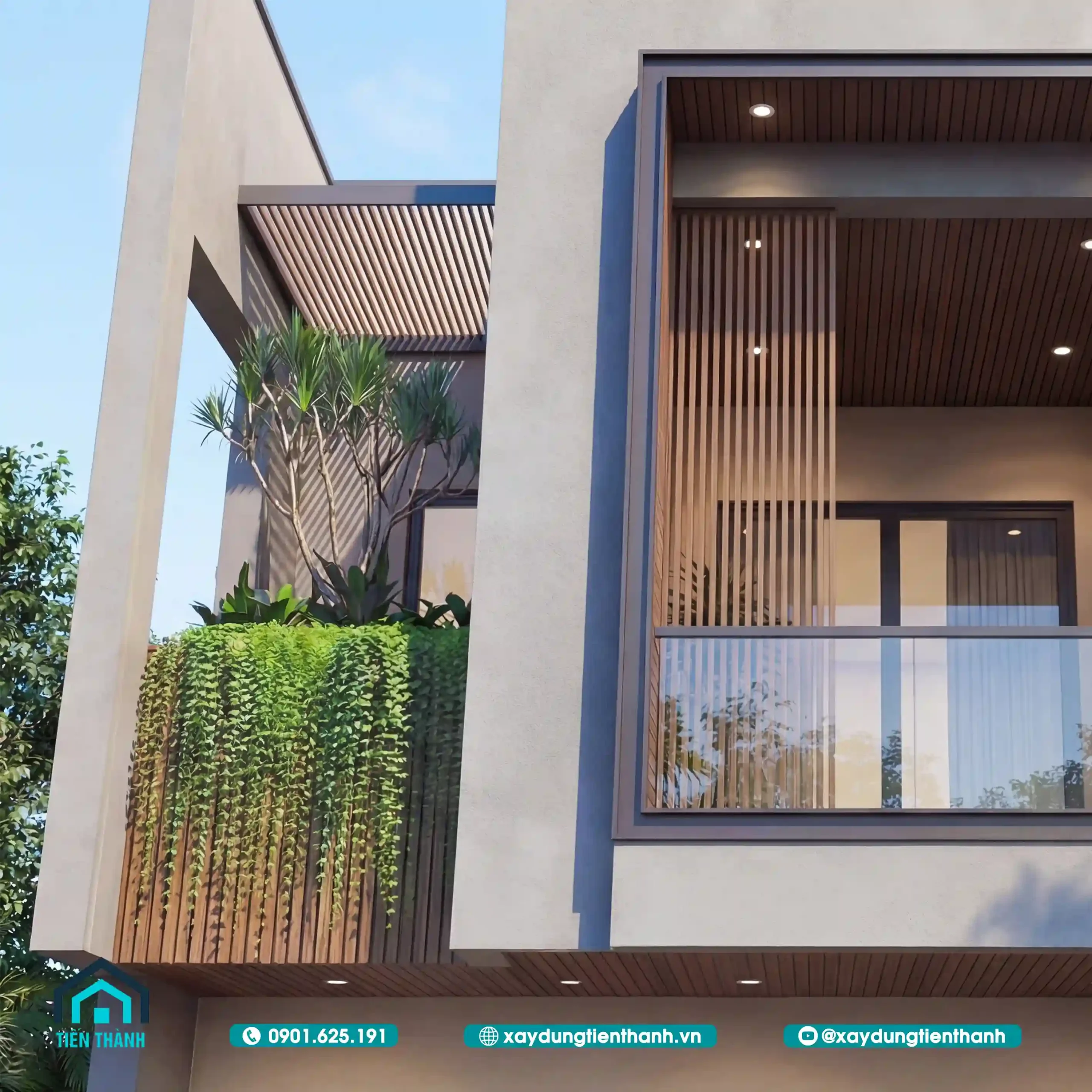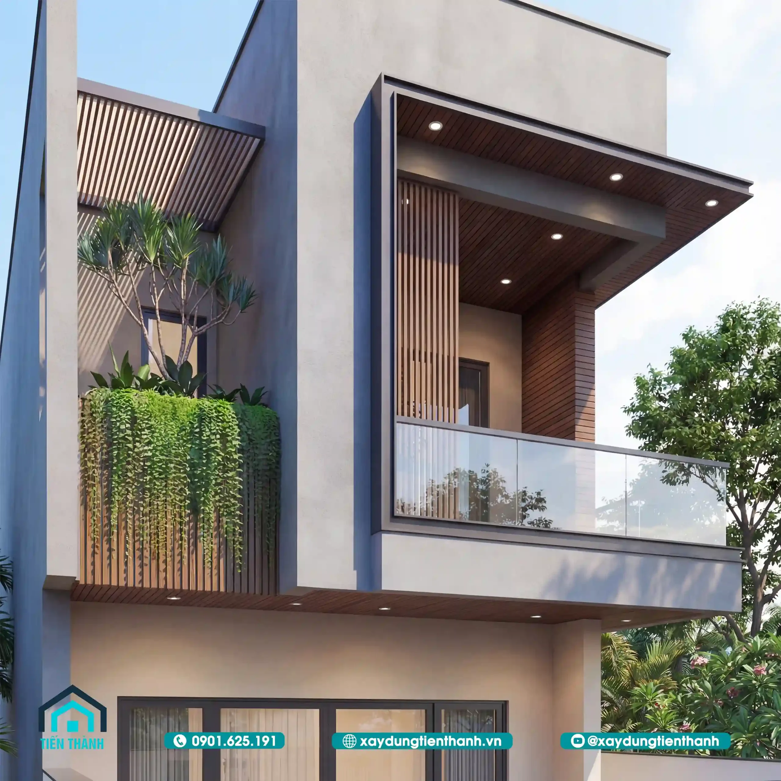 Góc nhìn nghiêng căn nhà phố 6m làm nổi bật ban công kính và lam gỗ.
