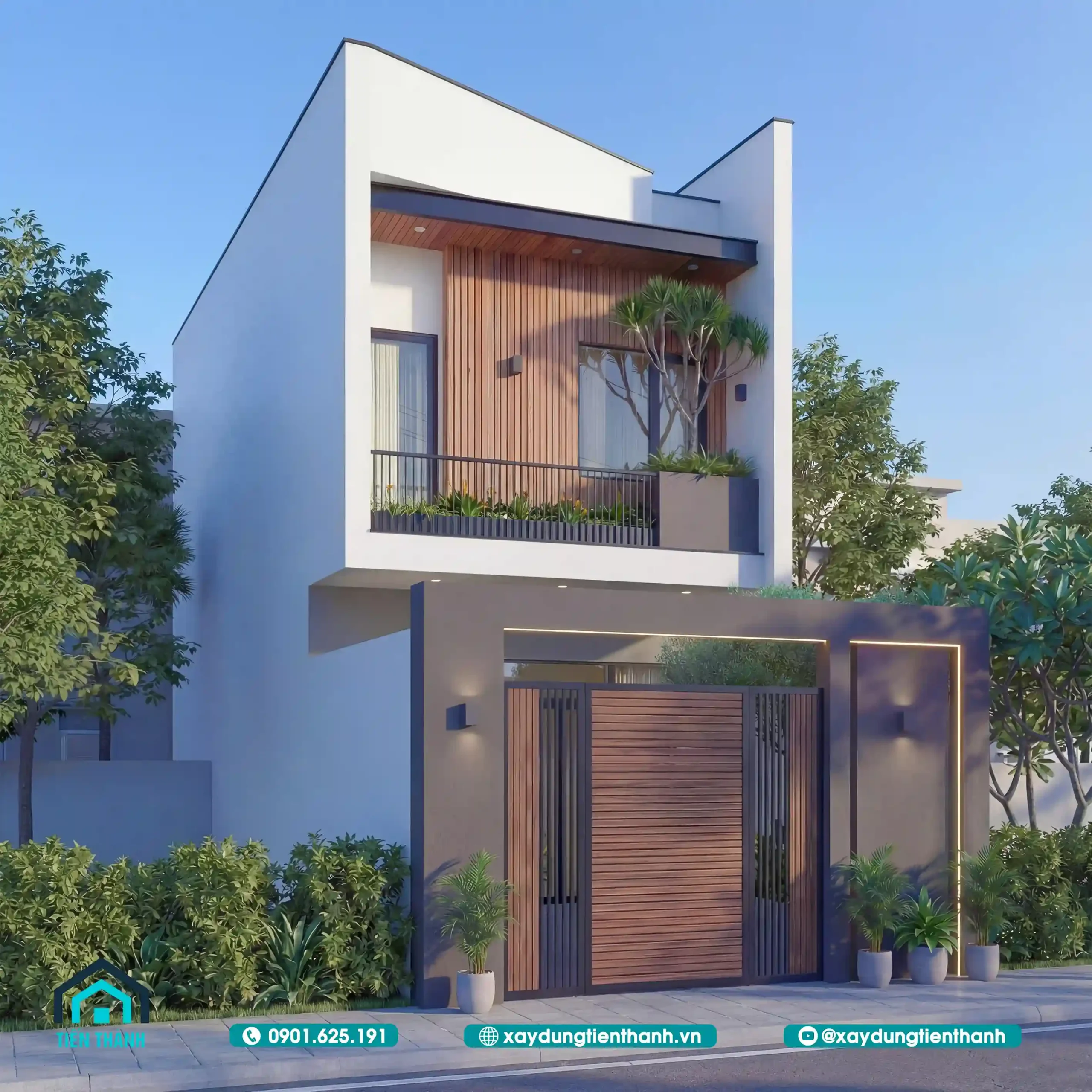 Mẫu nhà ống 2 tầng này đại diện cho tư duy kiến trúc mới: Đơn giản – Sang trọng – Tiện nghi. Với sự phối hợp của các tông màu trung tính như xám, trắng và nâu gỗ, công trình không bao giờ bị lỗi mốt theo thời gian.