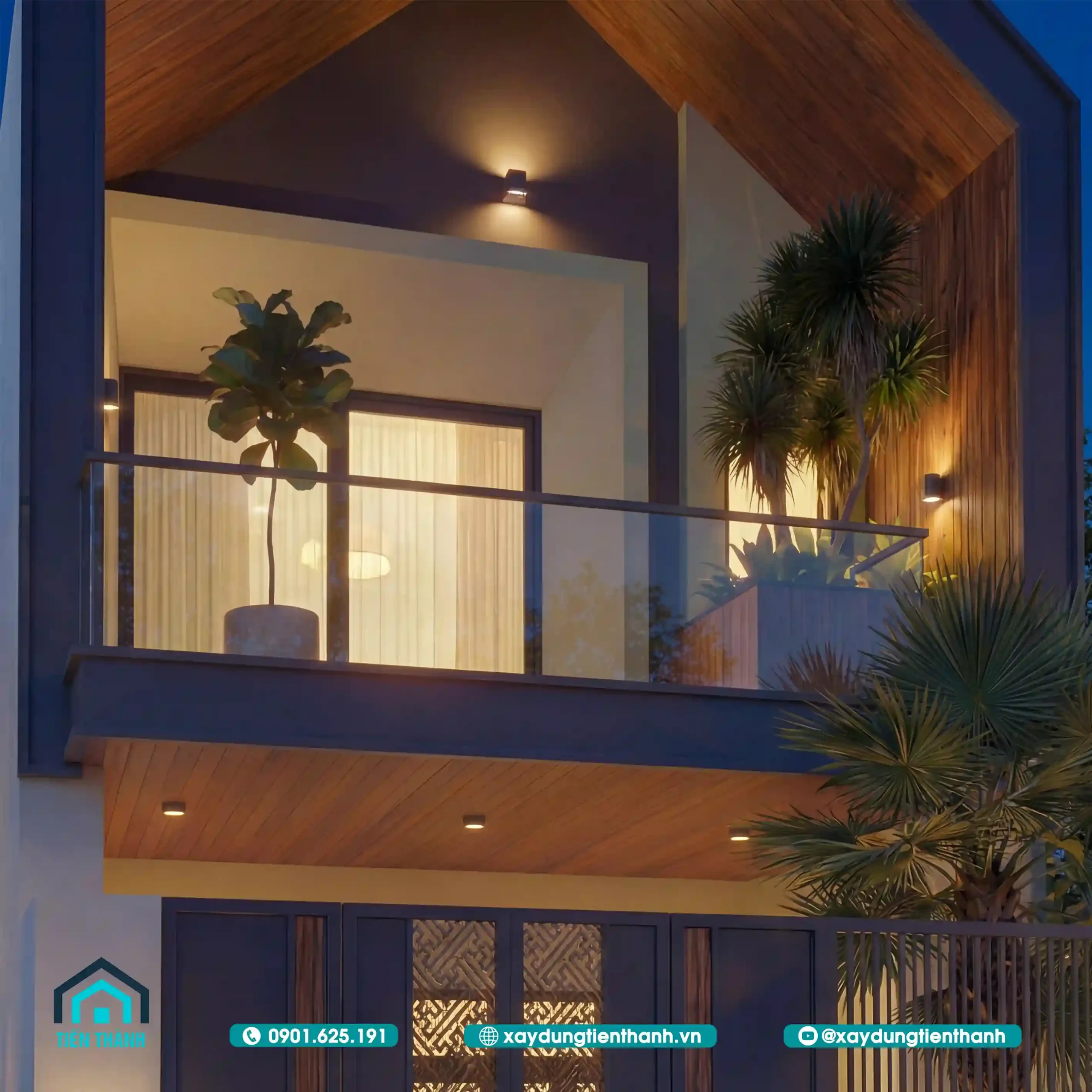 Khu vực tầng 2 được thiết kế với ban công rộng, sử dụng kính cường lực trong suốt để không làm che khuất tầm nhìn. Tại đây, kiến trúc sư đã khéo léo bố trí các bồn hoa và cây cảnh, tạo nên một “lá phổi xanh” nhỏ cho gia đình. Việc sử dụng gỗ ốp trần ban công kết hợp với đèn downlight tạo nên sự ấm cúng và sang trọng ngay từ cái nhìn đầu tiên.
