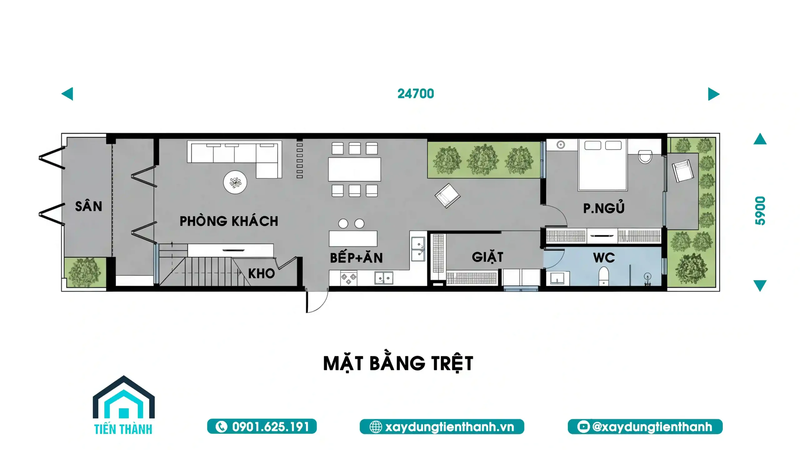 Chi tiết phân bổ không gian tầng trệt tối ưu diện tích sử dụng thực tế.