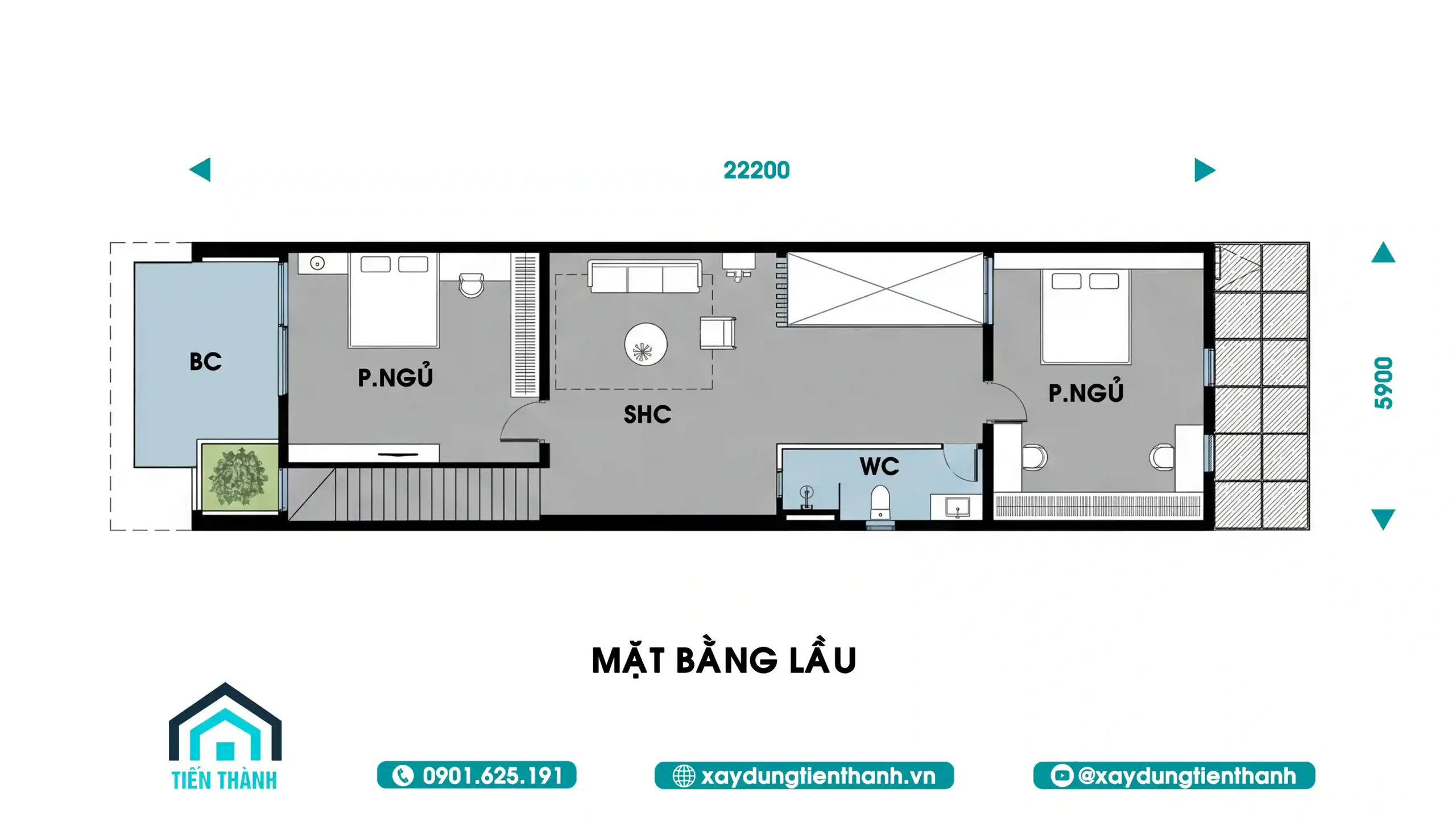 Tiếp nối sự tiện nghi của tầng trệt, mặt bằng tầng lầu của mẫu nhà ống 2 tầng mặt tiền 6m được thiết kế tập trung hoàn toàn vào sự nghỉ ngơi và gắn kết thành viên trong gia đình. Với chiều ngang 6m, việc bố trí hành lang và các phòng chức năng trở nên dễ dàng hơn, tránh được cảm giác chật hẹp thường thấy ở các ngôi nhà phố nhỏ.
