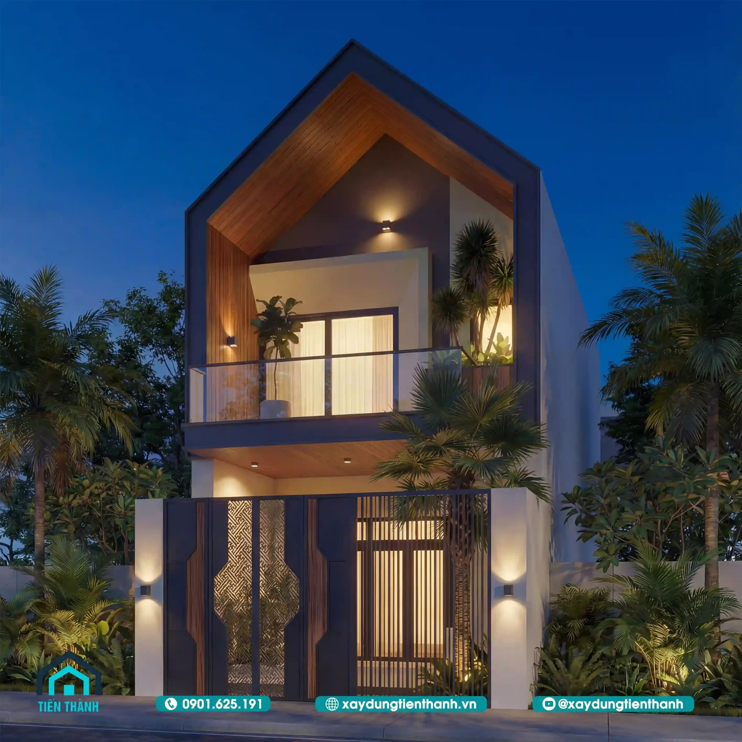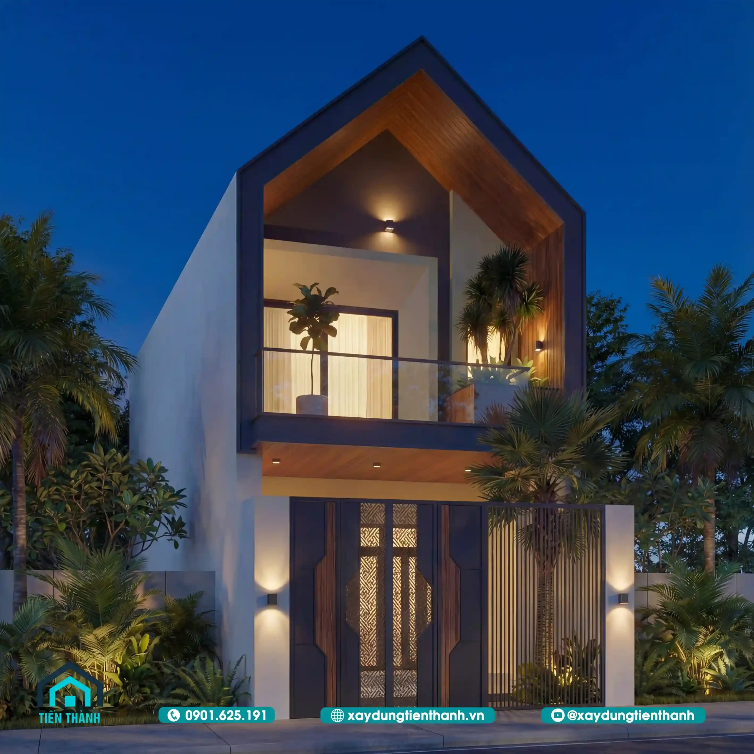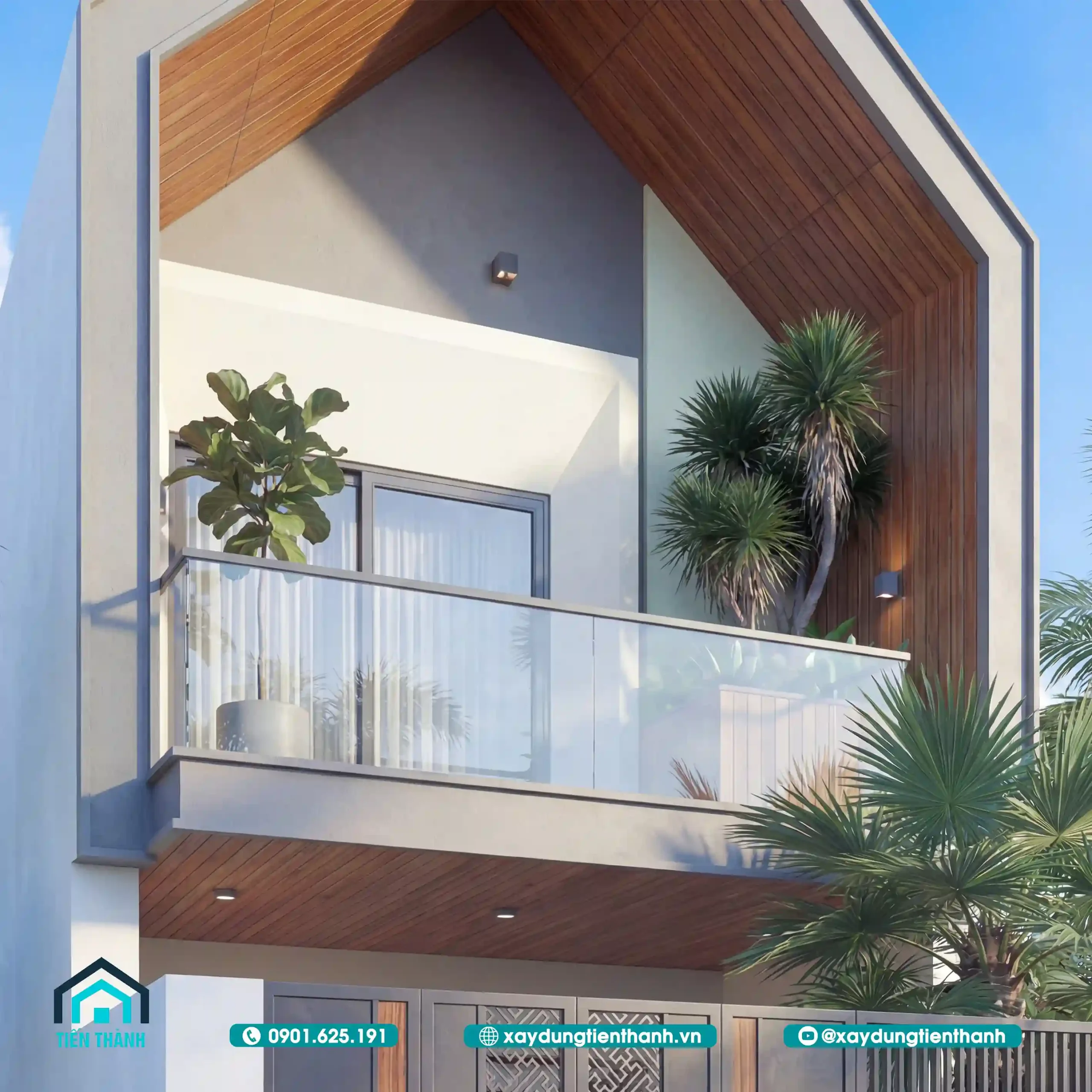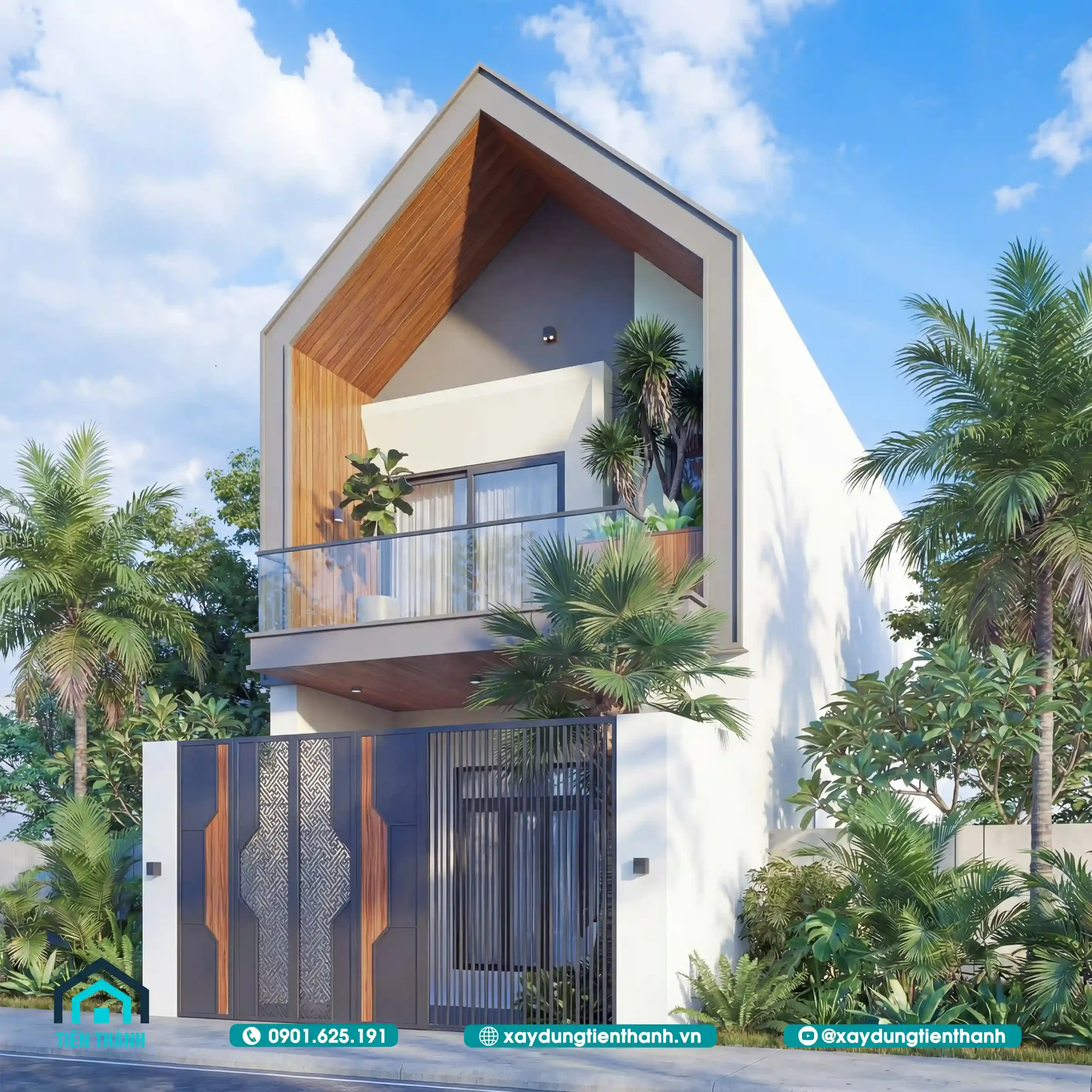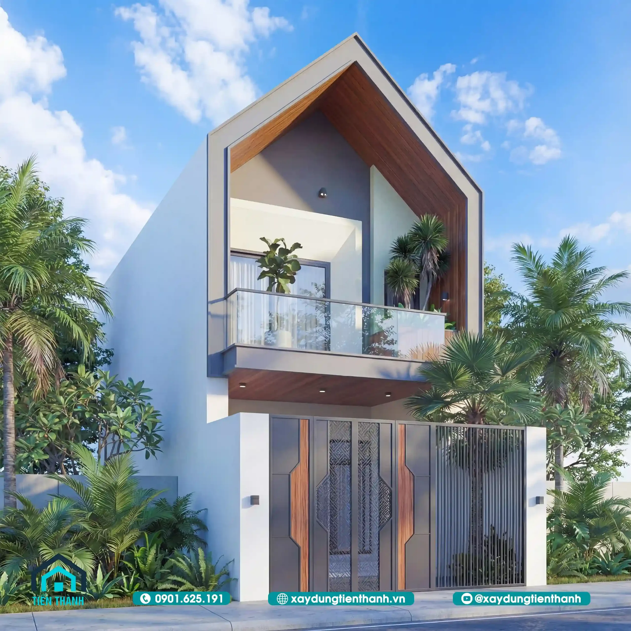 Phối cảnh chính diện nhà phố hiện đại với mái chữ A và ban công xanh mát ban ngày.