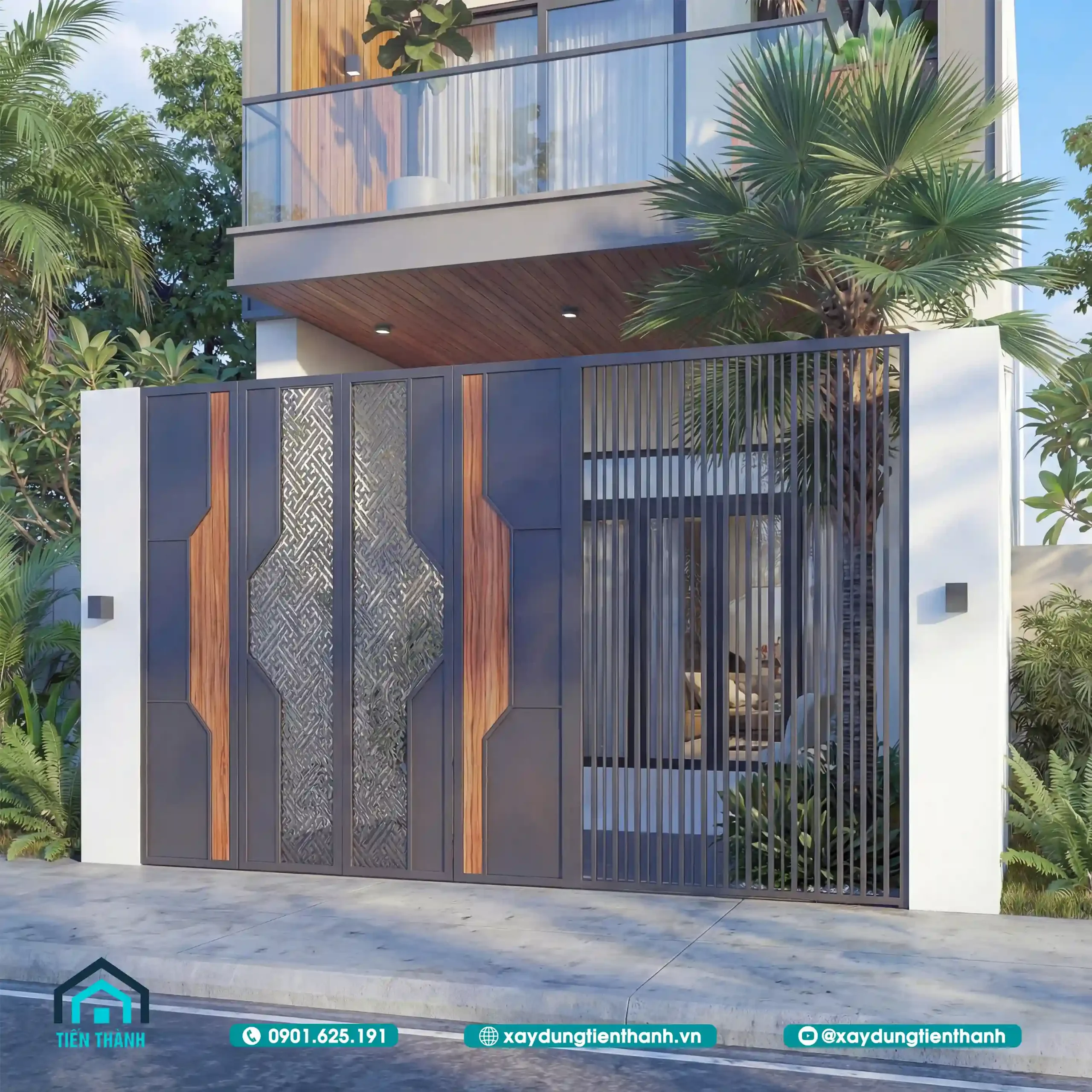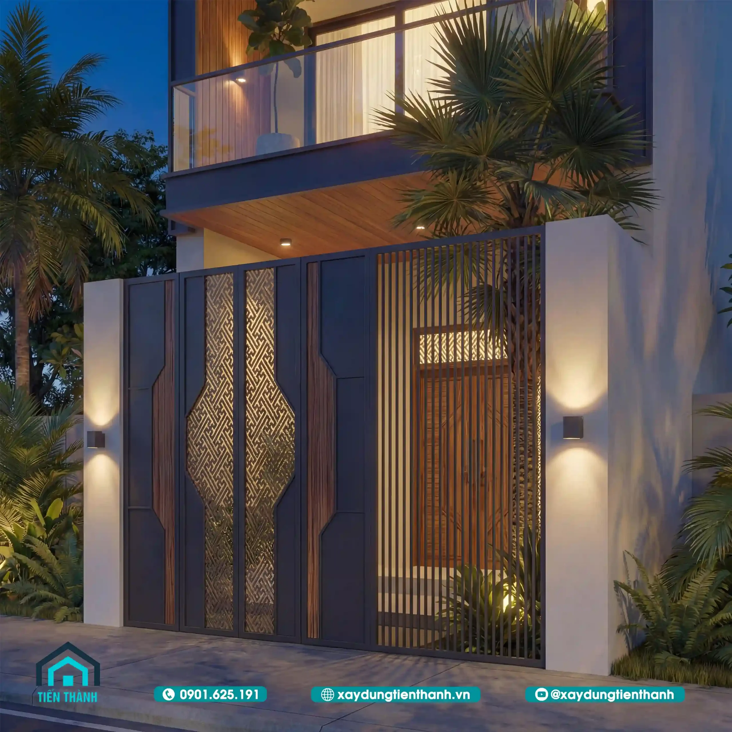 Cổng chính được thiết kế tinh tế với họa tiết cắt laser và lam sắt.