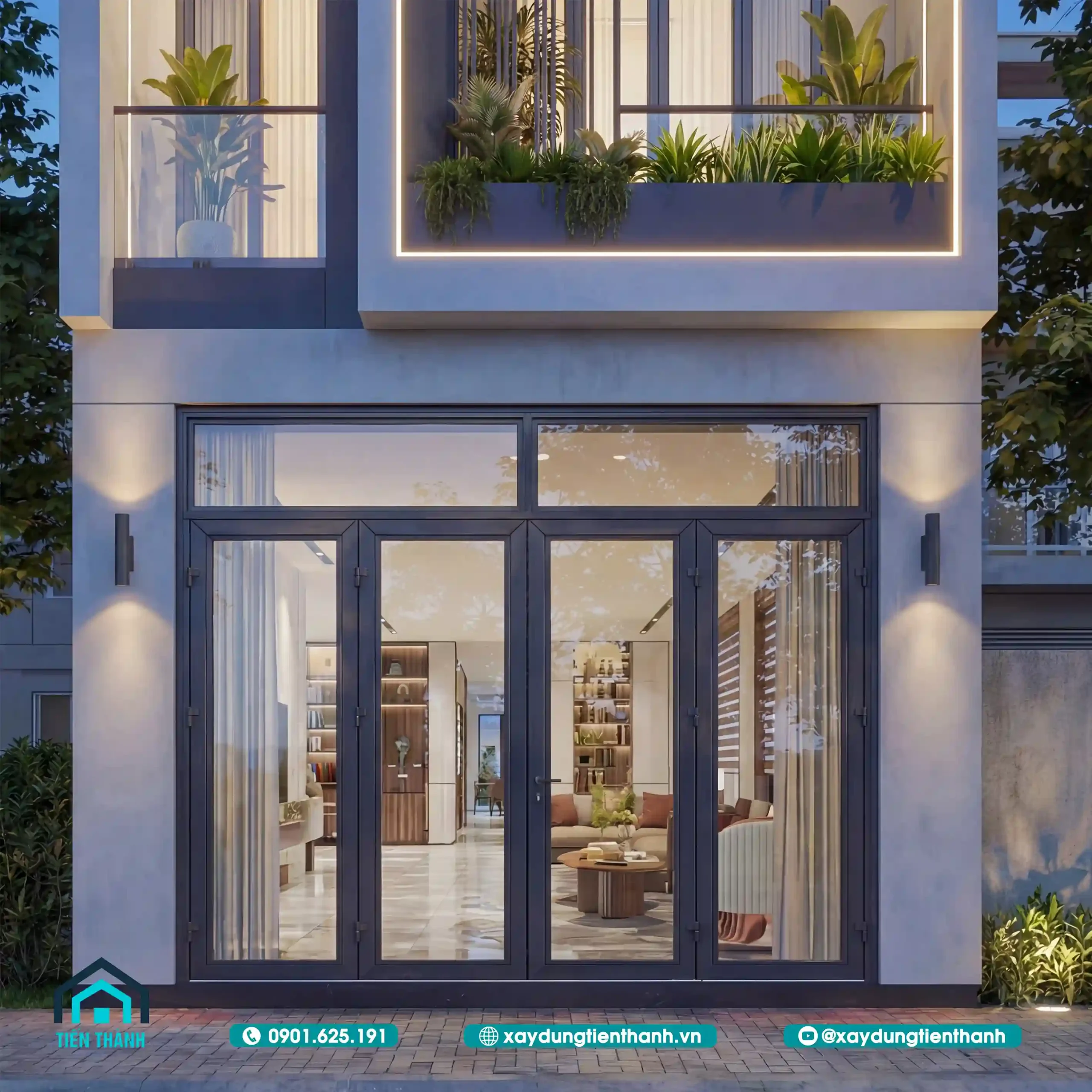 Cận cảnh tầng trệt với hệ cửa kính bốn cánh mở rộng sang trọng, tinh tế.