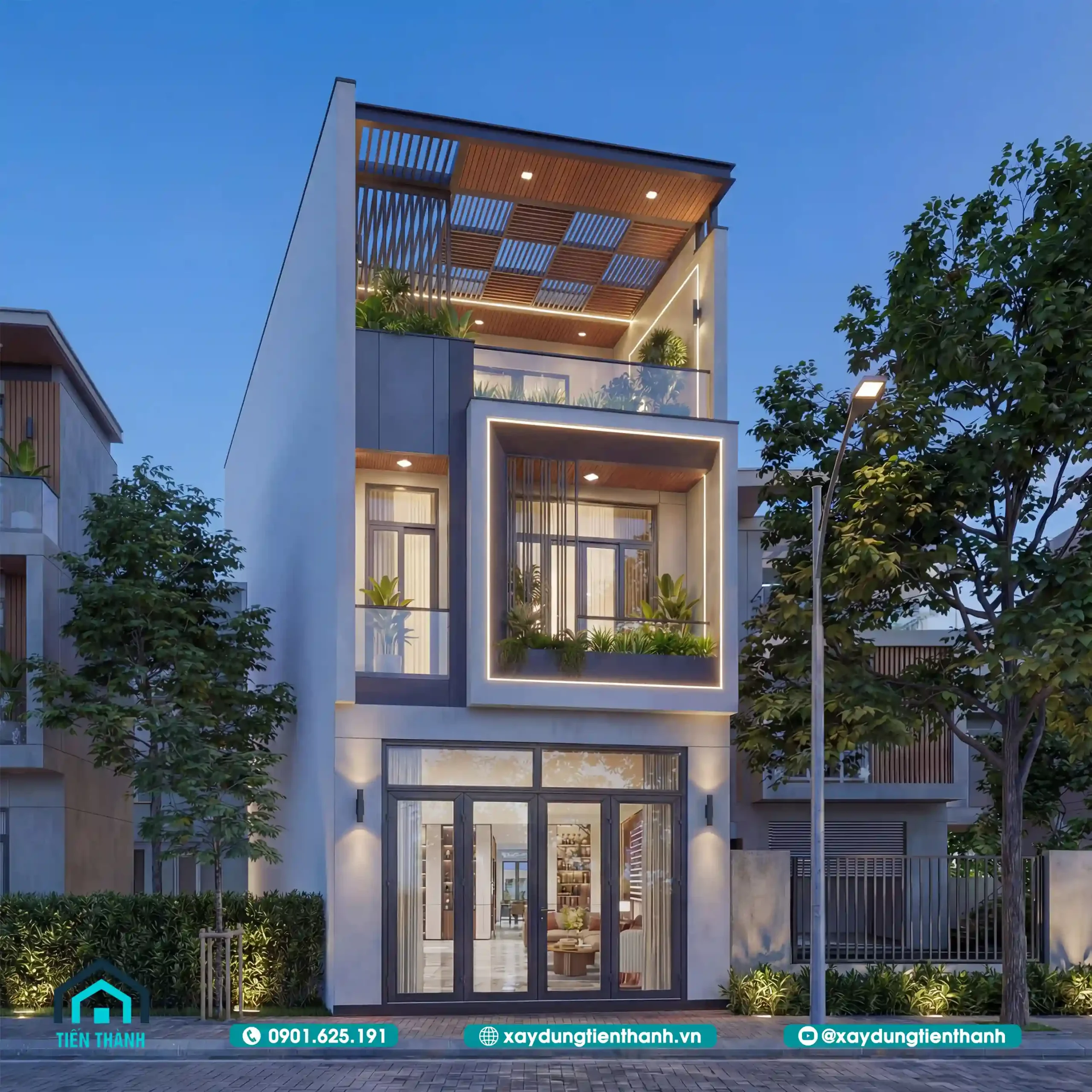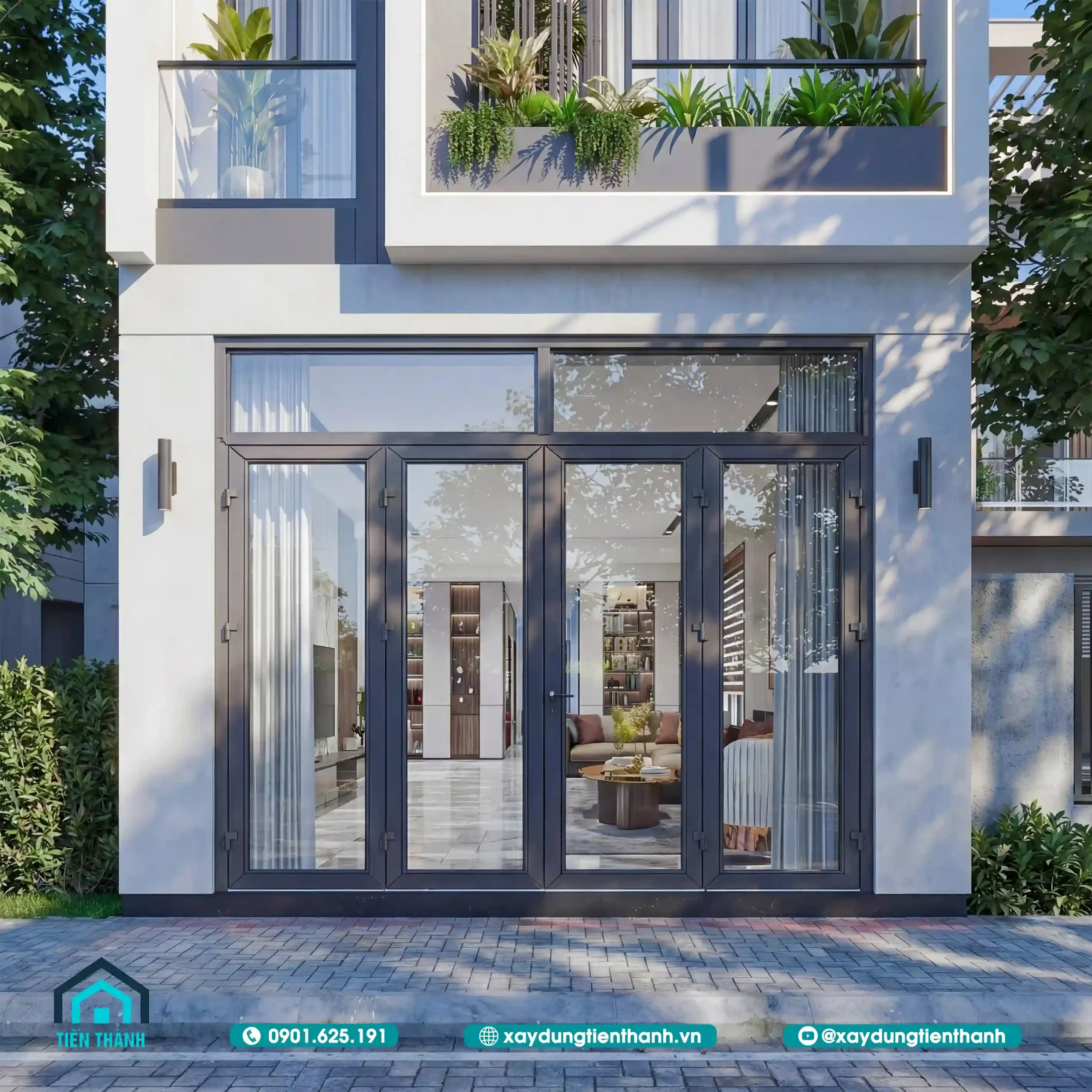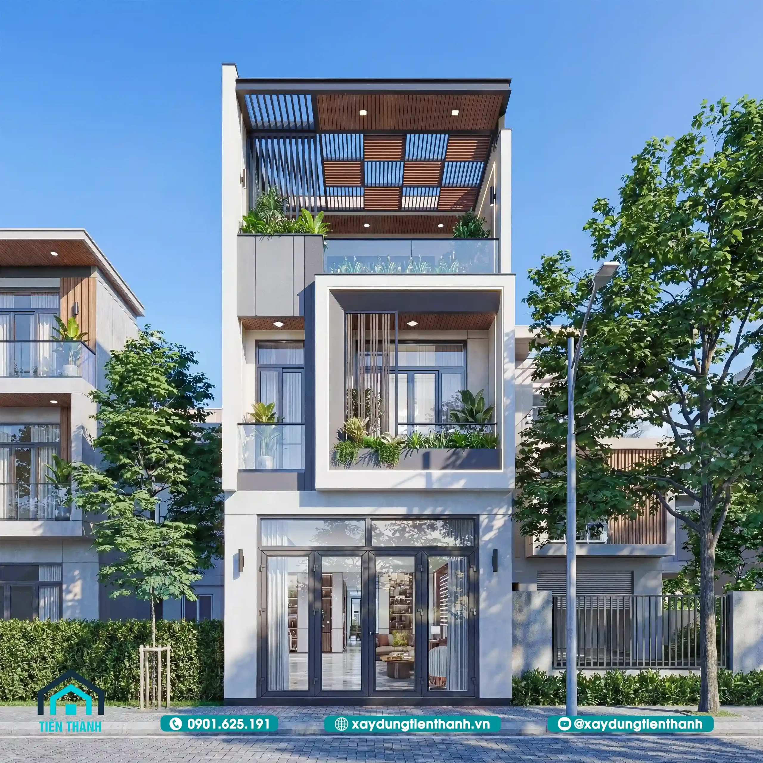 Sự kết hợp giữa tông màu trắng chủ đạo, điểm xuyết màu xám trung tính và các mảng ốp gỗ nhựa ngoài trời tạo nên một diện mạo thanh lịch. Hệ thống cửa kính cường lực khung nhôm xingfa bản lớn giúp tối ưu ánh sáng tự nhiên, mang lại sự thông thoáng tối đa cho không gian bên trong.