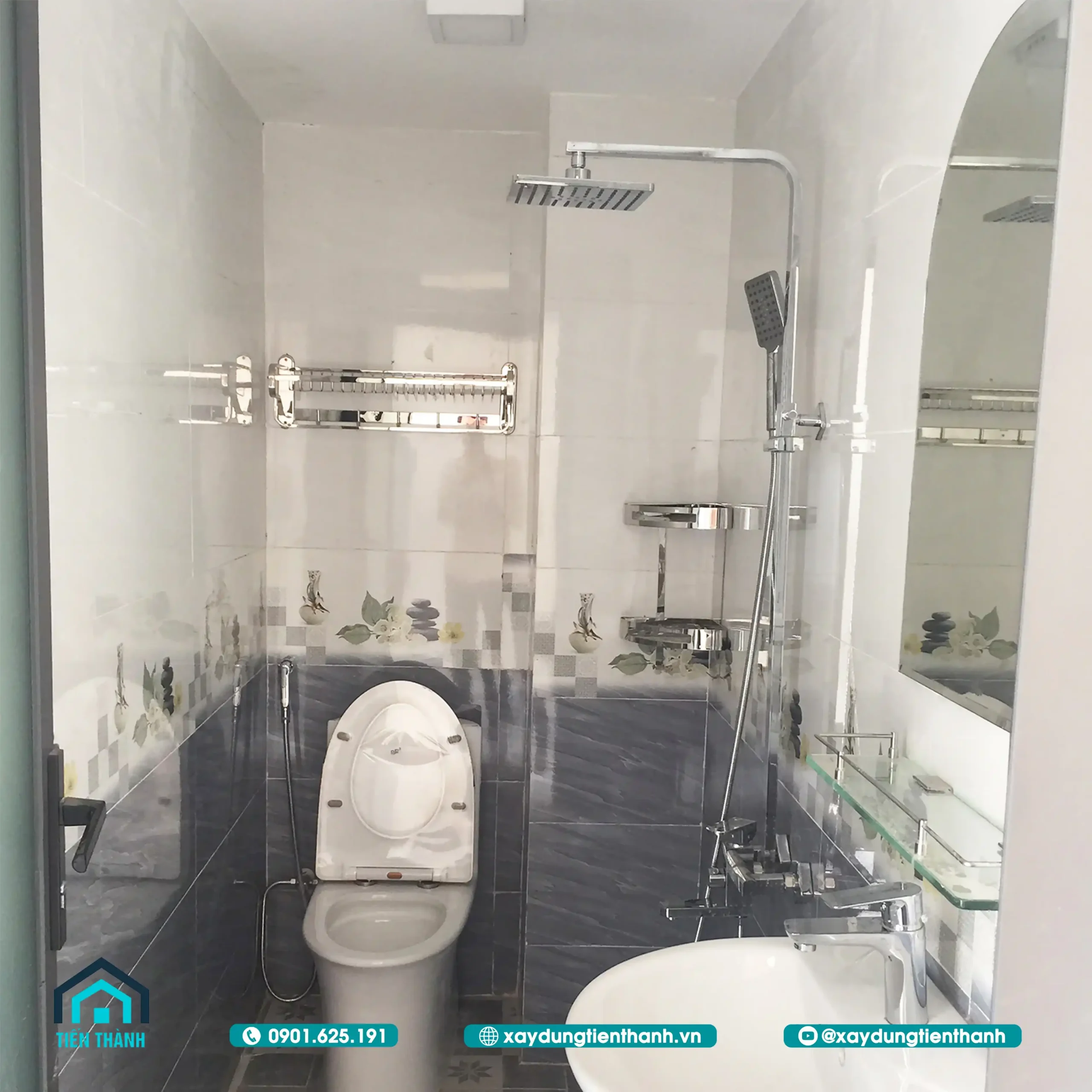 Không gian nhà vệ sinh đầy đủ tiện nghi với vòi sen cây và gương soi.