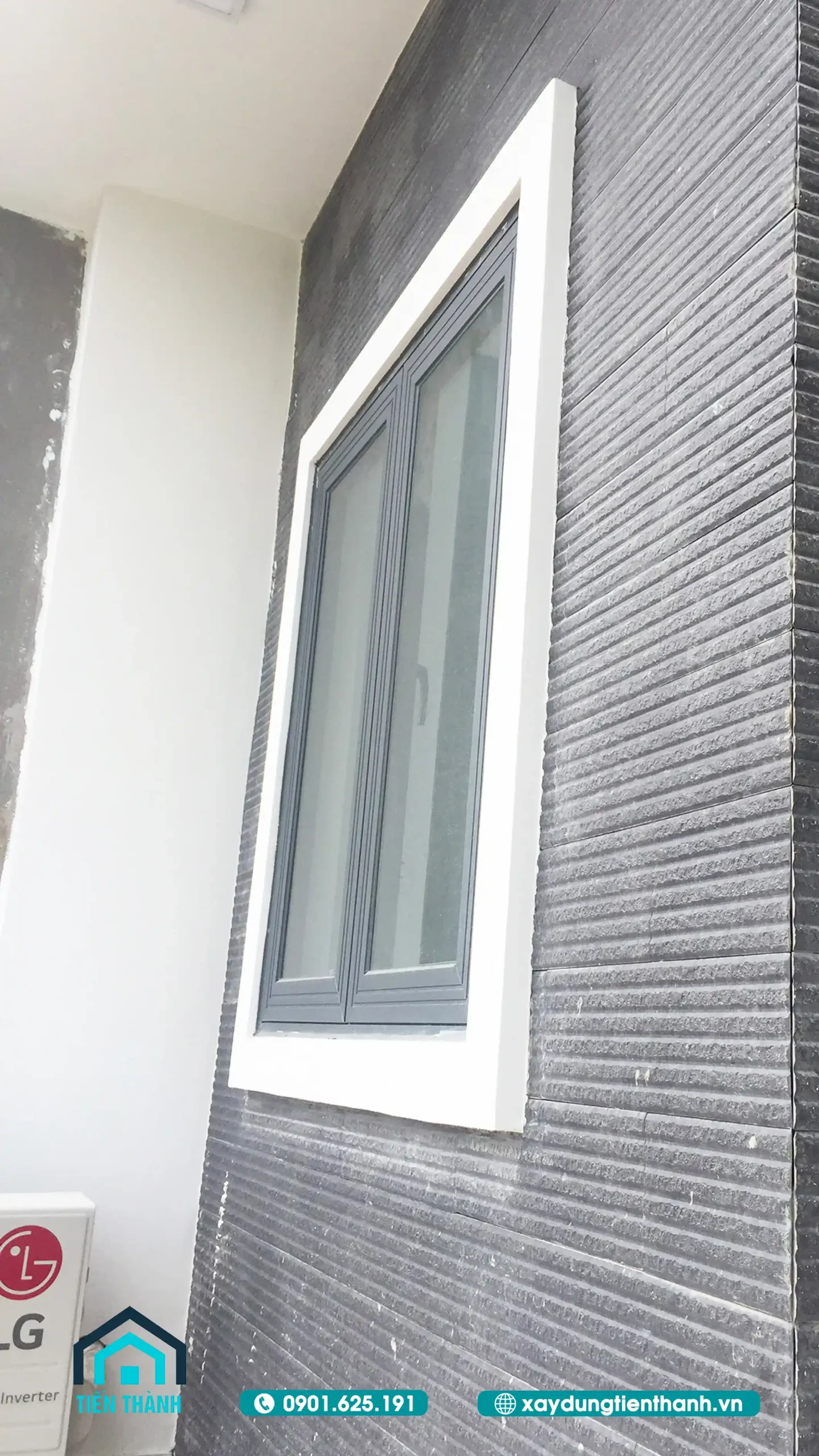 Cận cảnh cửa sổ nhôm kính xám trên nền tường ốp gạch thẻ trang trí.