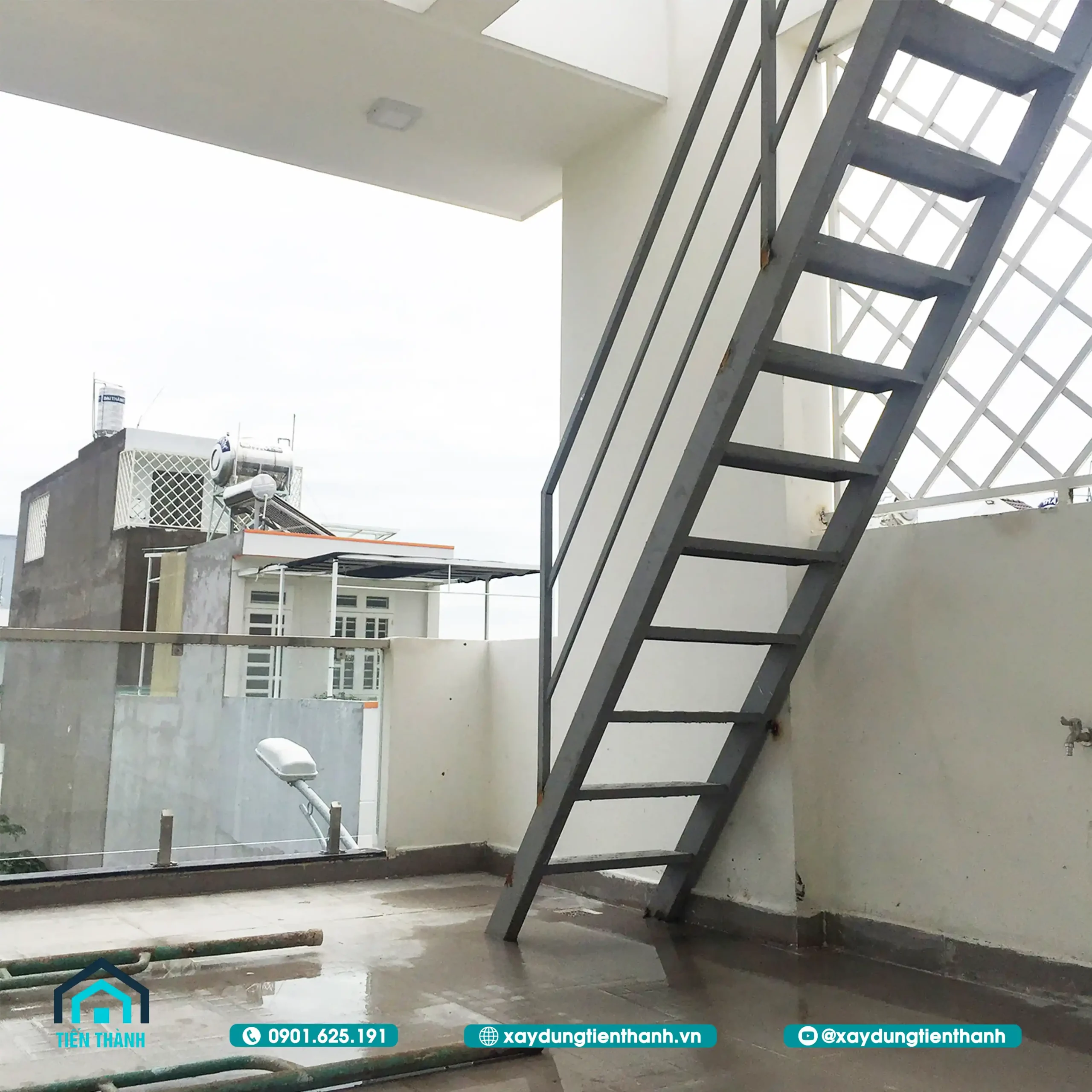 Khu vực sân thượng có cầu thang sắt dẫn lên mái để kiểm tra kỹ thuật.