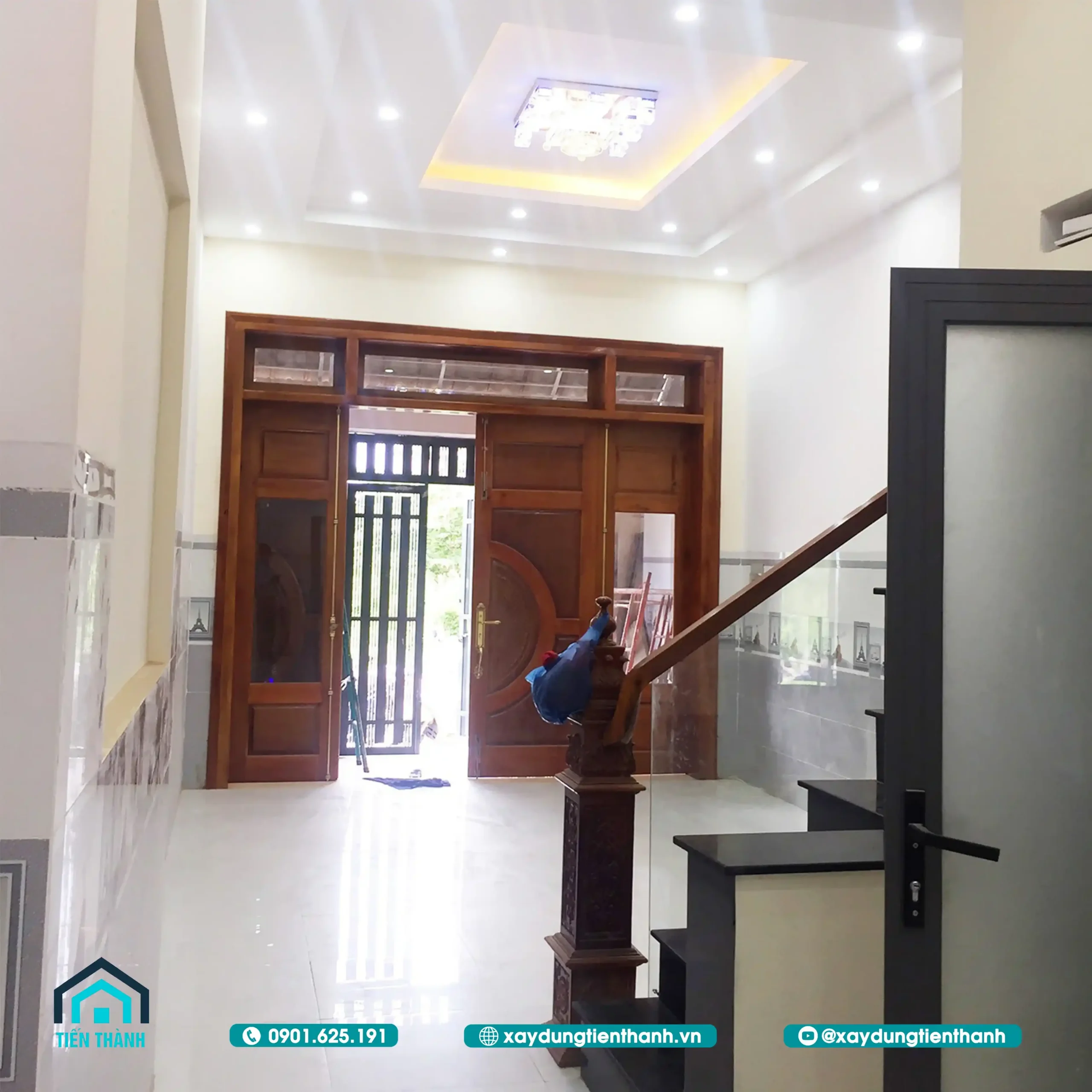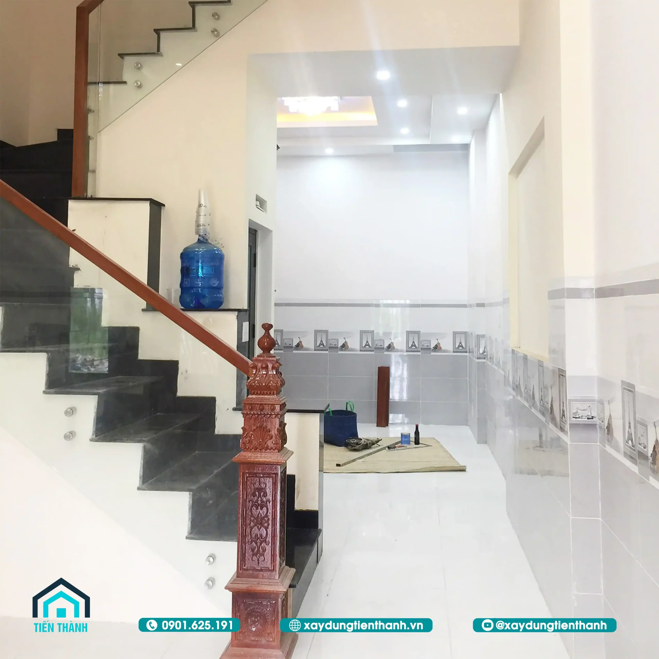 Không gian hành lang nội thất tầng trệt rộng rãi với nền gạch trắng sáng.
