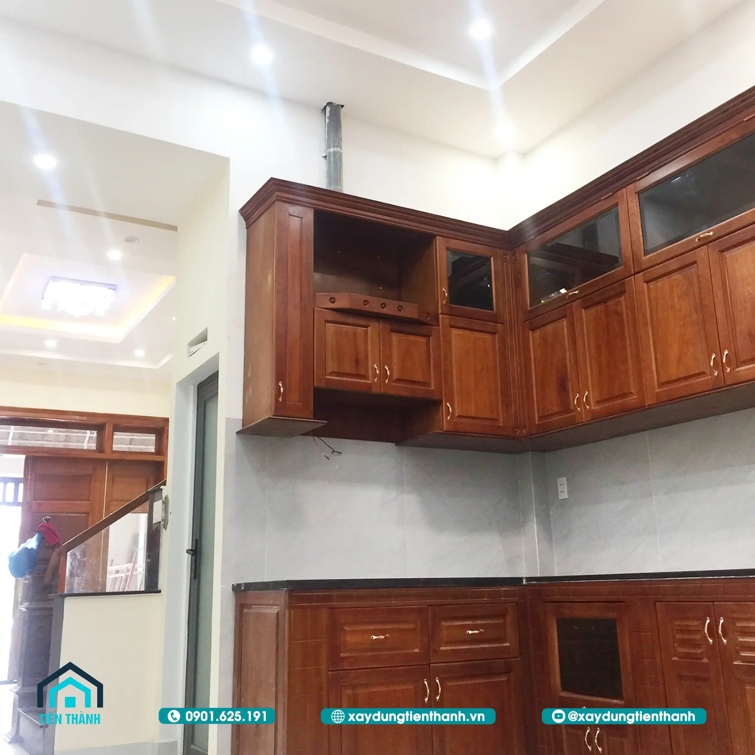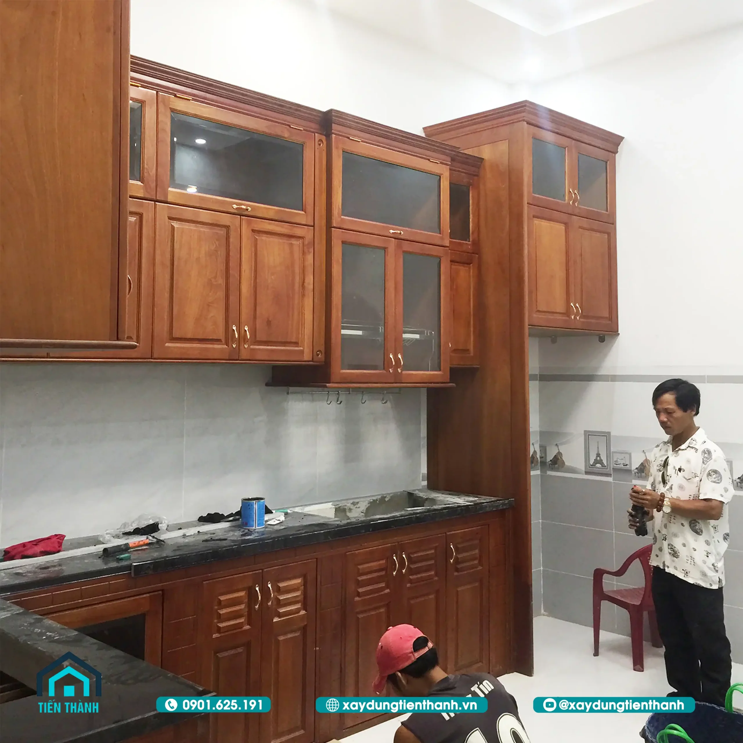 Hệ tủ bếp bằng gỗ tự nhiên cao cấp đang trong quá trình lắp đặt xong.