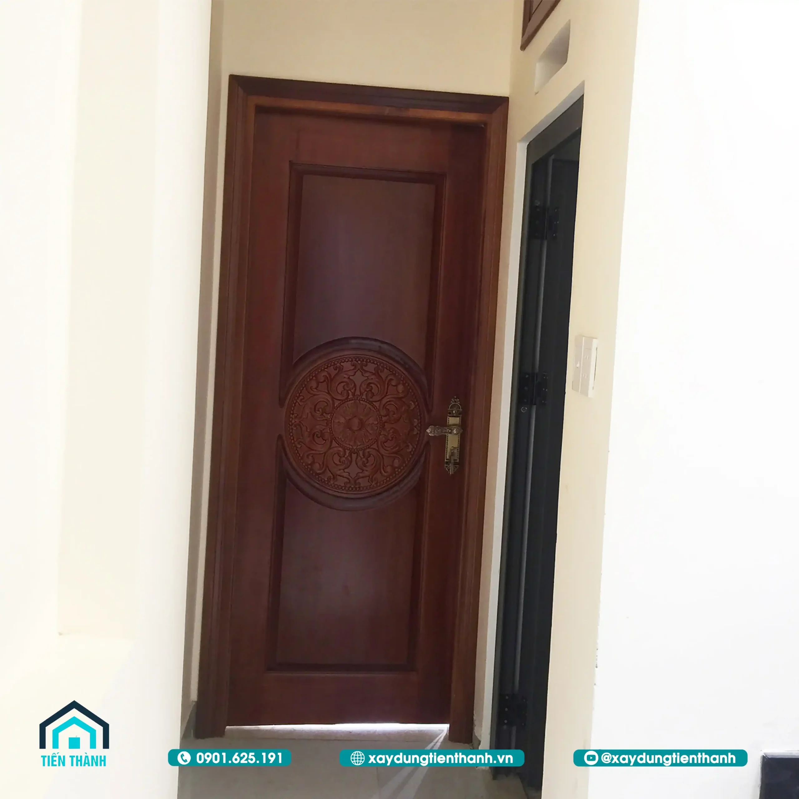 Cửa phòng ngủ bằng gỗ tự nhiên với họa tiết điêu khắc tròn tinh xảo.