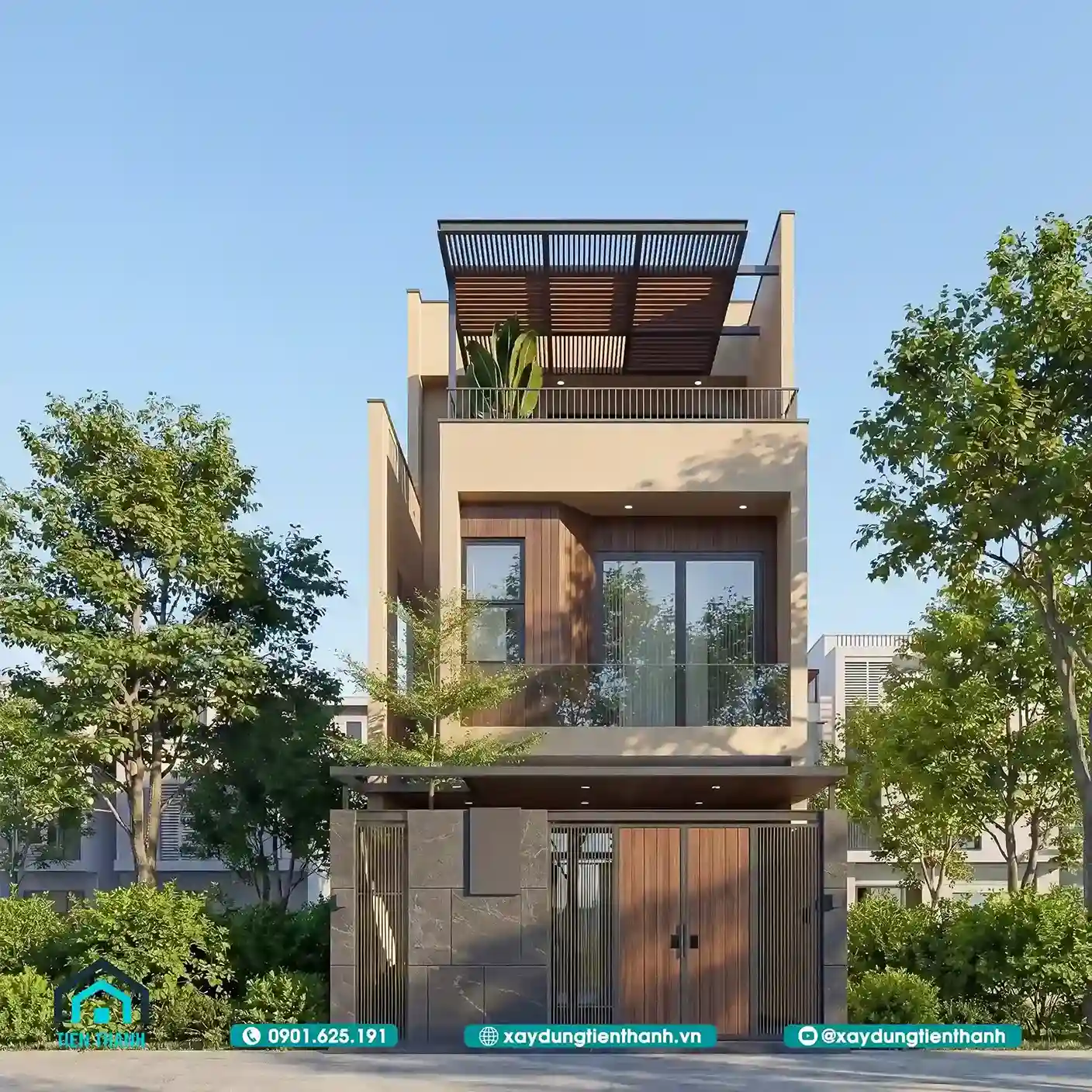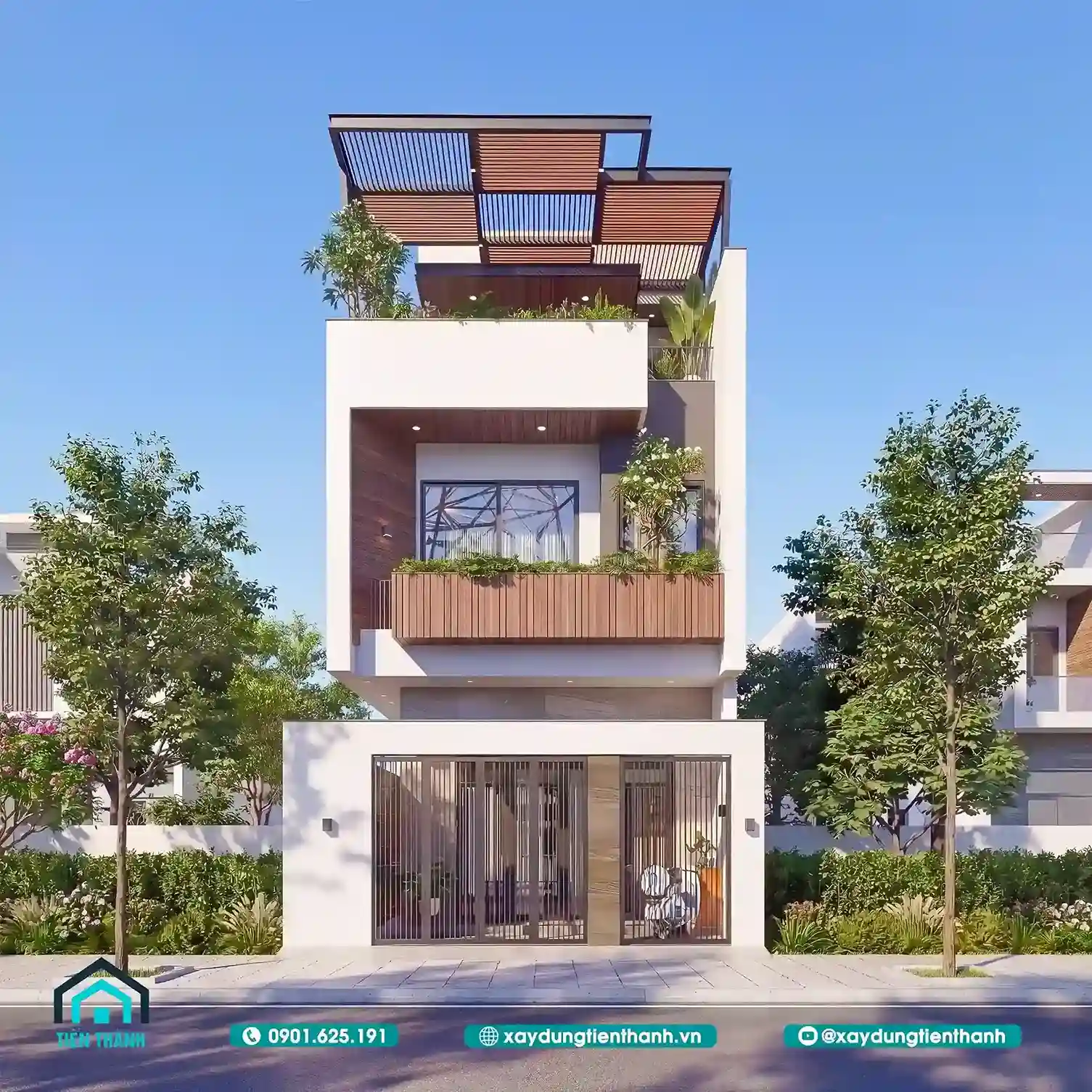 Mẫu nhà 3 tầng hiện đại thường sử dụng các mảng khối giật cấp để tạo chiều sâu. Sự kết hợp giữa tông màu trắng và nâu gỗ mang lại vẻ đẹp ấm áp và đẳng cấp. Đây là lựa chọn lý tưởng cho những ai yêu thích sự phá cách trong kiến trúc.
