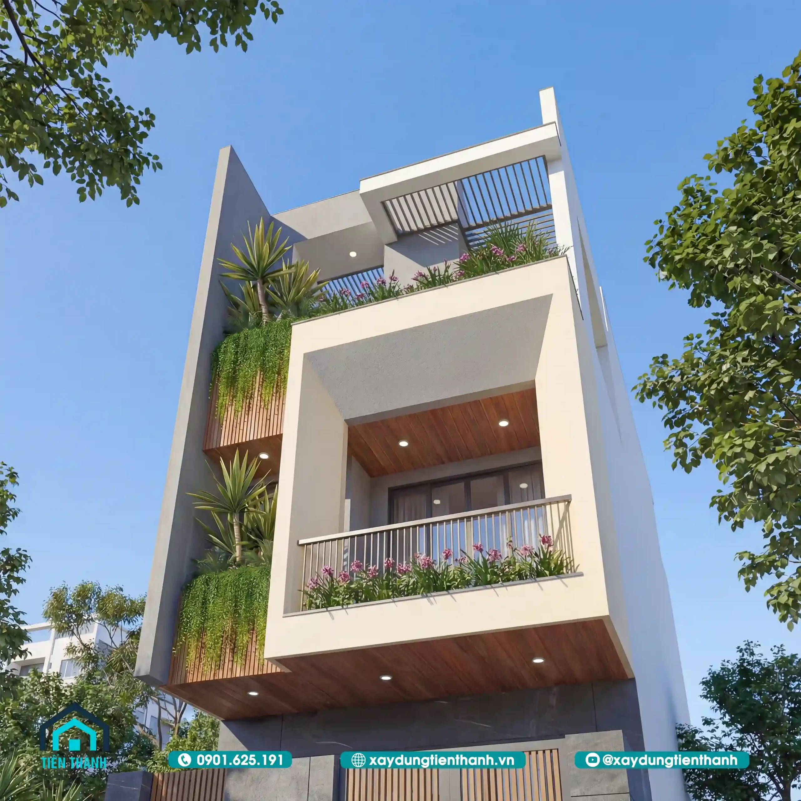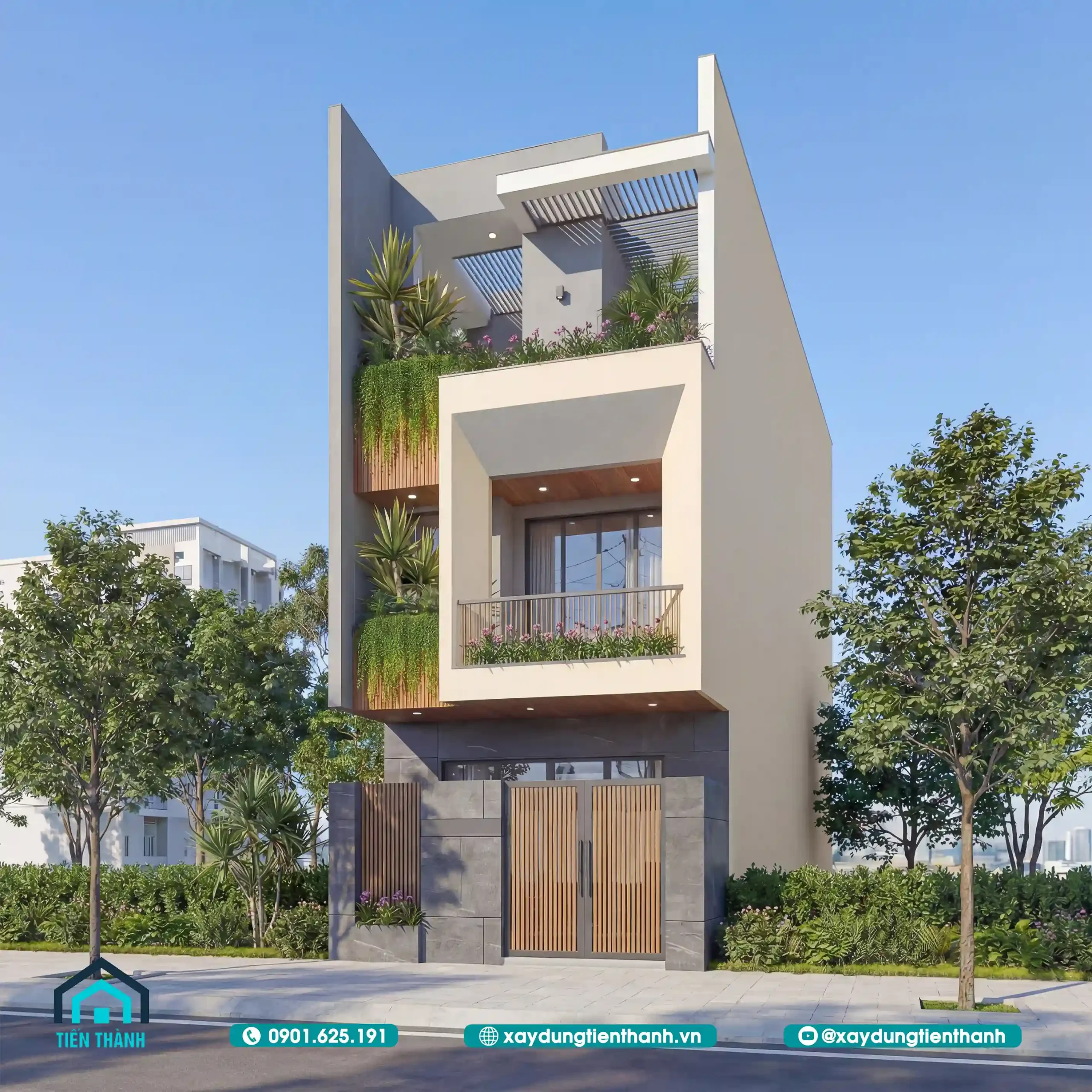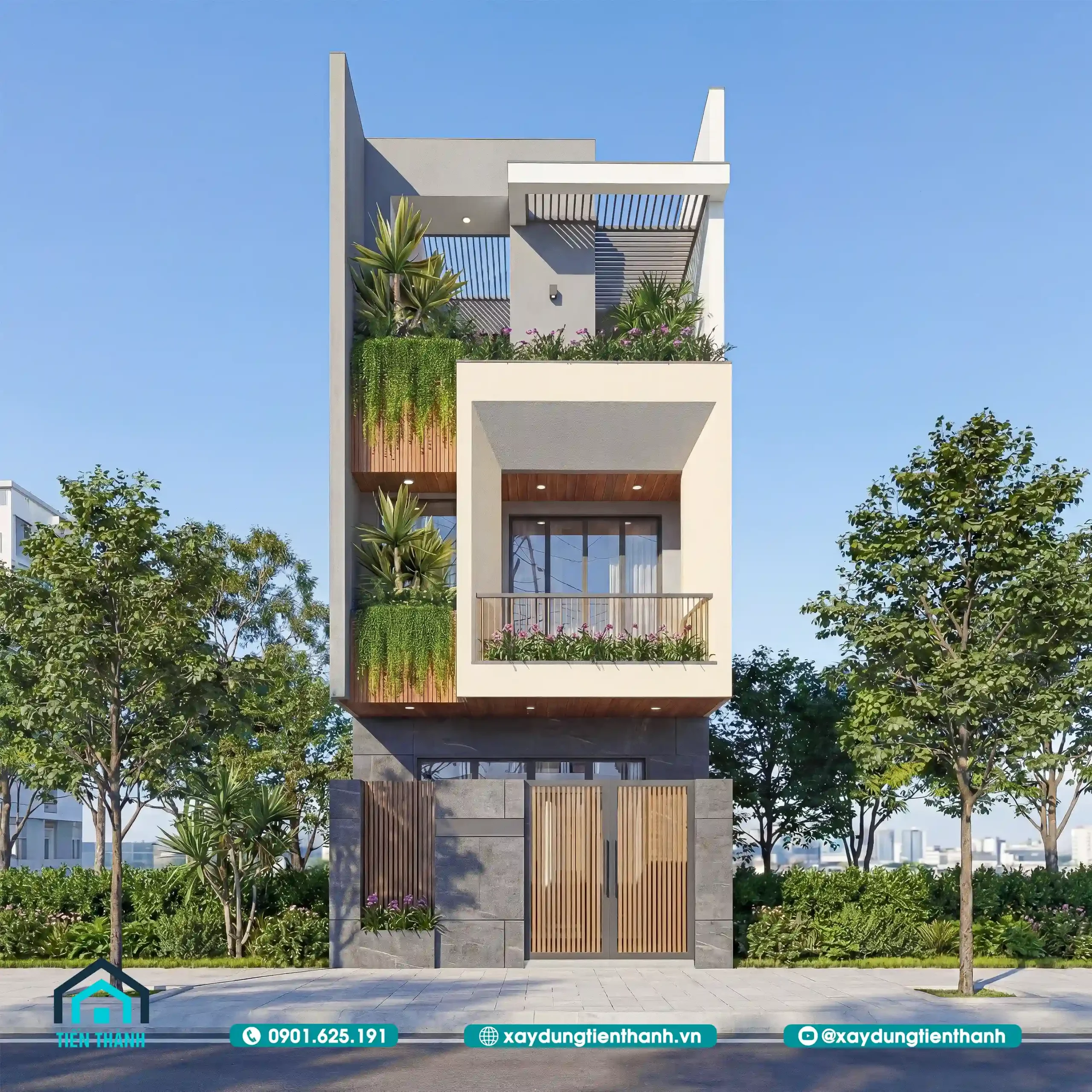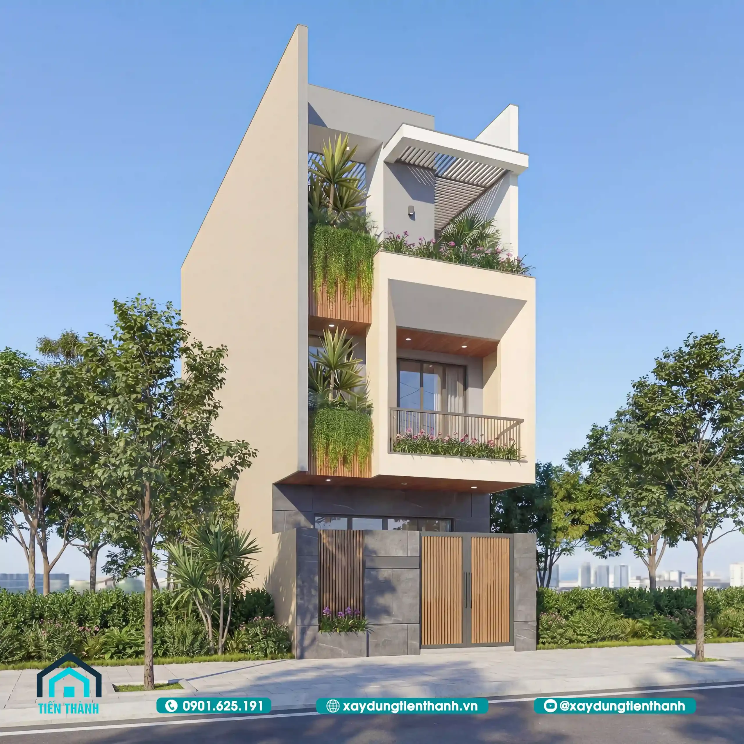 Nhà phố hiện đại ba tầng với thiết kế không gian xanh, tông màu kem và gỗ ấm áp.