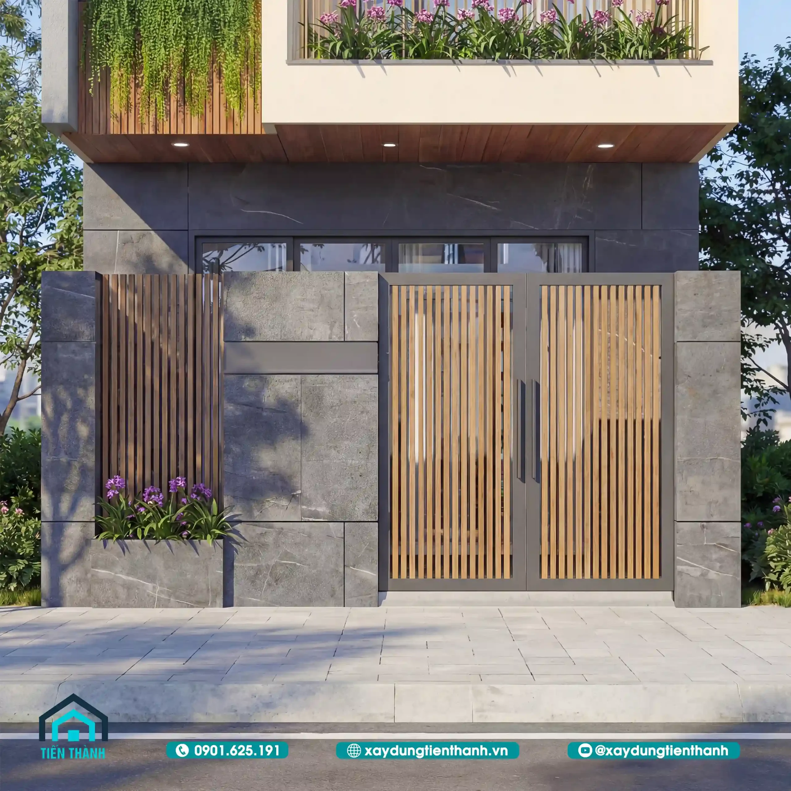 Cận cảnh hệ cổng và hàng rào sử dụng vật liệu đá và gỗ tinh tế.
