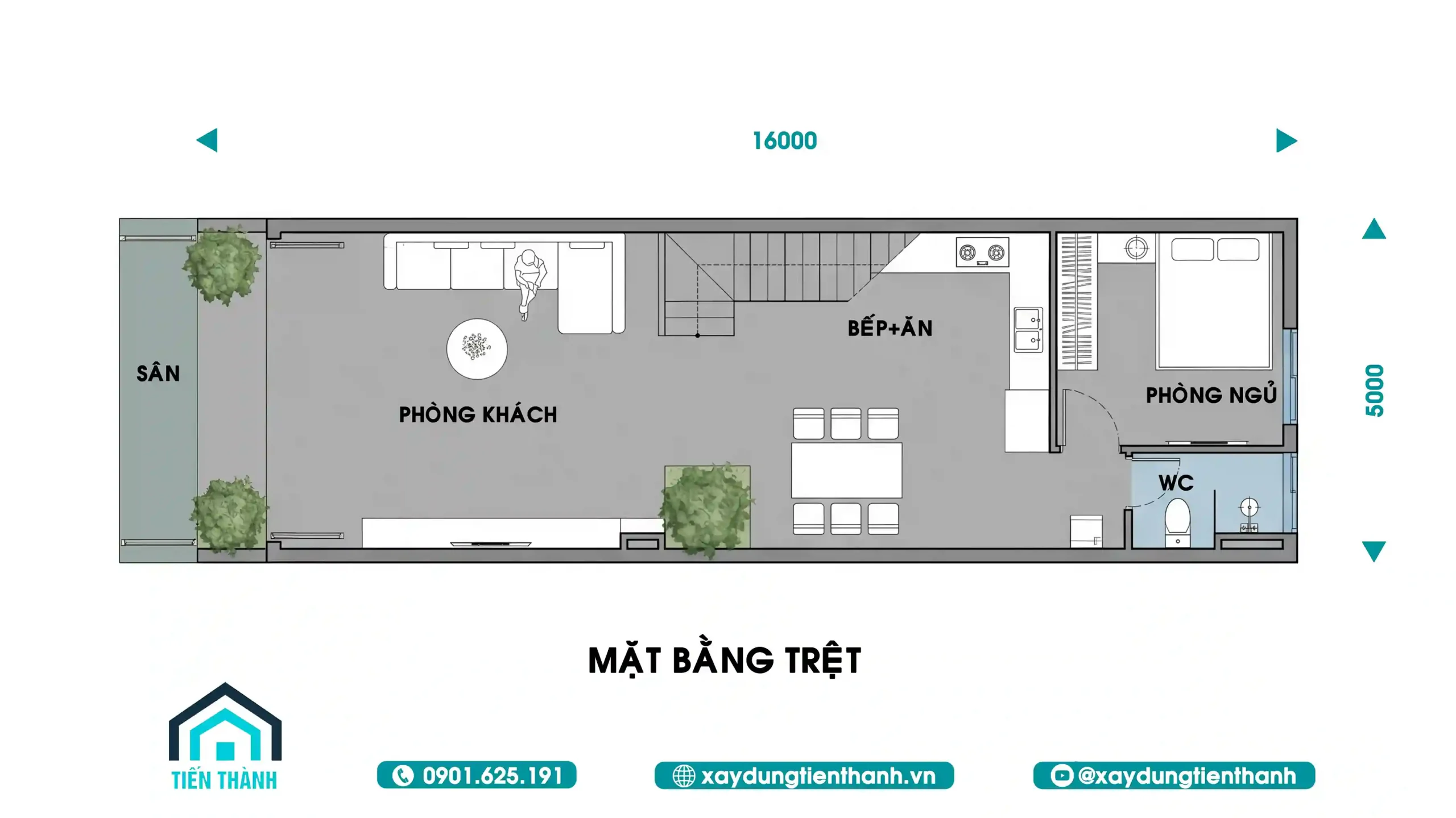 Bản vẽ mặt bằng tầng trệt nhà 5x16m bố trí phòng khách, bếp ăn và một phòng ngủ phụ.