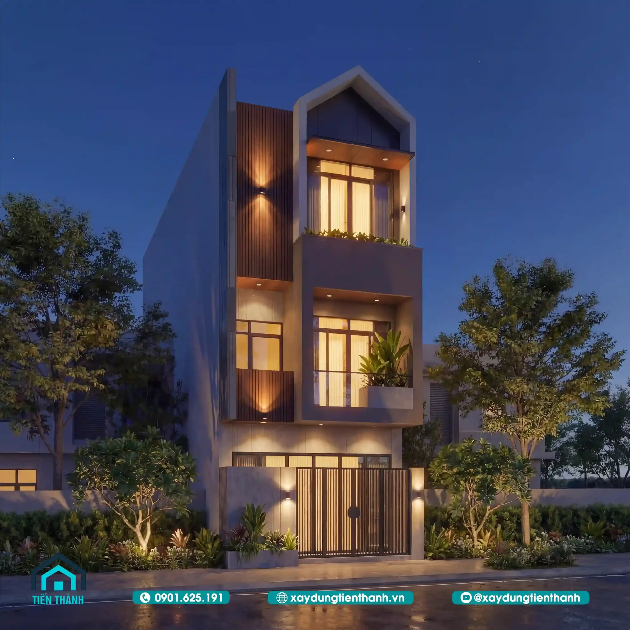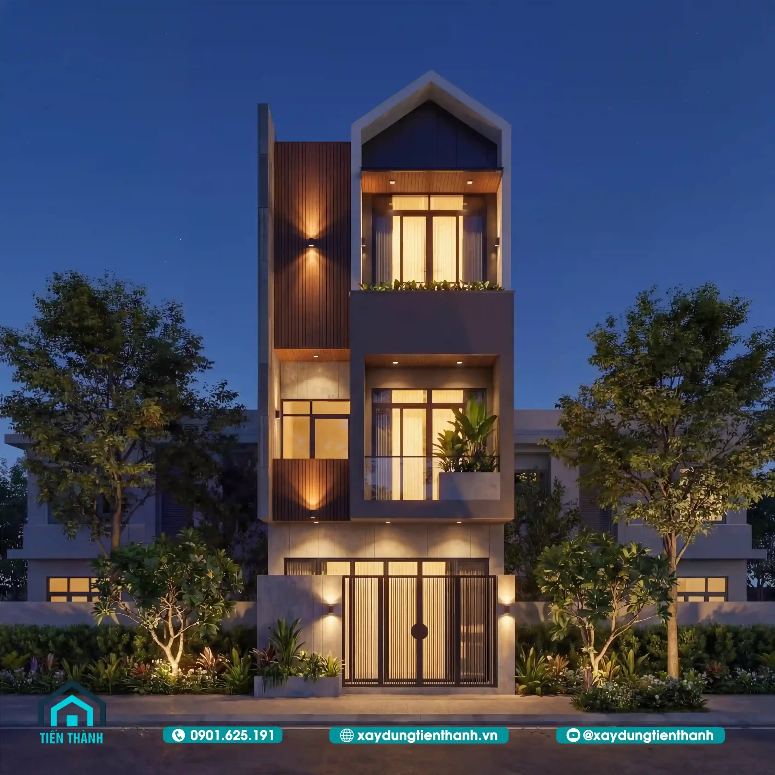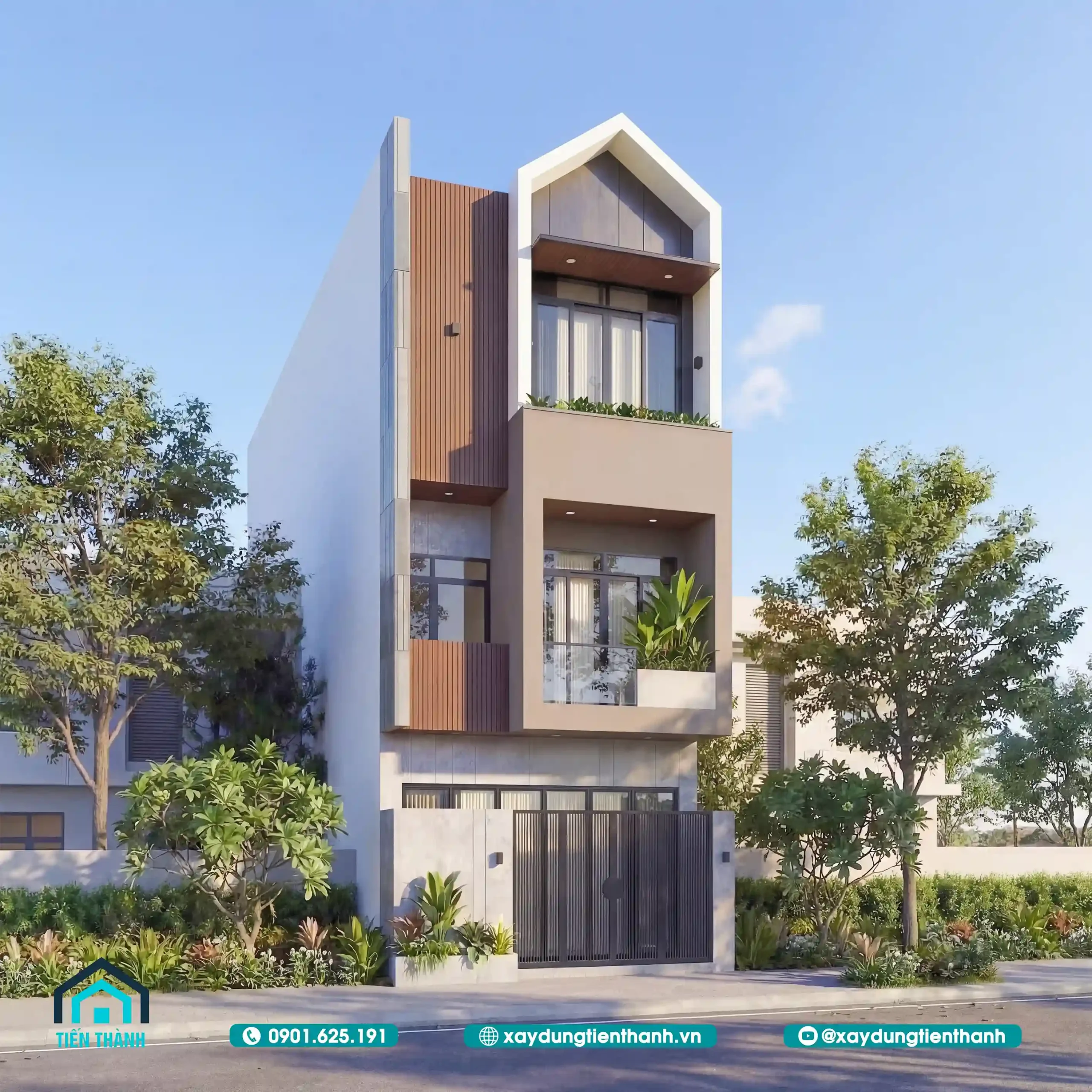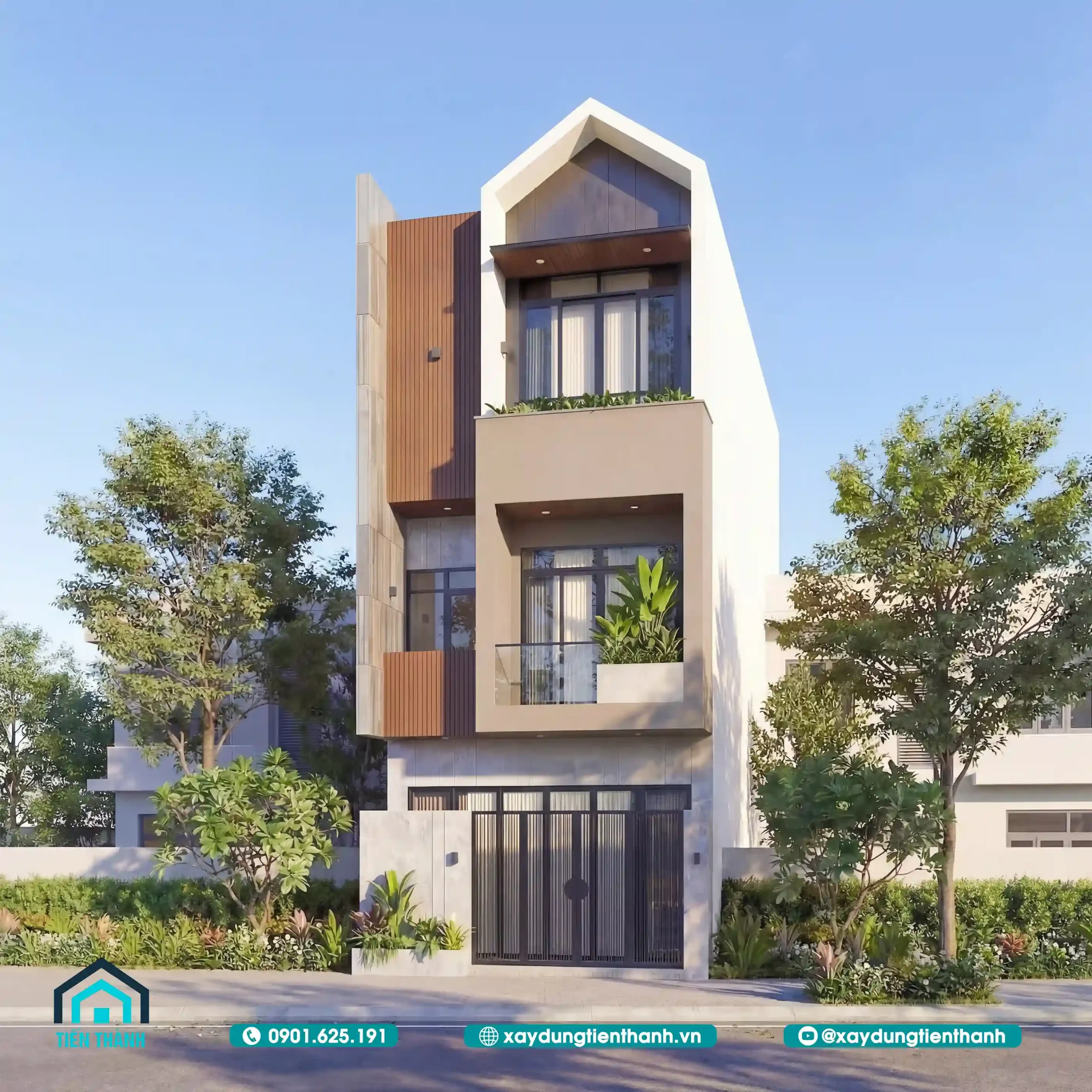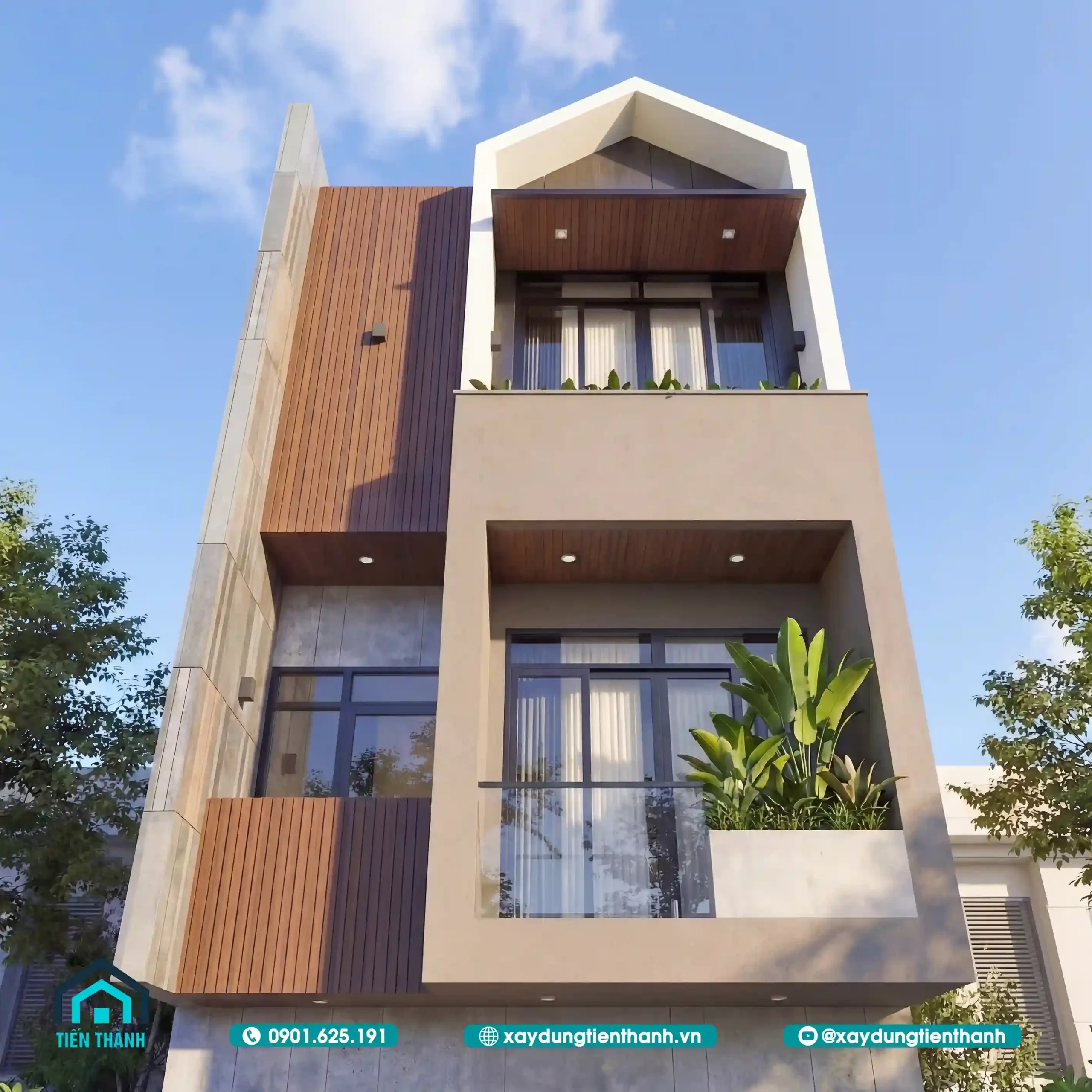 Nhà phố hiện đại ba tầng với mặt tiền ốp gỗ, ban công xanh và mái chữ A.