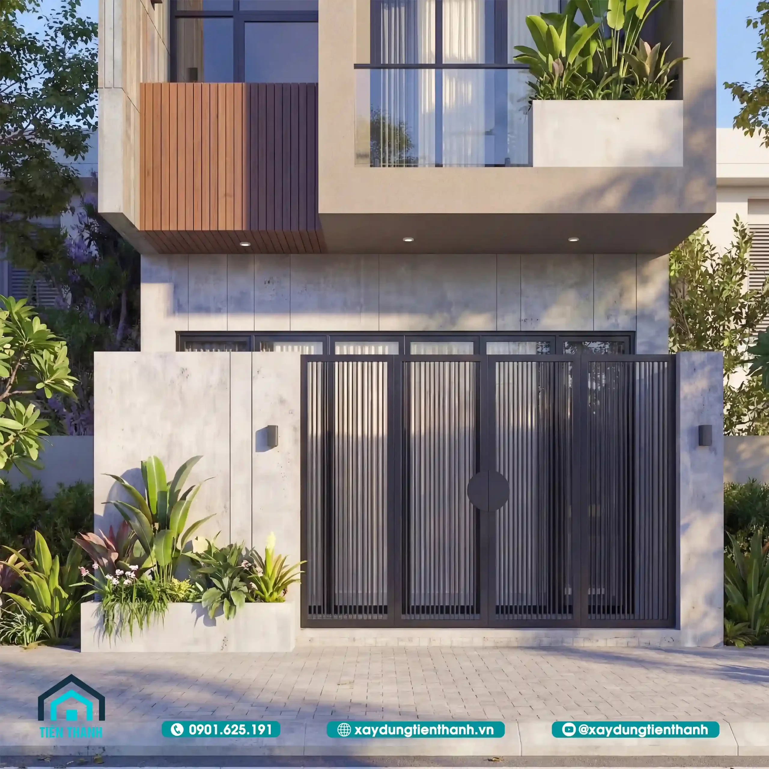 Mẫu thiết kế này gây ấn tượng mạnh mẽ bởi sự phân chia hình khối rõ ràng. Tầng 2 và tầng 3 được thiết kế giật cấp, tạo khoảng hở cho ban công và bồn hoa, giúp ngôi nhà trông thanh thoát hơn hẳn so với các mẫu nhà ống truyền thống. Sự đan xen giữa tông màu xám trung tính, màu nâu ấm của gỗ ốp tường và hệ cửa kính khung đen tạo nên một tổng thể sang trọng. Hệ thống lam gỗ trang trí ở tầng 2 không chỉ tạo điểm nhấn. Mà còn giúp điều tiết ánh sáng và sự riêng tư cho phòng ngủ phía trong.