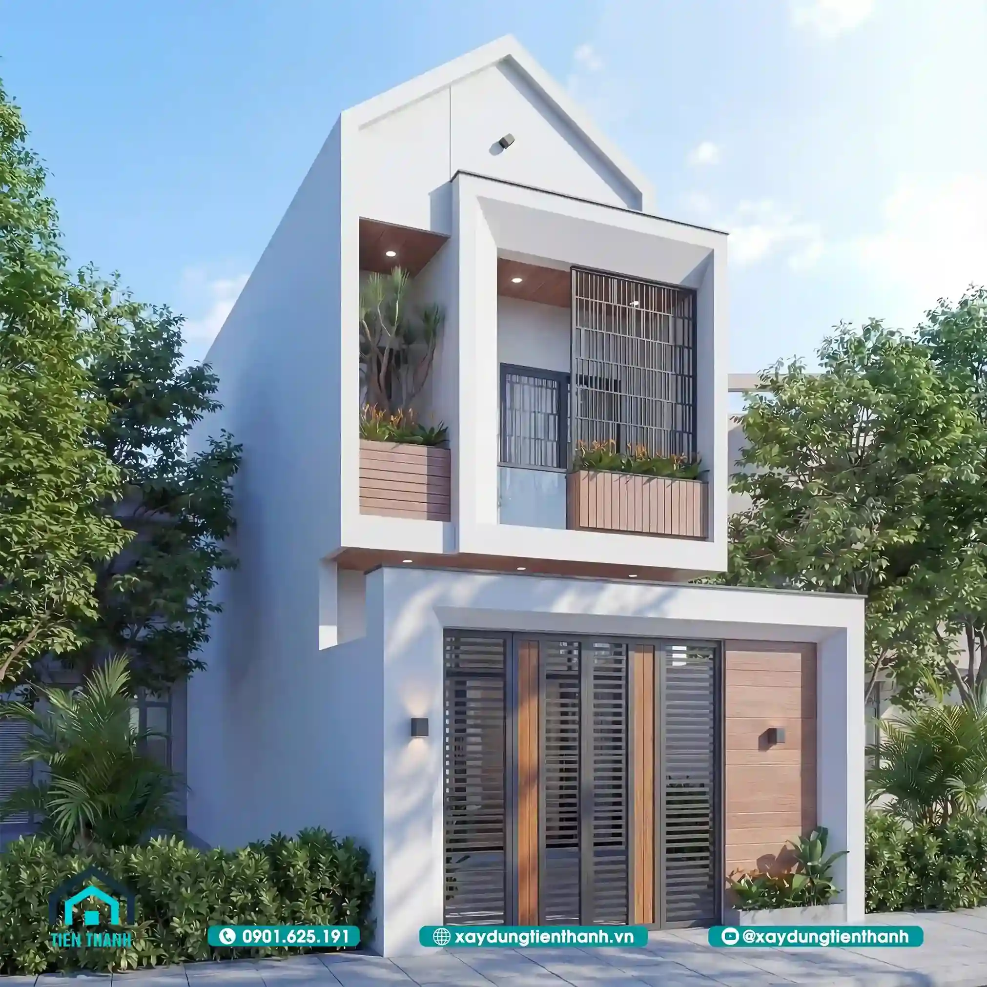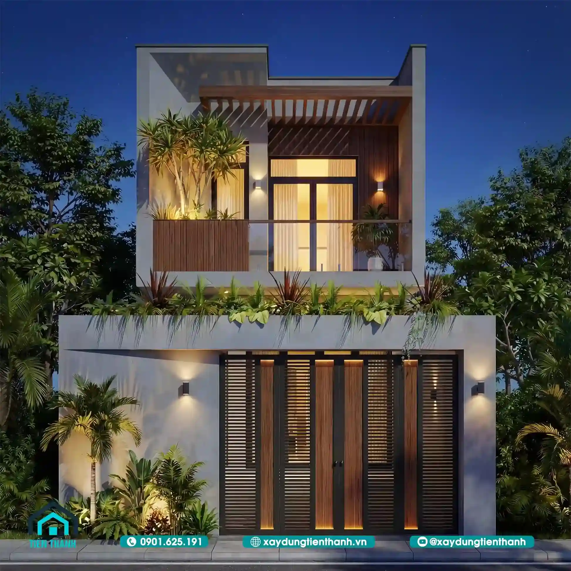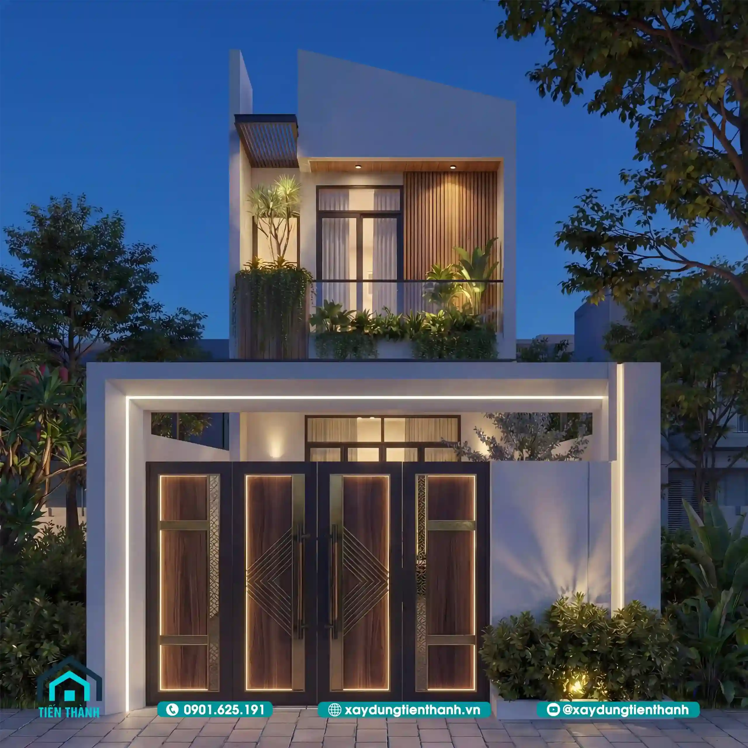 Nhà phố hai tầng hiện đại với mảng xanh ban công và ánh sáng đẹp.