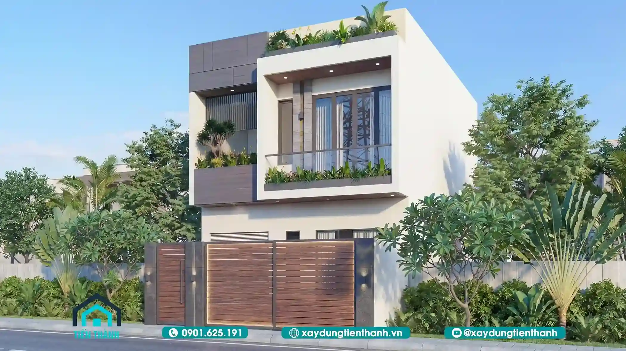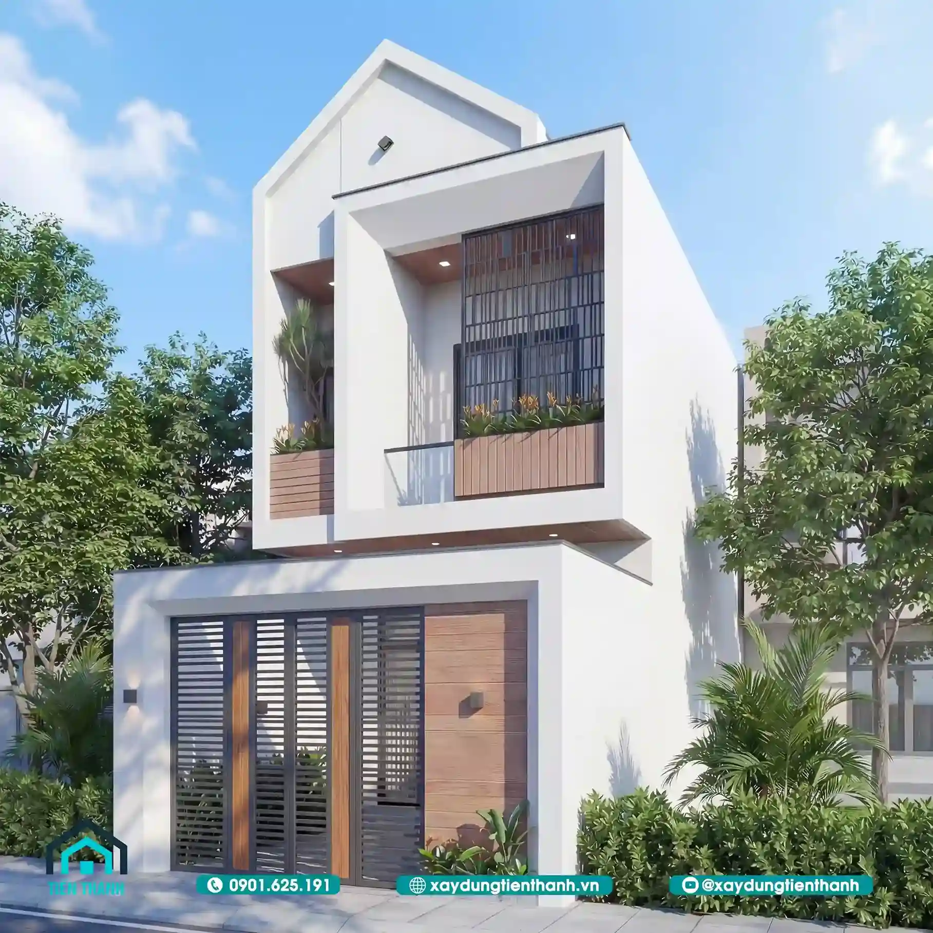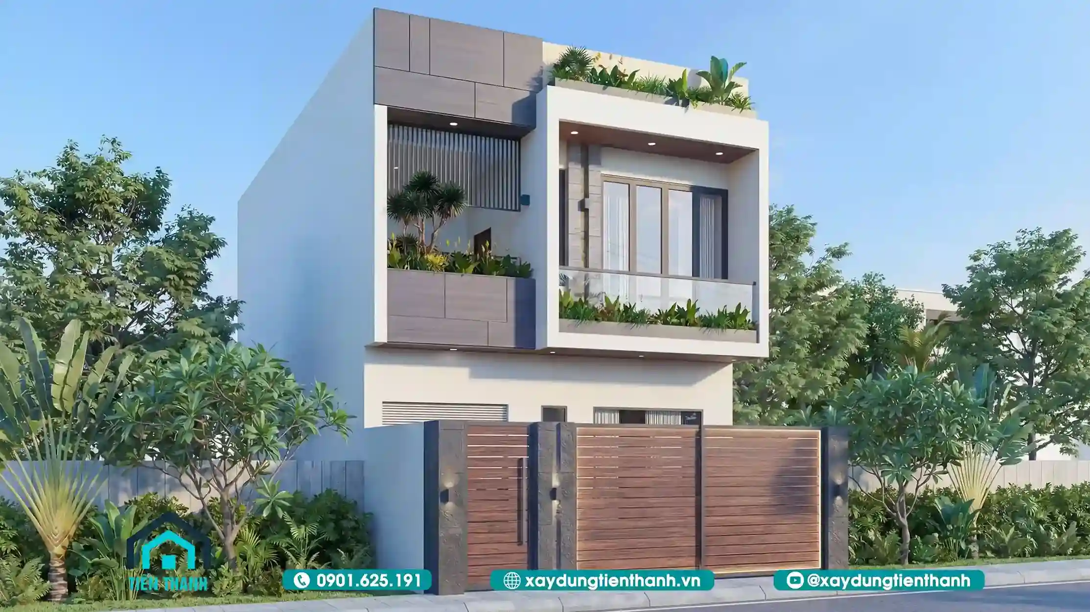 Nhà phố hai tầng hiện đại với mảng xanh ban công và ánh sáng đẹp.