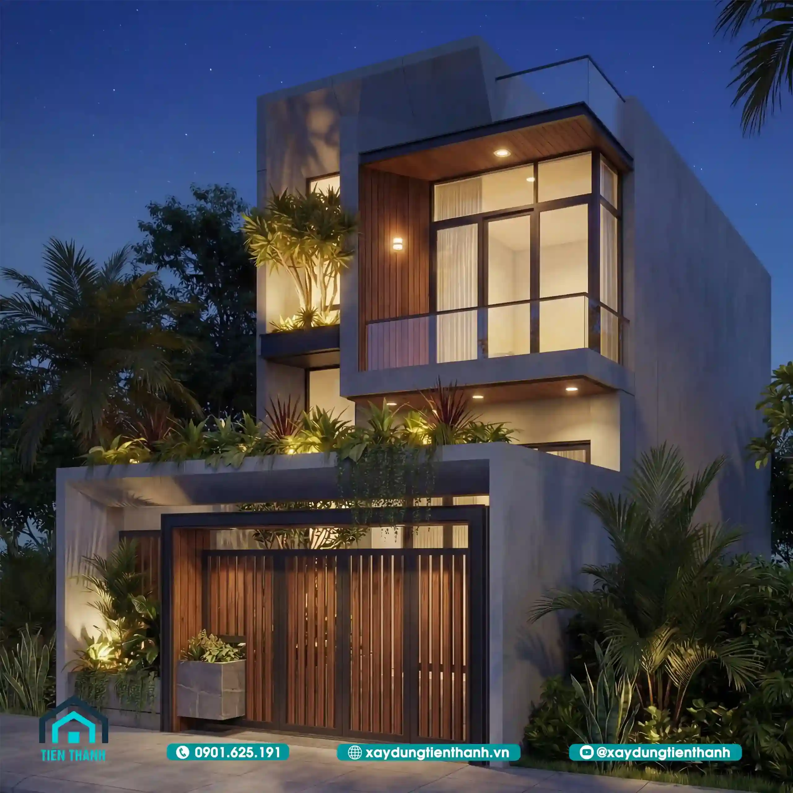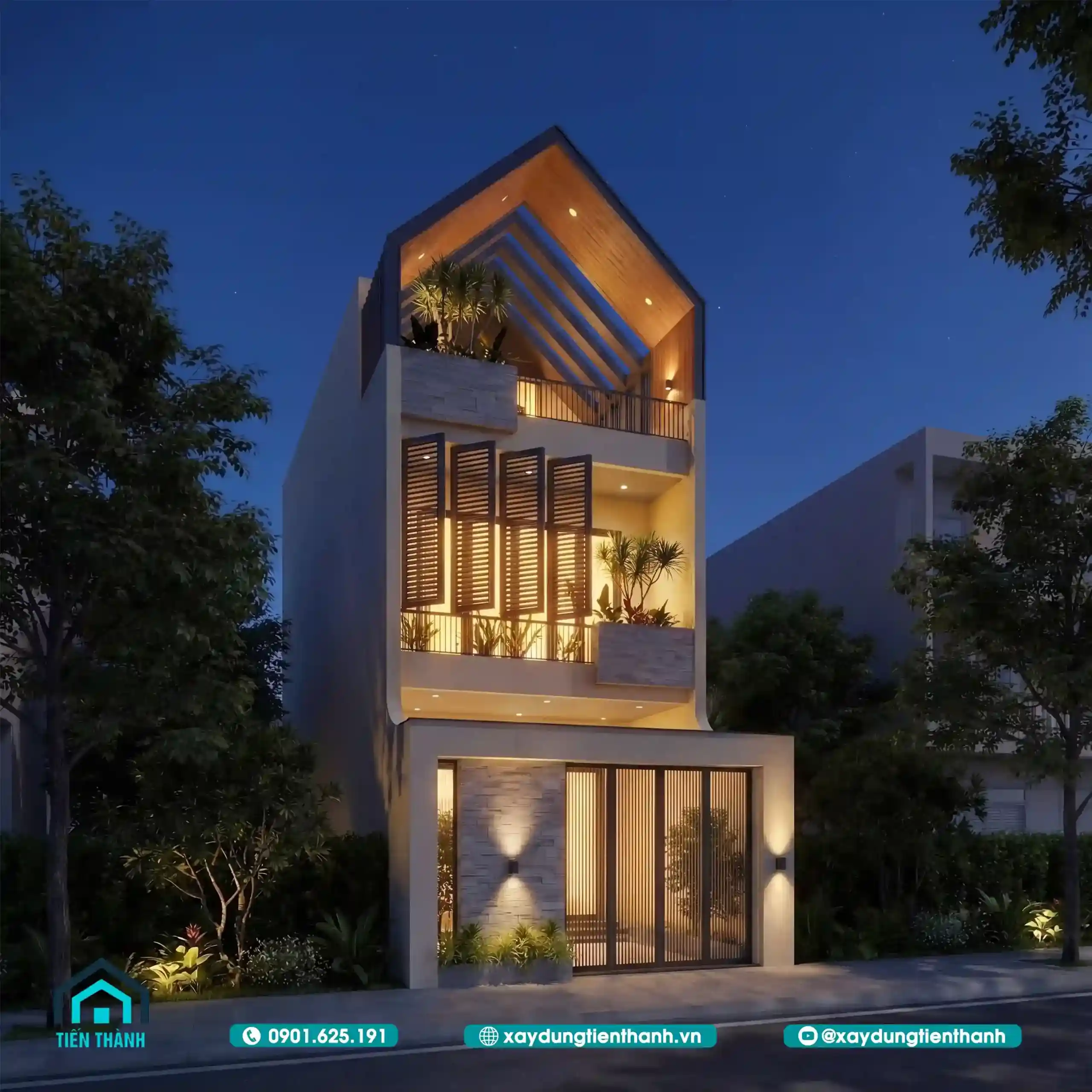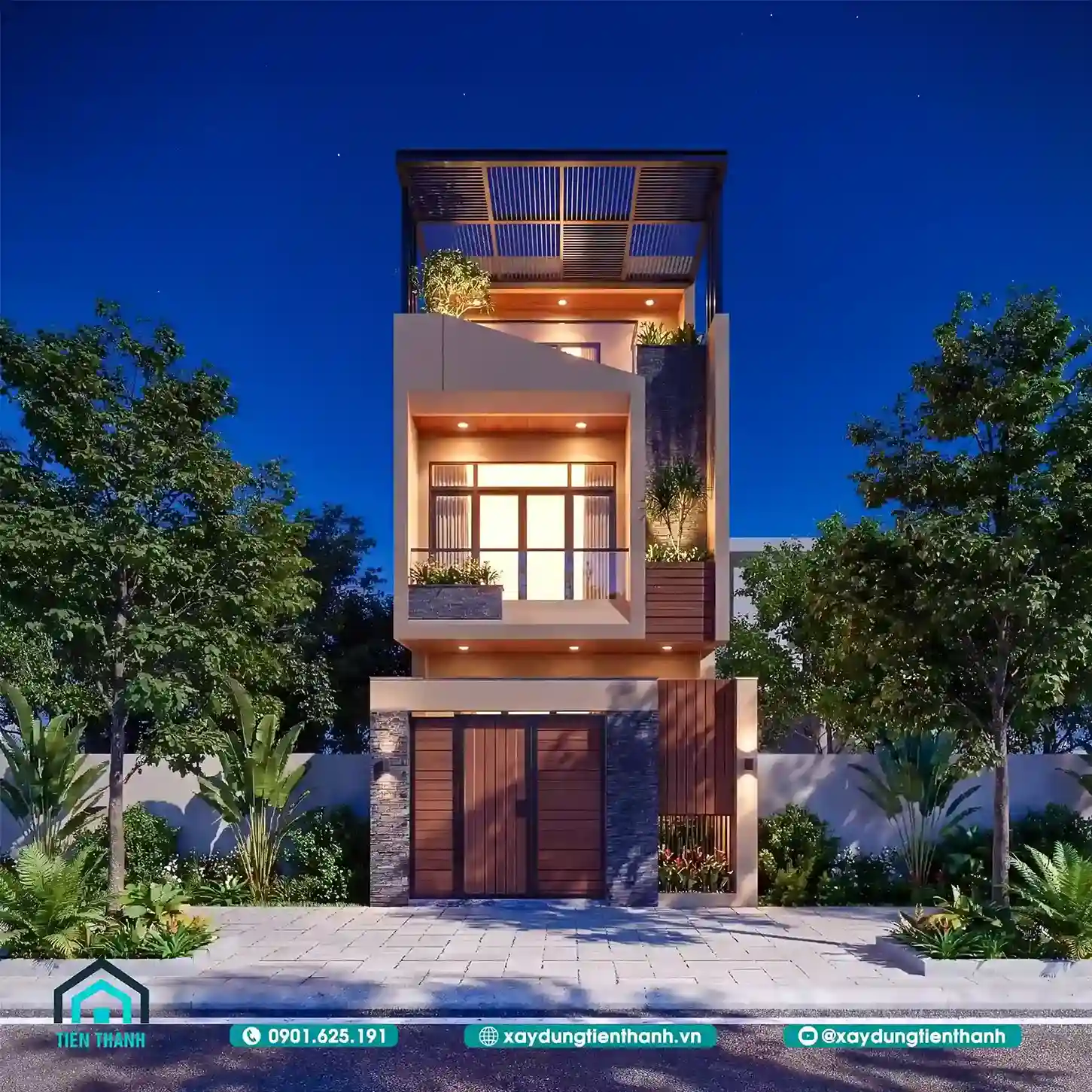 Nhà phố ba tầng cao ráo có sân thượng thoáng và ánh đèn vàng rực.