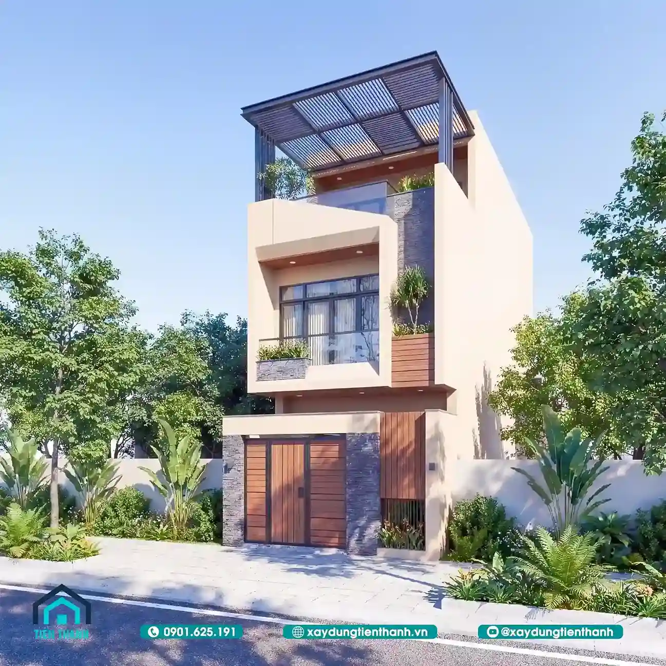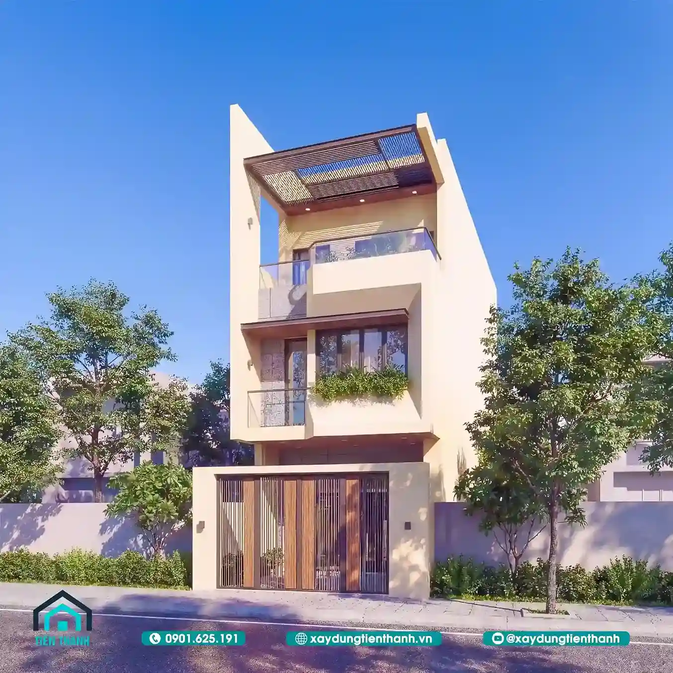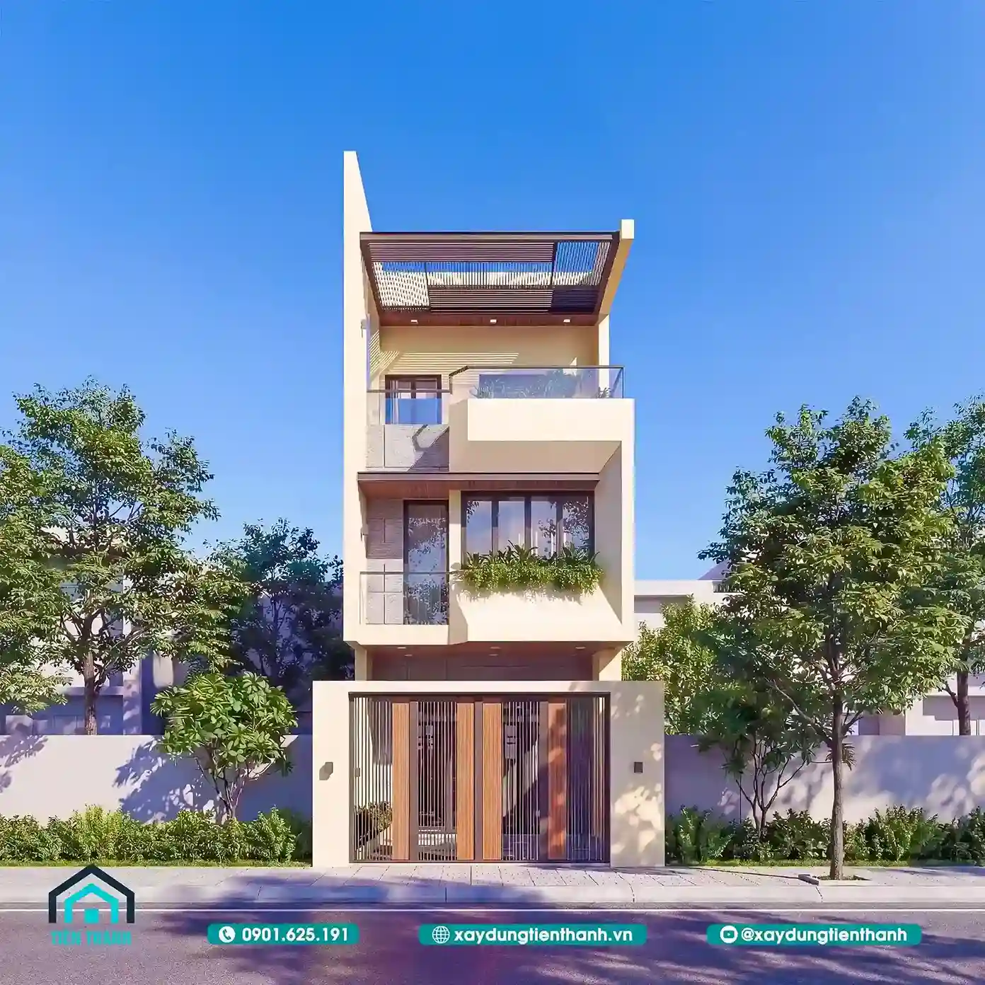 Nhà phố ba tầng hiện đại có mái che pergola và tông màu kem nhã.
