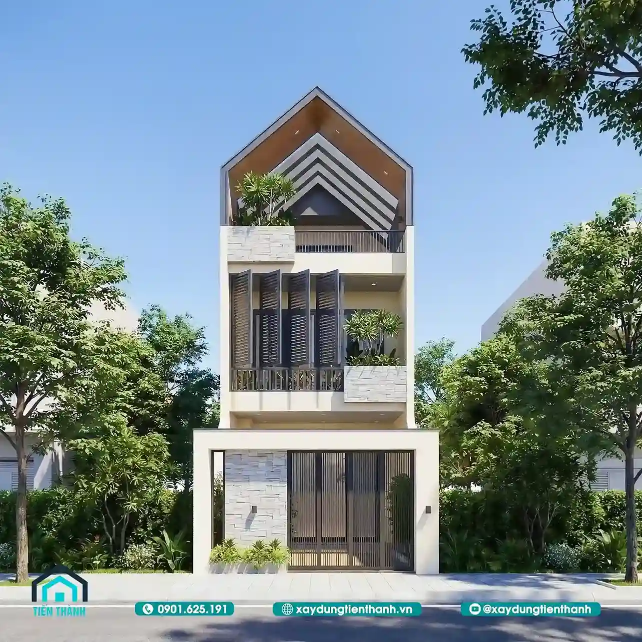 Nhà phố hẹp có mái nhọn độc đáo phối màu trắng và gỗ thanh lịch.