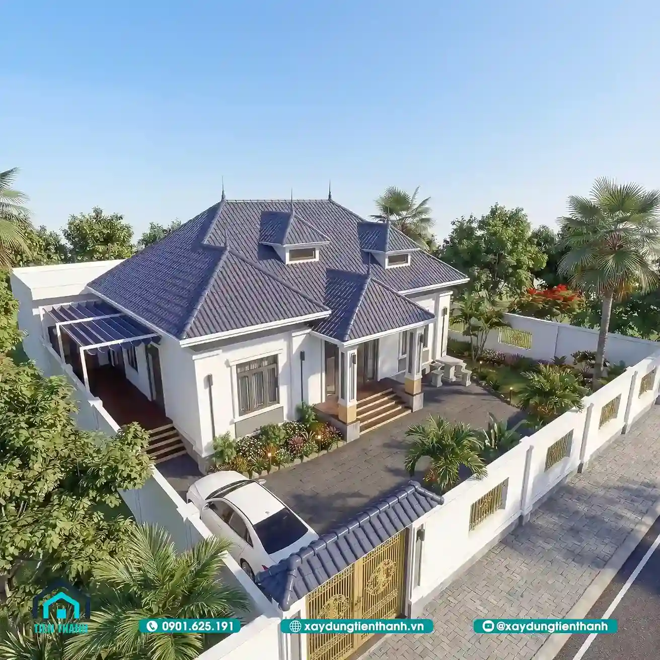 Nhà cấp bốn mái Nhật màu xanh dương, phong cách tân cổ điển sang trọng.