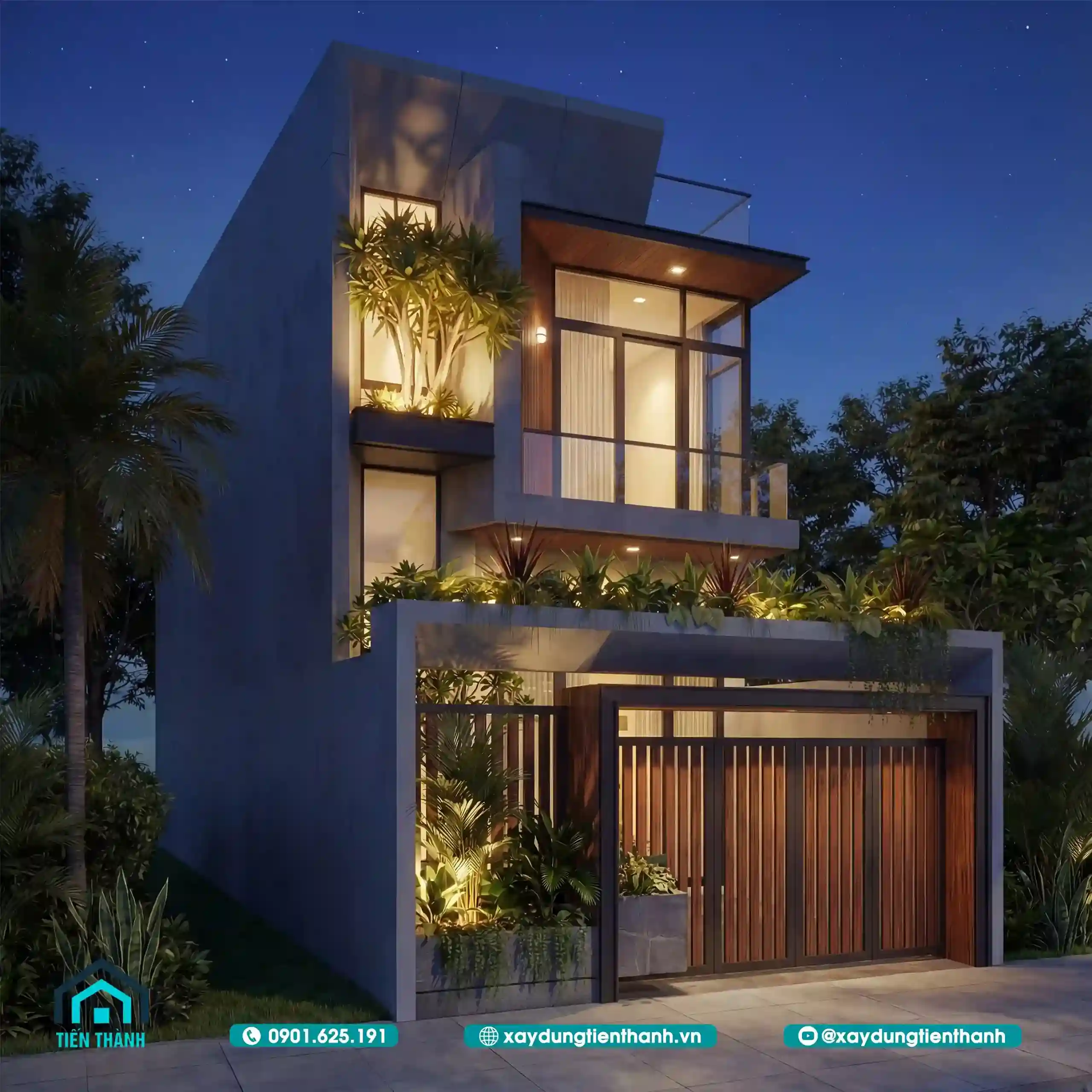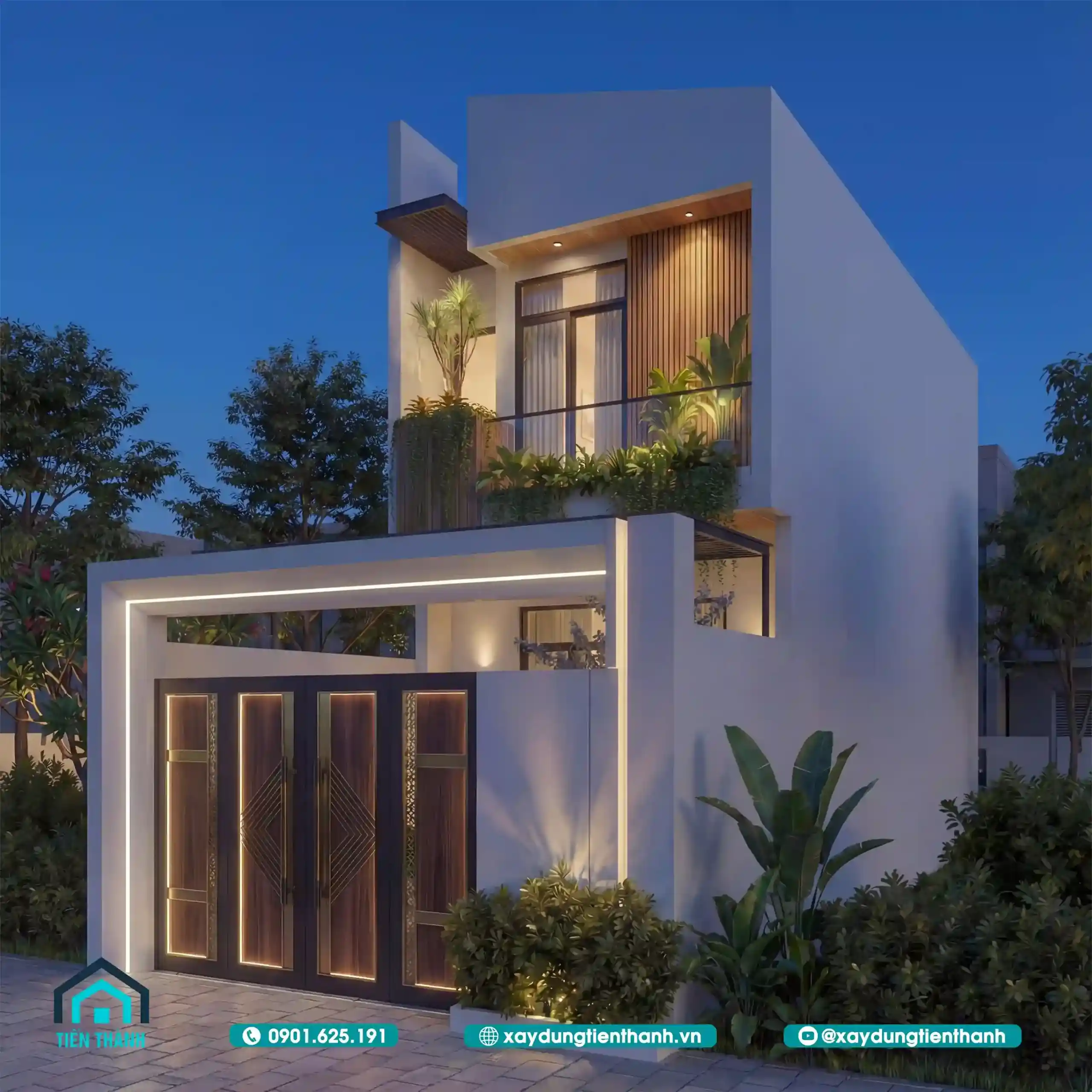 Thiết kế nhà phố hai tầng tối giản với cổng gỗ và đèn LED viền.
