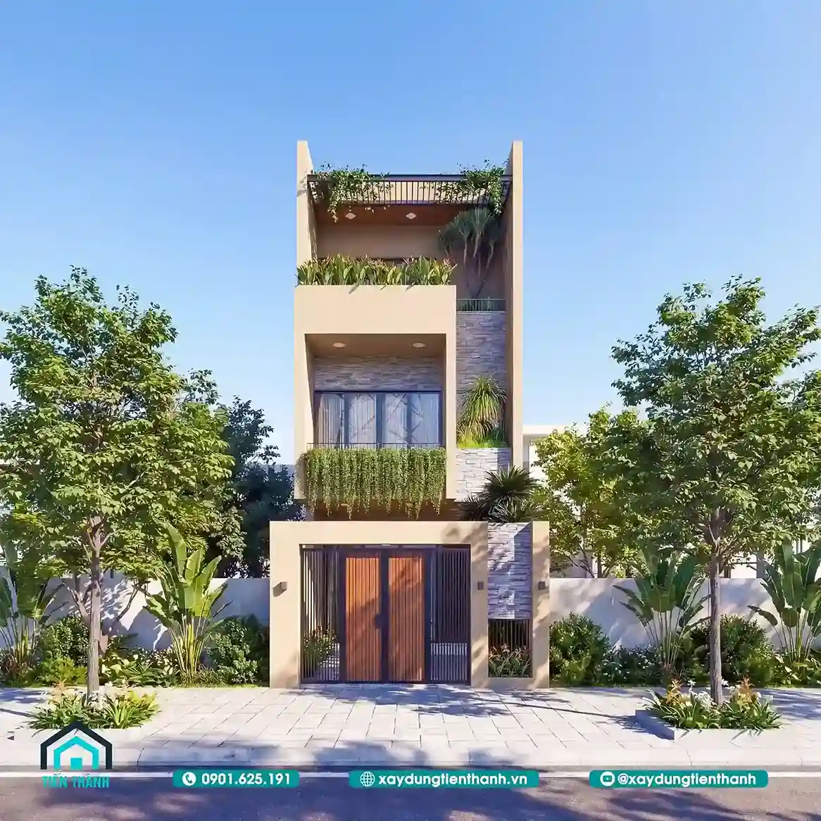 Mặt tiền nhà phố 3 tầng được trang trí bằng đá ốp và cây xanh tự nhiên.