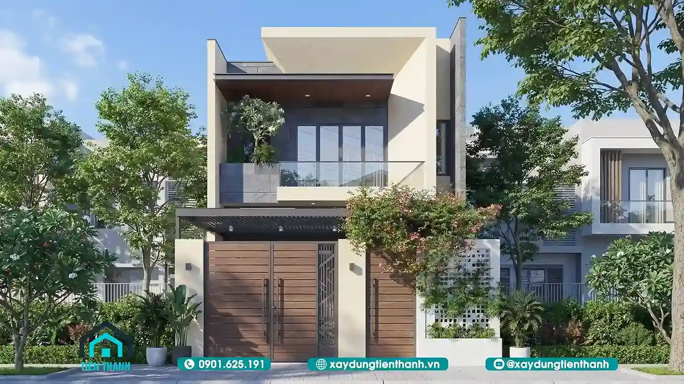 Mẫu nhà phố 2 tầng hiện đại với thiết kế cổng gỗ và cây xanh hài hòa.